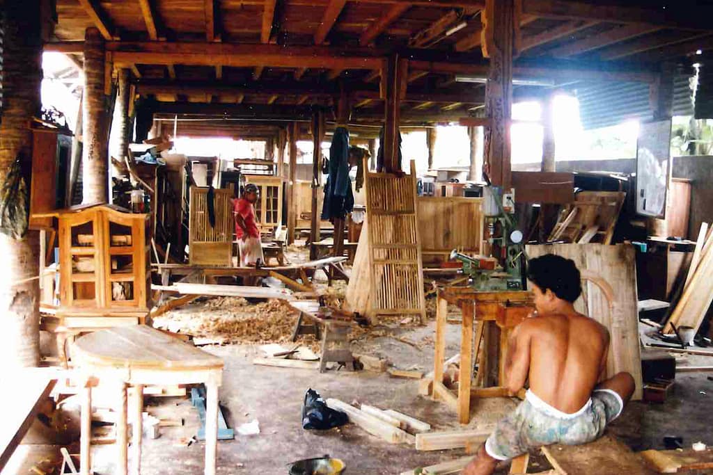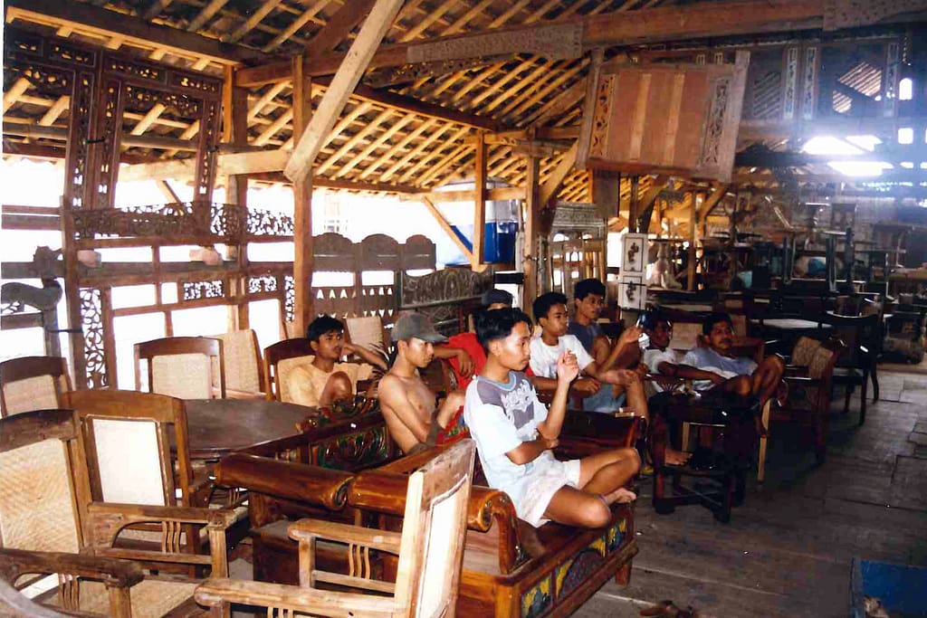Yogjakarta bezoeken we een teak houten meubelmakerij. Via een Nederlandse meubel importeerder, waar ik werkzaam ben op dit moment, komen we op uitnodiging hier terecht. We laten gelijk een vrachtwagen komen om onze aankopen naar Nederland te laten verschepen.