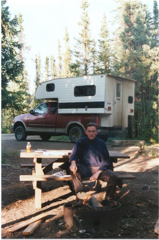 ons avontuur beginnen. De auto was even wennen en alles staat hier in mijlen aangegeven (1 mijl is ongeveer 1,7 kilometer). Anchorage verlaten in zuidelijke richting. Onze eerste maaltijd in de Pick-up klaargemaakt, maccaroni met gehakt en champignons!! Meteenonze conclusie over het “drinkwater” getrokken, dit is puur chloor, dus bij het eerste volgende “gasstation” (tankstation) meteen flessen water gekocht. Naar aanleiding van het zien van diverse “Bear Aware” borden, ook maar meteen een setje Bear Bells gekocht, dat zijn twee bellen die je aan rugzak kunt bevestigen tijdens wandelingen, dan horen de beren je al aankomen!! Crow Creek Mine bezocht, een oude goudmijn uit 1898, dit oude familiebedrijf is nu opengesteld voor toeristen, en dat zijn wij nu toch ook. Portage Glacier bezocht, jammer van de bewolking en de regen, zodat we de gletsjer niet goed konden zien, maar in Alaska zijn gletsjers genoeg!!! In het Visitor Center vast een CD met Alaska National Park geluiden gekocht, leuk voor achtergrond van de toekomstige videoband(en). Daarna nog een stuk richting Homer gereden en onze Pick-up op een gratis “campground” neer gepland. Hier was alleen een WC aanwezig, maar in deze prachtige omgeving, gelegen aan een mooi Lake (meer) hebben deze twee echt niet meer nodig. Dus onze eerste dag is ondanks het tijdverschil van tien uur (beide niet veel last van gehad) goed verlopen. Na wat napraten onze eerste “Pick-up Alaska Night” ingegaan.