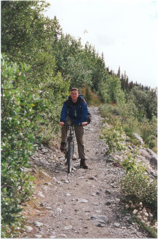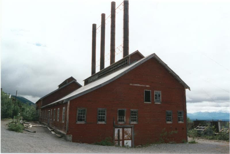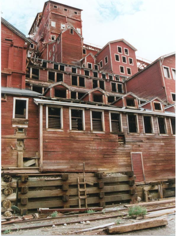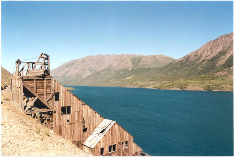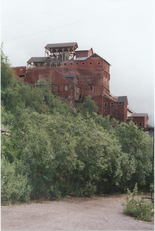 oude “mountain bike’s” te huren en ons per fiets te verplaatsen naar de oude kopermijn van Kennicott. We kunnen de rivier oversteken d.m.v. een brug, die enkele jaren terug geheel was weggespoeld door het gletsjer water maar gelukkig weer is opgebouwd. Enkele jaren terug moest men deze oversteek maken d.m.v. een kabelbaantje. Op naar Kennicott, wat nog een aardige beklimming blijkt te zijn, dus we komen goed bezweet aan in Kennicott. We doen eerst een welverdiend blikje drinken bij de Glacier Lodge aldaar. We gaan eens een kijkje