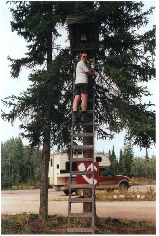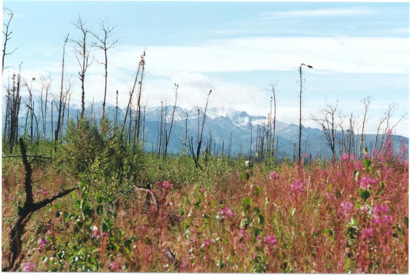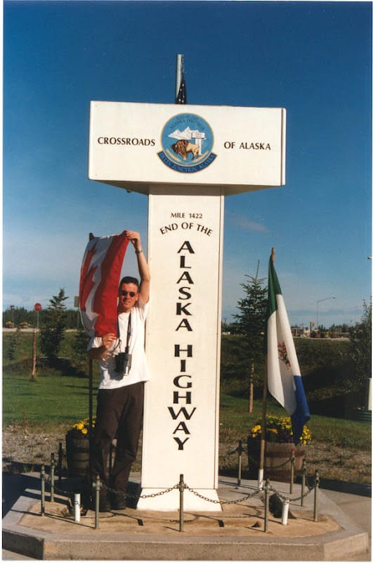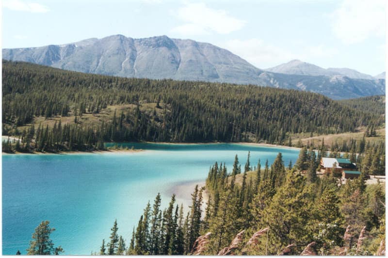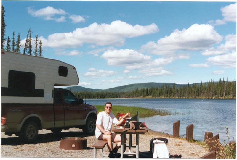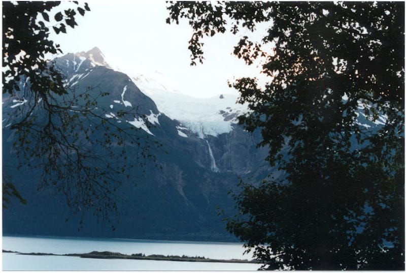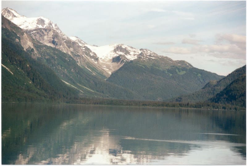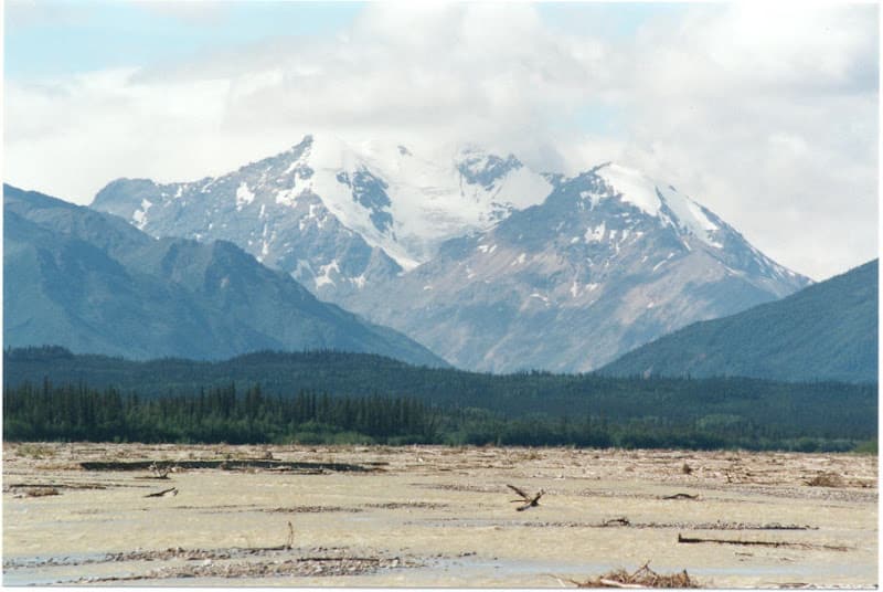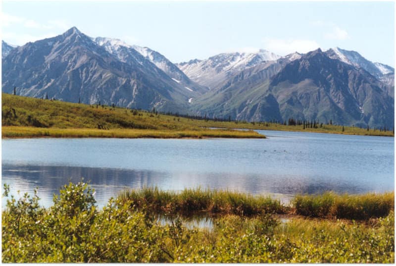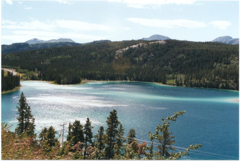 8 augustus: Het eerste werk is vandaag weer gewoon ontbijten. We gaan de Chilkoot Lake / River weer verlaten en leveren onze gehuurde hengel weer in. Het vissen hier is zeer heftig, als we nog eens terug gaan dan nemen we zeker een hengel mee vanuit Nederland. We gaan nog even wat traveller cheques inwisselen, daarna tanken en de watertank nog even bijvullen, dan op naar Haines Junction. De weg naar Haines Junction is heftig, alleen het weer zit vandaag niet erg mee dus krijgen we van deze heftige panorama’s niet erg veel mee. We mogen overigens over het weer zeker niet klagen, dus dat doen we dan ook niet. Ze zeggen wel eens “slecht weer bestaat niet, alleen slechte kleding”, dus we zijn daar goed op voorbereid en anders waren we wel naar Spanje gegaan. We passeren op deze weg de grens van Canada weer, dus we moeten de klok weer èèn uur vooruit zetten. We eten deze middag Chili Concarne met rijst. We brengen nog een bezoek aan de Million Dollar Falls, dit is een mooie waterval, waar we op de nabij gelegen camping nog wat kampvuur hout wegjatten om de komende dagen nog wat te stoken en zo de muggen op afstand te houden. In Haines Junction aangekomen eerst het Visitor Center opgezocht en weer getankt want van die tank was weer goed gedronken vanaf Haines. We gaan Haines Junction weer verlaten en rijden langs het Kluane National Park af, waar we nog een bruine beer langs de weg wat besjes zagen eten en waar wij de enige twee toeschouwers waren. We hebben ondanks de vele muggenbeten (want die zaten er genoeg) weer een zeer heftig stuk film bij. Daarna langs een meer de Pick-up