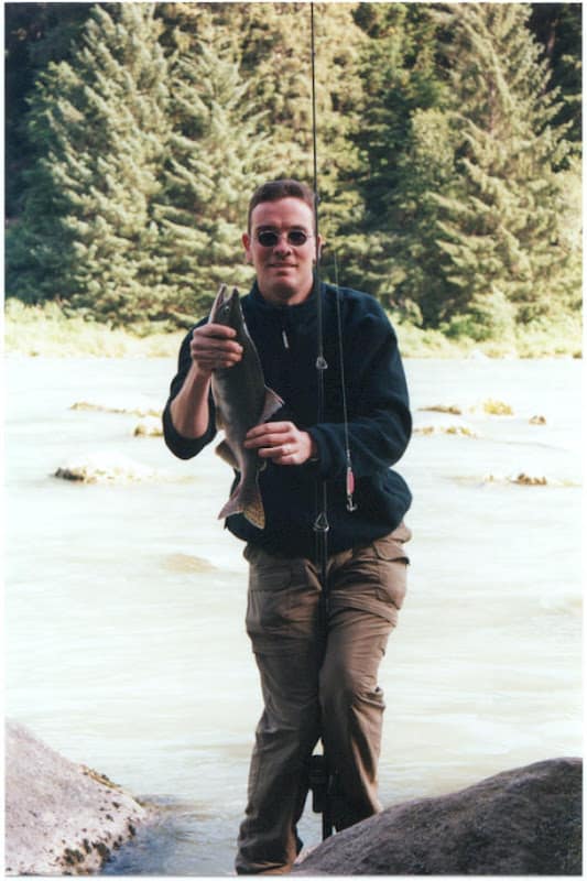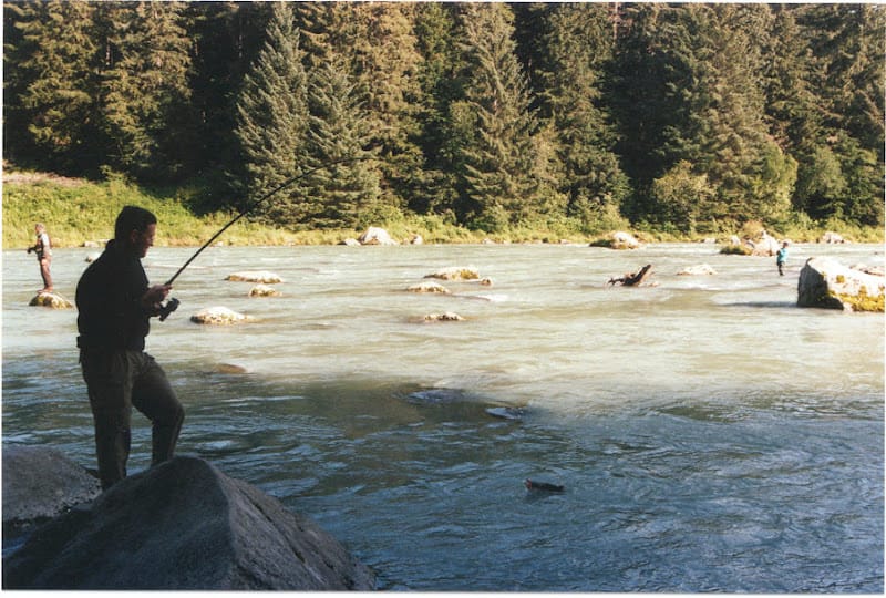 visspullen. Dus weer terug naar Chilkoot Lake, waar we binnen een half uur al twee keer vast zaten met onze gehuurde hengel, dus geen haken meer, dus weer terug naar de sportzaak van Haines. We besluiten daarna bij de Chilkoot River te gaan vissen, er worden diverse prachtige zalmen boven water getoverd, die op een koudbuffet niet zouden misstaan. Na het eten trekken we nog enkele mooie zalmen boven water, en zo is deze middag ook weer aan z’n eind gekomen. Het avondeten is een vluggertje want we moeten ons weer klaar maken voor de beren. Na het vluggertje nog even een Bald Eagle, die een vis zat op te snoepen, aan de andere kant van de rivier gefilmd. Na weer het nodige op en neer rijden (zelfde ritueel als gisteren) krijgen we een vrij jonge Grizzly Bear in het vizier. Hij loopt rustig langs de