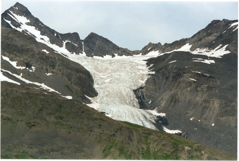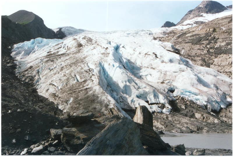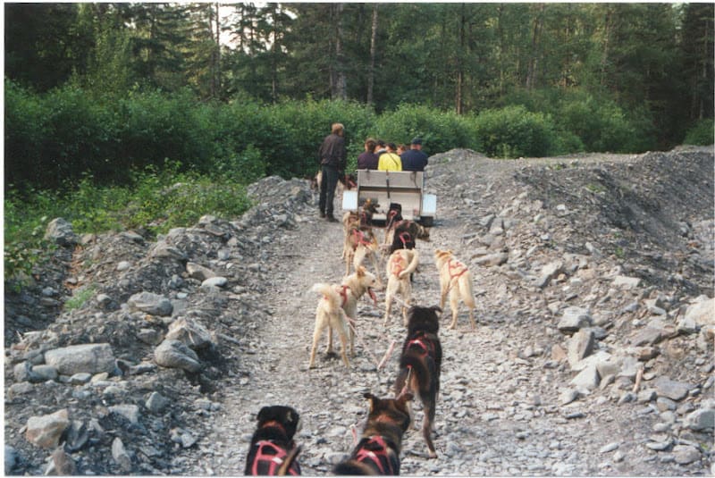 duren!! Daarna kregen we uitleg over hoe die hondenslede wedstrijden in de winter in z’n werk gingen, en hoe de honden werden verzorgd tijdens zo’n wedstrijd. Toen mochten we even bij de puppies verblijven. Nog even Seward in en daar bij een internet zaak even ons eerste e-mailtje naar huis gestuurd.Toen gingen we het zuiden verlaten, we gaan terug naar Anchorage. Inmiddels knippert er van alles op het dashboard, maar nog geen “gasstation”, we stoppen bij een klein visitor center nabij “Portage Glacier”, nog tien mijl (+/- 17 Kilometer), naar