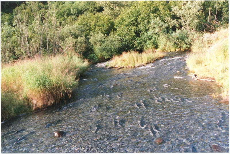 rondom Valdez vol zit met beren. Dus weer snel op pad om te kijken of er van deze beren iets te zien. We rijden over een wazige brug (Helma stapt uit, als Ruud verdrinkt kan ik toekijken!!) de Mineral Creek Road op, deze zeer smalle en slechte weg lijdt ons the middle of nowhere in. We zien enkele mooie watervallen en uitzichten, beneden in de rivier zullen ongetwijfeld beren verschijnen, maar de kans dat we die vanaf hier zien is klein, dus we besluiten de andere kant van Valdez op te zoeken. We rijden langs de zee en steken diverse riviertjes over waar grote massa’s met zalmen aanwezig zijn, duizenden, zoveel vis bij elkaar hebben we nog nooit gezien, onvoorstelbaar!!! We zien nog een zwarte beer die trachte wat vis te gaan vangen, maar er waren meer beertoeristen op de been en zo werd deze zwarte beer verjagen door het krijsen van een kindje. Daarna nog wat rondgereden, maar zonder succes. Een ding is zeker er moeten hier veel beren leven, want er is vis genoeg. We fotograferen nog de mooie zonsondergang in Valdez en gaan dan de Pick-up parkeren om te slapen, het