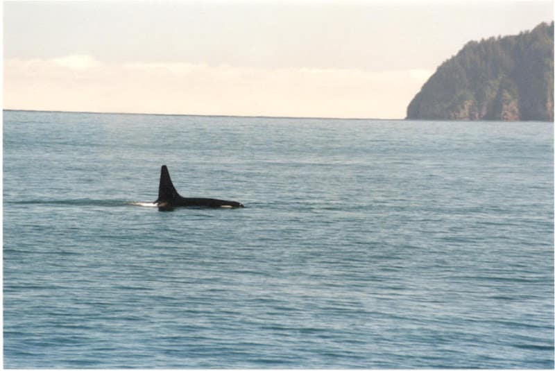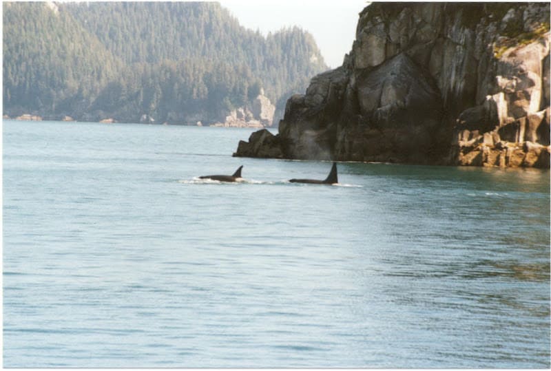 25 juli: 05.00 uur wakker en…. Die zwarte beer zit langs de camper, dit is echt niet te geloven, dus meteen mijn slaapgenoot, de videocamera gepakt, Prachtig!! De beer vertrekt weer, dus wij gaan ons klaarmaken voor een dagje zee. We worden met een bus op een P-plaats net buiten het centrumpje van Seward opgehaald, we kunnen hier ons vehicle achter laten. Daar gaan we dan, op zoek naar het leven in en langs de Kenai Fjords. De omgeving is hier onbeschrijfelijk mooi, het weer is weer goed, geen bewolking, maar op zee is het toch ijskoud (t-shirt/fleecetrui/gore-tex jas/muts/handschoenen is geen overbodige luxe). We beginnen met een prachtige “Bald Eagle” (zee arend), daarna twee rustig liggende “Sea Otters” (zee otters), mooi!! Na diverse prachtige uitzichten van o.a. Bear Glacier te hebben vastgelegd verteld onze schipper dat er een familie Orca’s in zicht is, wij staan op scherp. We komen nader, dit echt ongelooflijk mooi, die beesten zo met z’n allen rond de boot zwemmend. Het is moeilijk vast te leggen op foto en film ook vanwege het schommelen van de boot, maar dat is op