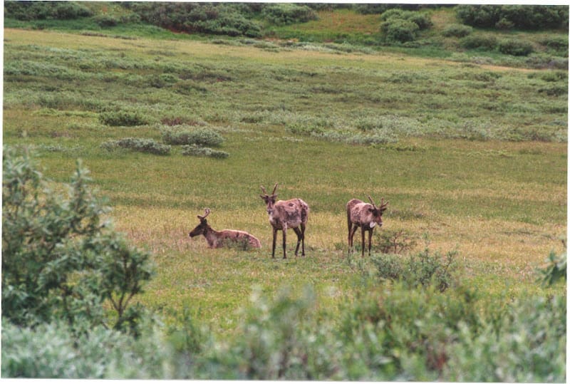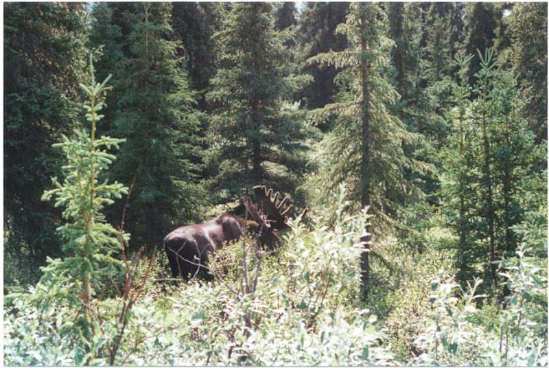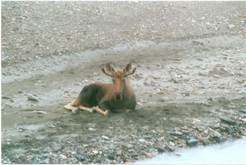 enkele Caribou’s rond wandelen door dit prachtige Denali Park. Enkele miles verder zien we, op afstand, weer een mooie Grizzly wandelen, deze is wat lichter van kleur, volgens onze chauffeur is dit de zomer kleur van een Grizzly beer. Weer zien we enkele Caribou’s en plotseling zien we nog een paar Moose langs een rivier de bossen in schieten, maar zodra de chauffeur weer wil gaan rijden wordt er meteen STOP geroepen “a big one” zegt iemand, en ja hoor, deze Moose is echt groot met een gigantisch gewei op zijn hoofd, prachtig (zo’n mooie zullen we nadien dus niet meer zien). En zo komt er een eind aan een mooie, prachtige en geweldige, maar ook vermoeiende dag. Dus buiten het park eerst wat happen, friet met hamburger en kip-sticks, lekker!! Nog een klein stukje gereden en Pick-up op een P-plaats langs de weg richting Fairbanks geparkeerd en lekker geslapen.