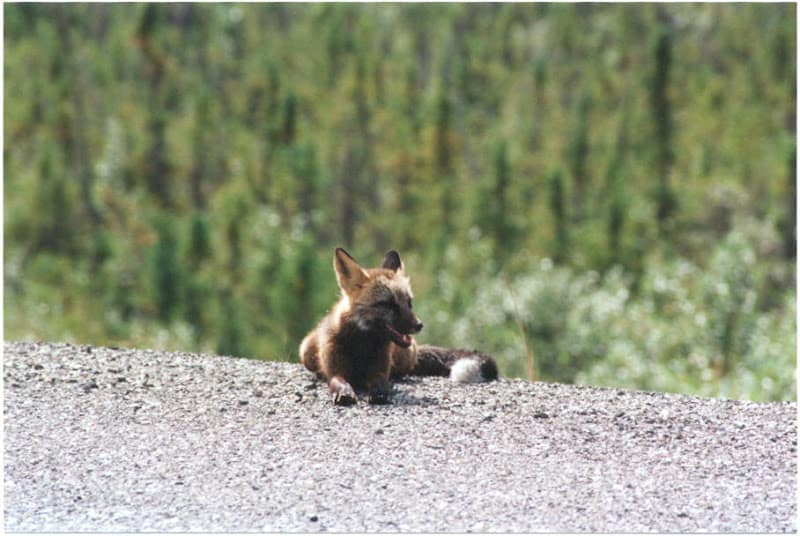 de bergen verstopt omdat ze van de kou houden. Door middel van een extreem heftige verrekijker, proberen we de Dall Sheeps te ontdekken maar we kunnen er geen vinden, ze verblijven waarschijnlijk aan de andere kant van de berg. Onderweg zien we nog een mooie Coyote (wolf) lopen en we maken bij Burnwash Landing nog even een stop een goudzoekerspannetje van ongeveer vijf meter doorsnede op de foto te zetten. We rijden weer verder en plotseling zien we een zeer klein jong zwart beertje langs de weg staan, helaas stoppen er nog meer mensen waardoor het beertje vertrekt en helaas niet meer terug komt. Waarschijnlijk zal moeder beer wel kort op de loer gelegen hebben, wat het behoorlijk gevaarlijk maakt om in zo’n situatie uit te stappen, niet doen dus!!! Dit was overigens de dertiende beer die we tot nu toe hebben gezien. Richting Beaver Creek zien we nog een mooie Vos die om zijn gemak voor ons, langs de auto poseerde. Hiervan hebben we enkele zeer heftige foto’s!!! Bij aankomst in Beaver Creek even het Visitor Center opgezocht en even rondgekeken in dit rustige plaatsje, we drinken nog even koffie met cake erbij in een oud ingericht cafeetje. We rijden nu weer Alaska binnen, dus we moeten de klokken weer èèn uurtje terug zetten. Wat een gedoe allemaal met het passeren van die grenzen, gelukkig is dit tussen Nederland en België niet het geval!!! We maken een stop bij het Tetlin National Wildlife Refuge, waar we op het Viewing Deck nog even met de daar opgestelde verrekijkers het Wildlife Refuge in hebben gekeken. In het Visitor Center van het Wildlife Refuge nog een mooi boek over Grizzly Bears gekocht en met de mensen daar nog wat over onze belevenissen gepraat, we laten ze tevens wat fragmentjes van onze video zien, we hebben de afgelopen weken al meer gezien als vele mensen uit Alaska zelf vertelde ze ons, “You guys been very lucky”. We proberen nog even een trail te lopen, maar we zakken in dit moerassige gebied al snel diep weg, dus we breken onze goede bedoelingen maar af. We vinden een gratis camping, aan een mooi meer, waar we hamburgers eten en een mooi kampvuur maken. We hadden toch nog gejat hout in de auto liggen, maar dit vuur zorgt er in ieder geval voor dat we mugvrij zitten. We zien prachtige zonsondergang bij het meer, waarna er enkele jagers opduiken die op een bootje jagen op vogels, dit is minder leuk aangezien die gasten behoorlijk dronken overkwamen. Wij gaan in ieder maar weer eens lekker slapen.