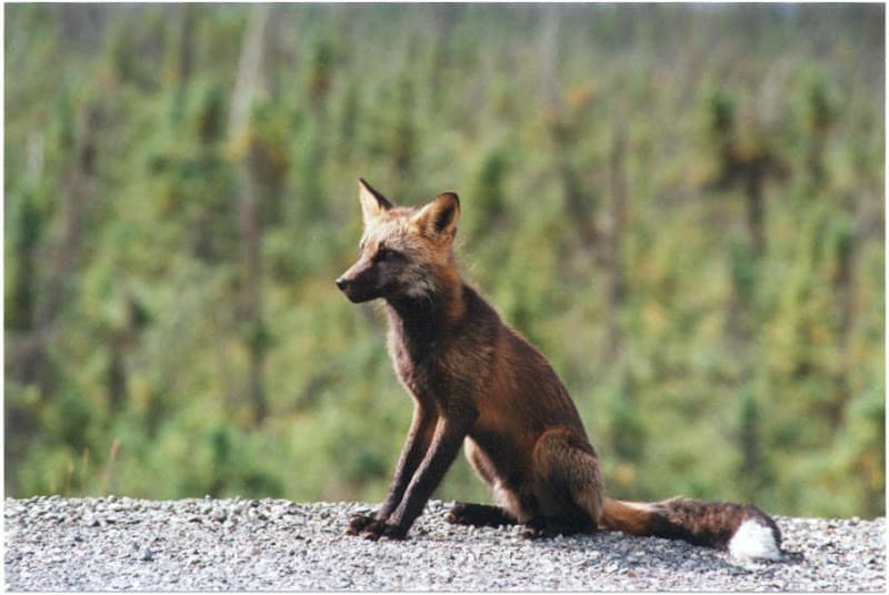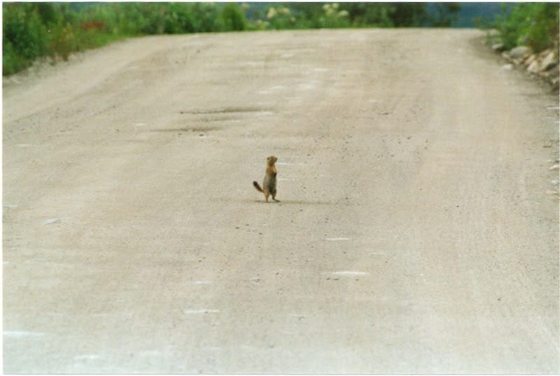 leiden naar Rome, gaat hier niet op!!). Op de heen weg had het Wild Life ons in de steek gelaten, maar vandaag begint de dag goed, al snel zien we een mooie Red Fox lopen, daarna stonden er plotseling twee Arctic Ground Squirrels voor de wagen, even remmen dus. Tot overmaat van ramp stond er toen ook nog een mooie zwarte beer langs de kant van de weg, die helemaal geen haast maakte om weg te komen, vonden wij uiteraard geen probleem. Bij de Yukon River weer getankt en een bakkie gedaan, bij een of ander wazig tentje (overigens het enige daar, dus we hadden weinig keus). Na deze zeeeeeer lange Dalton Highway dus, zoals we gisteren hadden besloten, aangelegd bij die truckstop voor een omelet met zes eieren per persoon, het mag duidelijk zijn dat wij weer afgeladen vol zaten, het resterende wordt ons aangeboden om mee te nemen, we doen dit niet, overigens is het in Alaska heel gewoon als je het resterende eten in een eetgelegenheid mee naar huis neemt. Na deze vulling, gaan we weer terug naar Fairbanks, waar we ons lekker hebben ontdaan van ons stof (opgedaan op de Dalton Highway), tevens doen we even onze was in een Laundry & Showers. Tijdens het wachten op de droger, gaan we om hoek even onze e-mail checken en mailen we maar meteen weer even naar huis toe. Daarna nog even naar de supermarkt en de bank, tijdens het tanken wast Helma weer meteen de ramen van de Pick-up, wat na de stofzooi van de afgelopen twee dagen, geen overbodige luxe is. We gaan maar weer eens op zoek naar een rustig gelegen slaapplaats, zien nog net even een Moose langs de weg staan te eten en vinden zo richting Delta Junction een plaatsje, mooi gelegen langs een gletsjer rivier. We eten vanavond alleen maar soep met pudding want onze buiken zitten nog ram vol van die omelets bij die truckstop. We spelen nog enkele spelletjes, we kunnen vanwege de muggen toch niet naar buiten. Wel te rusten!!