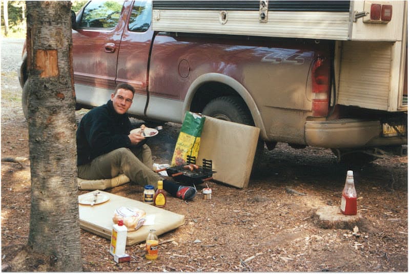 verder te komen. Dus we wagen de sprong over het diepen, het is een enkel baanse spoorweg overgang zonder vangrails en hij hangt over een diepe kloof heen!! Even na deze brug besluiten we dat het welletjes is geweest voor vandaag, dus we parkeren de Pick-up en zetten de barbeque op. We maken de uit Valdez afkomstige spare ribs en vis klaar. Werd onze barbeque vorige keer nog gestoord door de hevige wind, ditmaal moeten we naar binnen verhuizen vanwege de regen. Niet getreurd we hebben weer lekker gegeten. We doen nog enkele vakantie