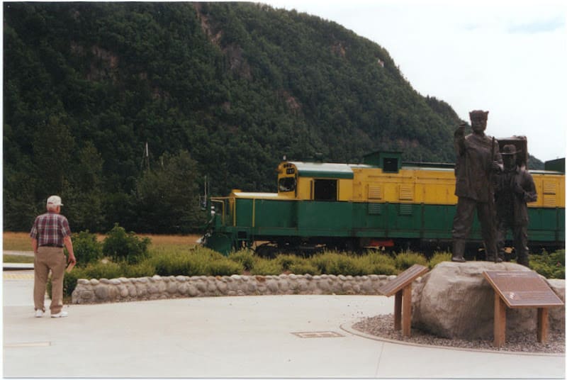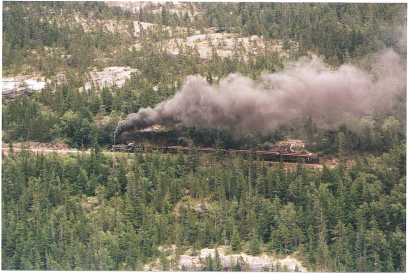 5 augustus: We vertrekken, na het ontbijt in de heftige kou. De wind heeft ons iets ander weer gebracht, lange broek en dikke fleece trui zijn deze morgen geen overbodige luxe, ook daar zijn we op voorbereid. We rijden via een maanlandschap weer richting Alaska, waar we op diverse plaatsen door de zeer laag hangende bewolking moeten rijden (zicht minder dan 5 meter). We bereiken de grens van Alaska weer, waar we een mooie stempel van de kolentrein van Skagway in ons paspoort krijgen. We zien enkele mooie watervallen naar beneden kletteren. Plotseling zien we een trein over de White Pass Trail rollen, aan de andere kant van het dal, mooie gezicht vanuit deze locatie maar er schijnt nog een oude kolentrein te rijden. We rijden weer aan, maar we moeten er snel weer uit want er komt een gigantische rookpluim in beeld vanaf de White Pass Trail, en yes daar komt die oude kolentrein aan. Dus weer filmen en fotograferen, we waren dus op de juiste tijd op de juiste plaats!! We arriveren in Skagway, alwaar we eerst kaartjes gaan halen voor de Ferry naar Haines die om 16.15 uur