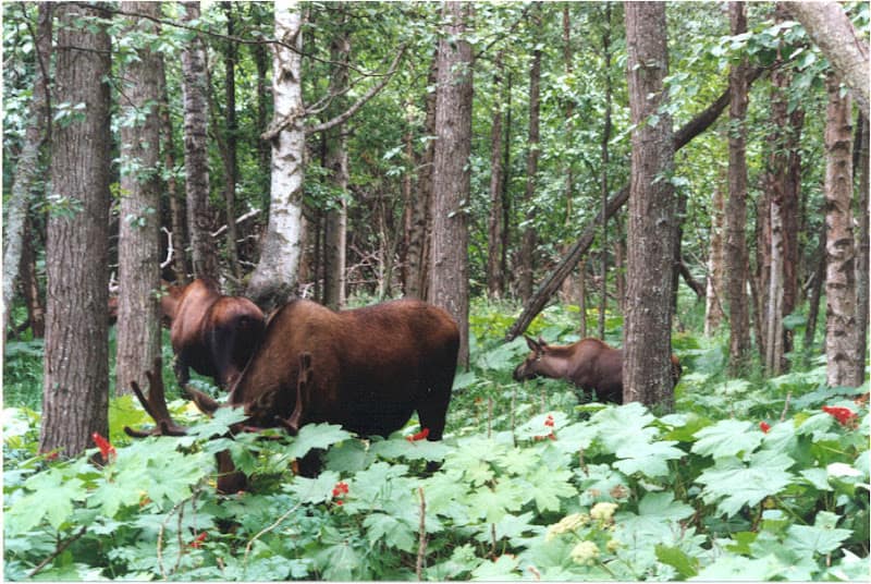 verliep nog al snel. We laten ons door de eigenaar van het verhuurbedrijf bij de fietsen verhuur afzetten, zodat we meteen door kunnen met ons dagprogramma. Eerst even omkleden bij onze B&B, daarna even een Hot Dog happen bij een kraampje langs de weg. Op naar de Coastal Trail, wat van het begin af aan eigenlijk een hele mooie fietsroute blijkt te zijn, het advies van Margriet was goed dus!! We fietsen aan de achterzijde van het vliegveld door, waar we nog even wat grote jongens de lucht in zien schieten, wij mogen morgen weer!! We rijden een bosgebied in net buiten Anchorage, waar we plotseling oog in oog staan met een Moose familie (Pa, Ma en twee kids), ze zijn aan het eten en hebben gelukkig geen oog voor ons terwijl we toch op een paar meter afstand van de dieren staan. Ze voelen zich kennelijk