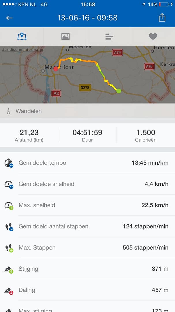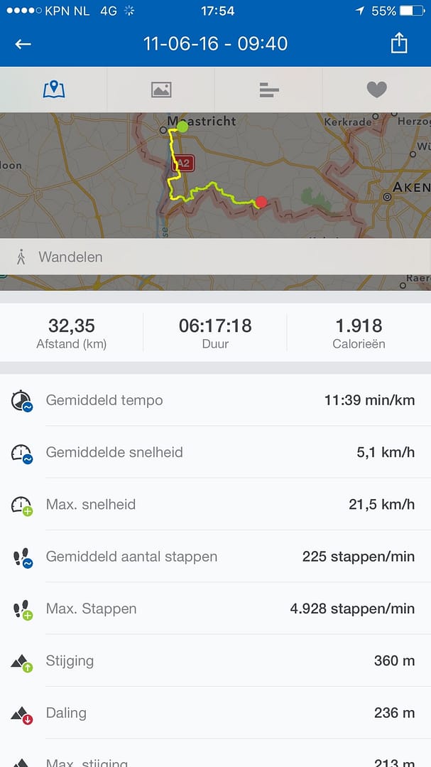 En omdat we nog steeds in Limburg (Valkenburg) zijn, mag het nog! Limburgsevlaai in Valkenburg, even opdrogen! Na drie uur door de regen, ook nog eens dik verdiend! We vervolgen de route, redelijk droog richting Maastricht. Nog zo’n 12 km en dan zijn we er. De laatste loodjes wegen het zwaarst, yep das waar…….. Na ruim 18 uur wandelen zien we onze auto weer staan.