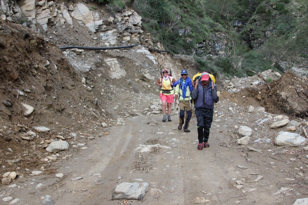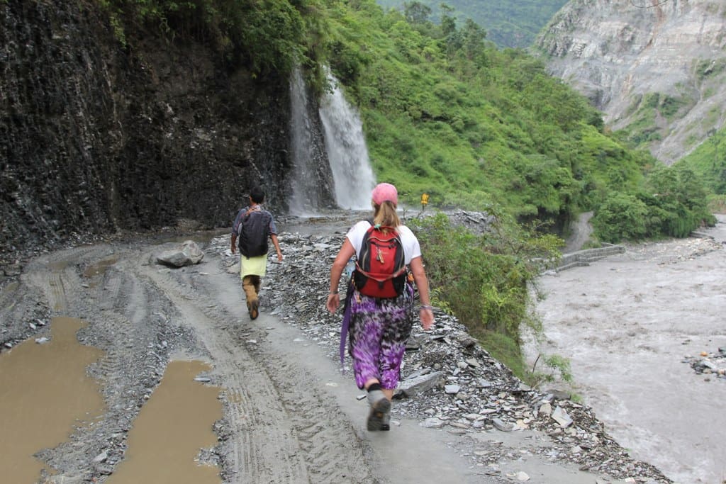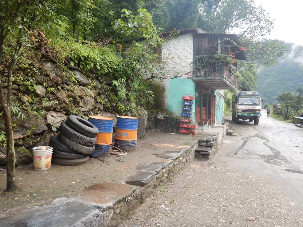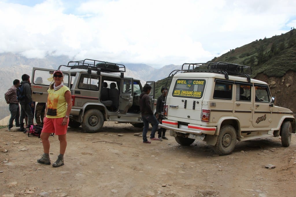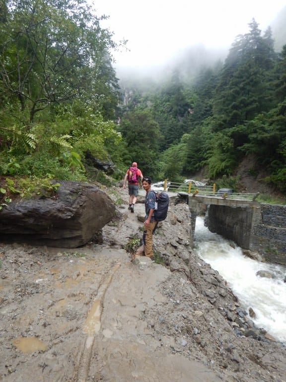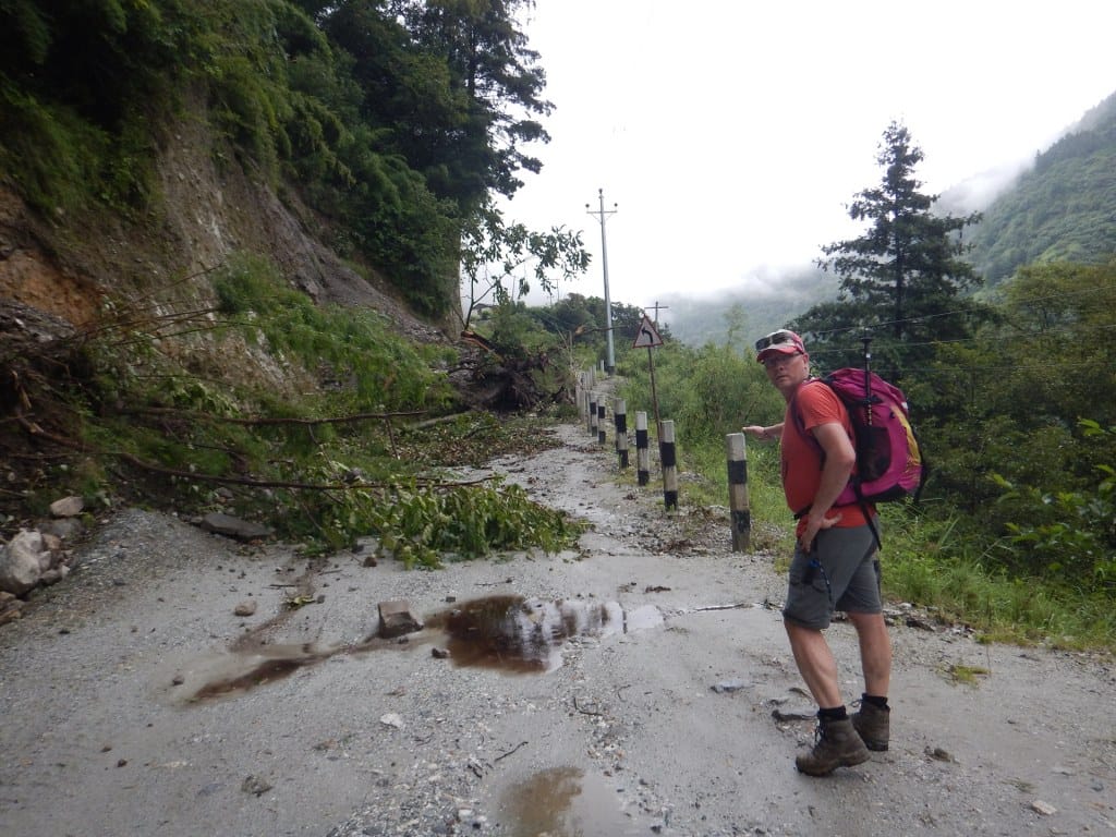 We vervolgen de weg tot een eindje voor Samer, daar moeten we er uit en een eindje (+/- 30 min) lopen. Landslides, dus wandelen en aan de andere zijde weer met een Jeep verder, deze staat al netjes klaar voor ons.