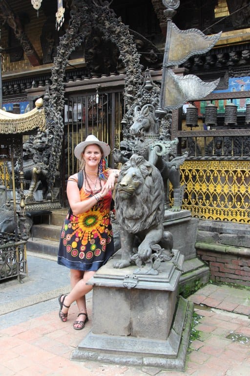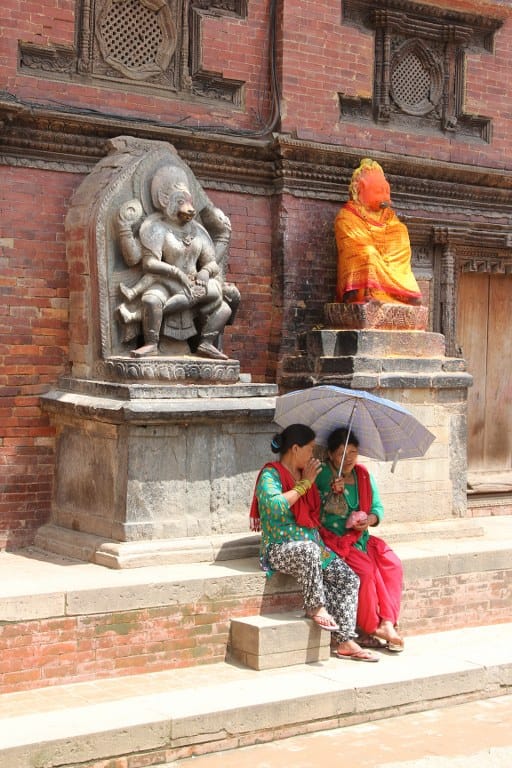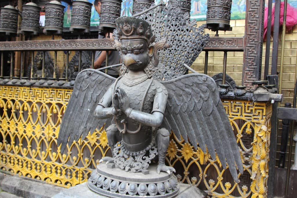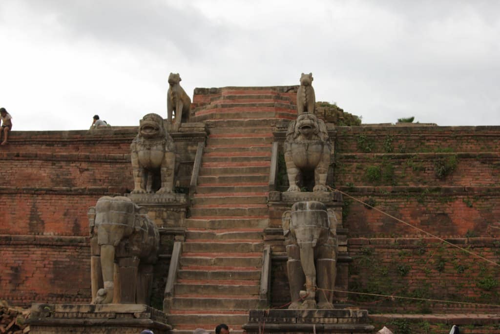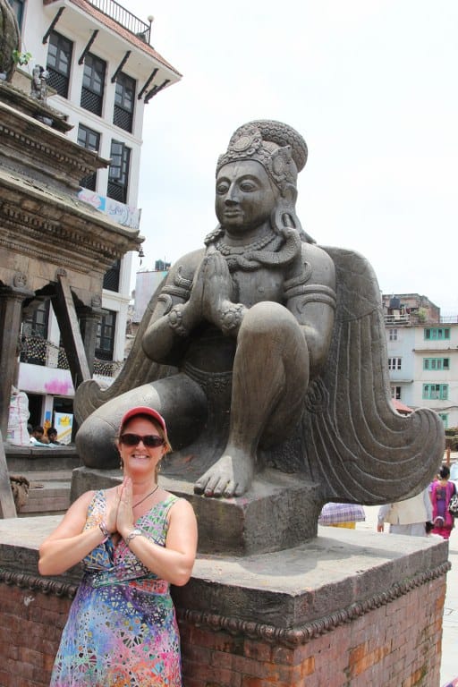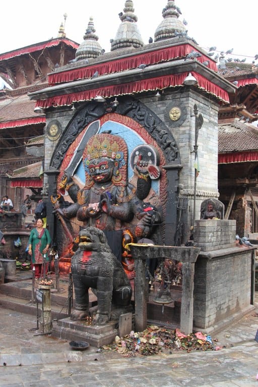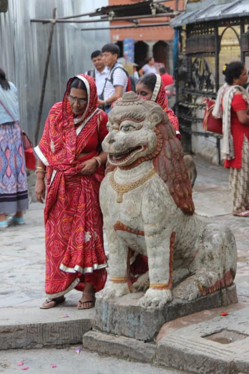 ’s Middags bezoeken we Patan, koningsstad me een koninklijk paleis en prachtige tempels. Op de UNESCO lijst, nummer 121. Patan is the center of fine art and Buddhist and Hindu culture. Het Durbar-plein van Patan is een Durbar-plein in het Nepalese Patan. Op het plein waren indrukwekkende voorbeelden van de Newah-architectuur en kunst van de Malla-dynastie te bewonderen. De Krishna Mandir is de belangrijkste tempel, andere tempels zijn de Bhimsen-tempel, de Vishwanath-tempel en de Taleju Bhawani tempel. Het paleis heeft drie binnenpleinen, Mul Chowk, Sundari Chowk en Keshav Narayan Chowk. Narshigha is het linkse beeld en heeft iemand gedood en haalt uit zijn buik het slechte karma, om in het volgende leven met een goed karma terug te keren. Rechtse is Hanuman “the king of the monkey” is de zevende reïncarnatie of Bishnu. Deze staat voor een goed karma. Daarom is hij gekleurd door het eren. Hanuman, ook bekend als Njaneya, Mahavira en Bajrangbali, is een vurige aanhanger van de god Rama.