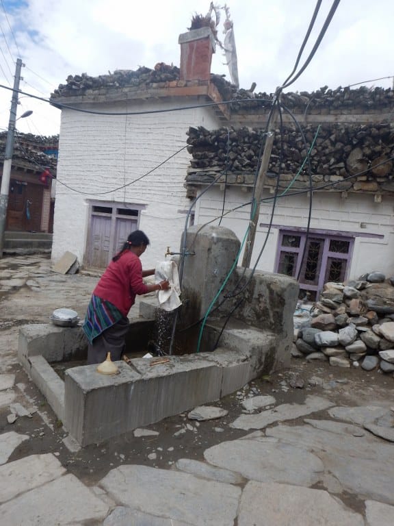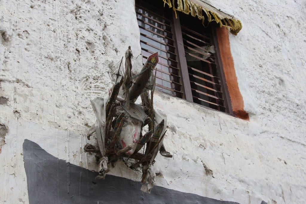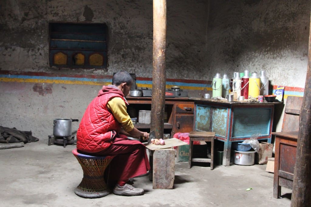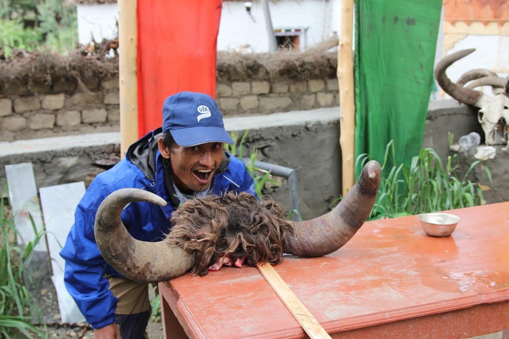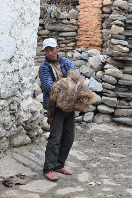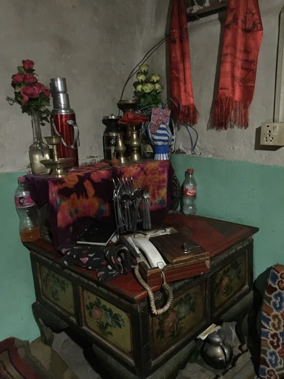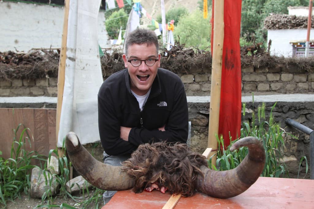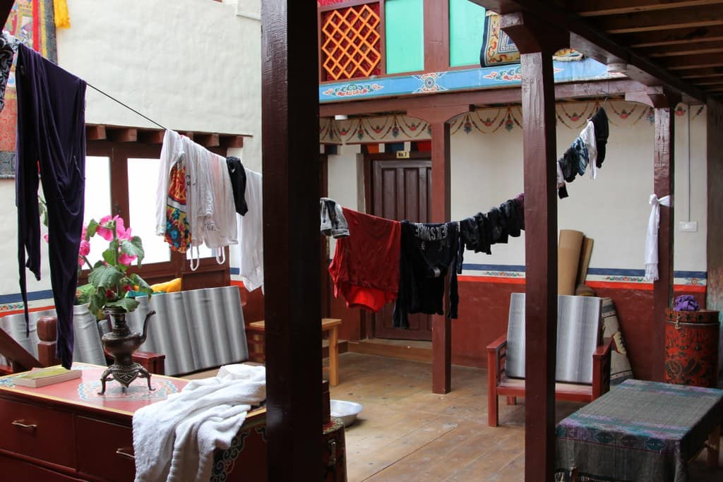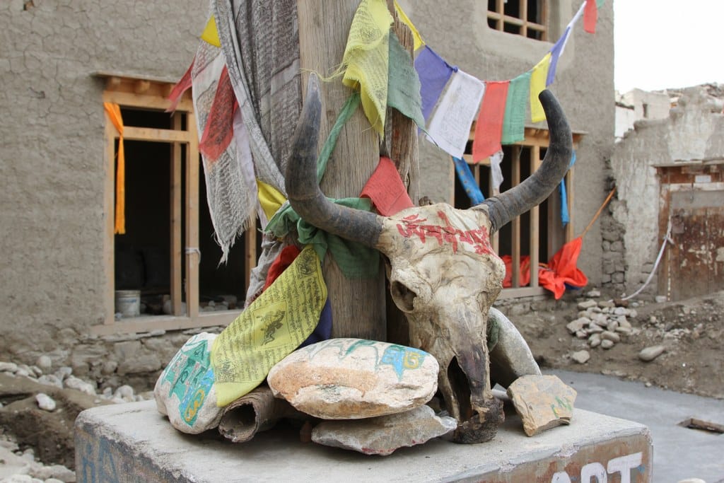 Erg bijzonder, toen we terug kwamen bij ons hotel lag de Yak schedel voor de deur, waar het bloed nog uitliep. Toen we naar de overkant liepen om te eten, waren ze de Yak schedel aan het ontharen. In het boeddhisme worden dieren geofferd maar niet in de tempel, in het Hindoeïsme doen ze dat wel. Tegenover ons hotel is een wasplaats, voor alles wat je maar wilt wassen. Het oude gedeelte van ons hotel is een oud klooster, een enkele monnik leeft daar nog en voorafgaand aan ons eten zien we hem de mantra zingen en bespelen. Wederom bijzonder.