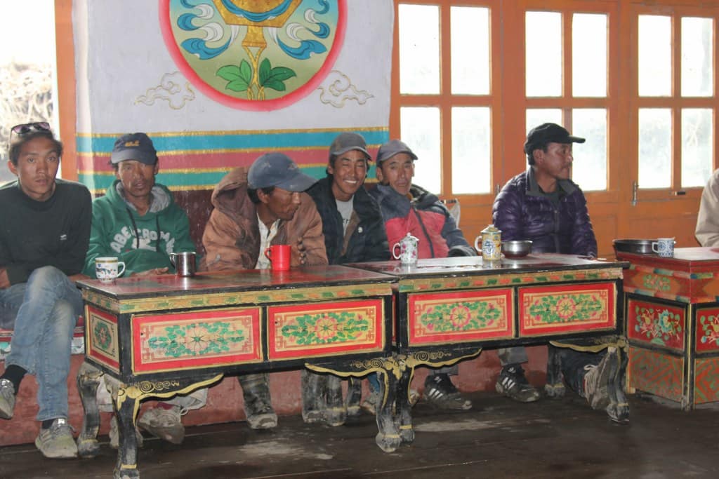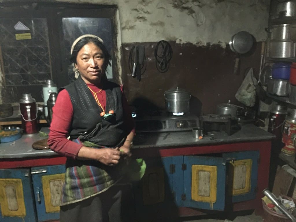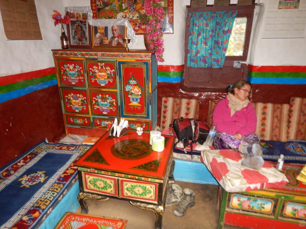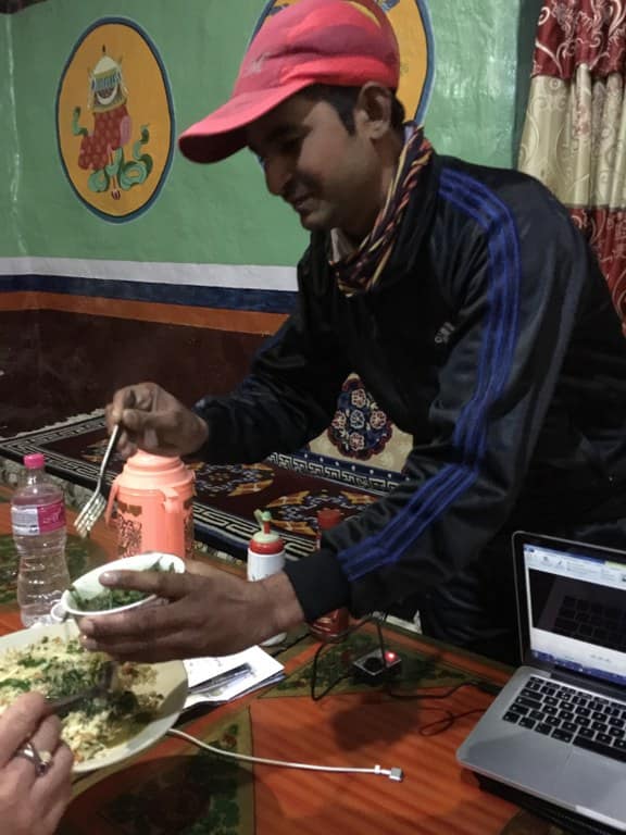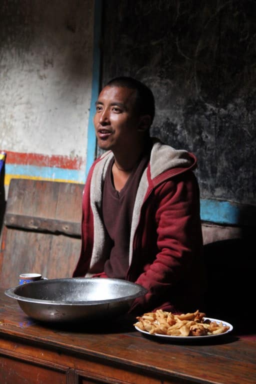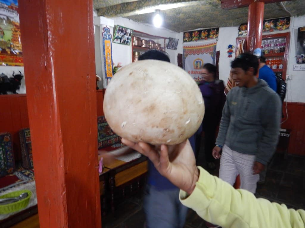 We lunchen (dik verdiend) in Samer, nadat we de eerste top van 3500 meter hebben bereikt. Doordat de lucht ijler wordt, is de ademhaling strakker en heftiger, soms een beetje duizeligheid. Dus die lunch gaat er wel in, heerlijk genieten van Tibetaans brood. Binod heeft nog een klein champignonnetje.