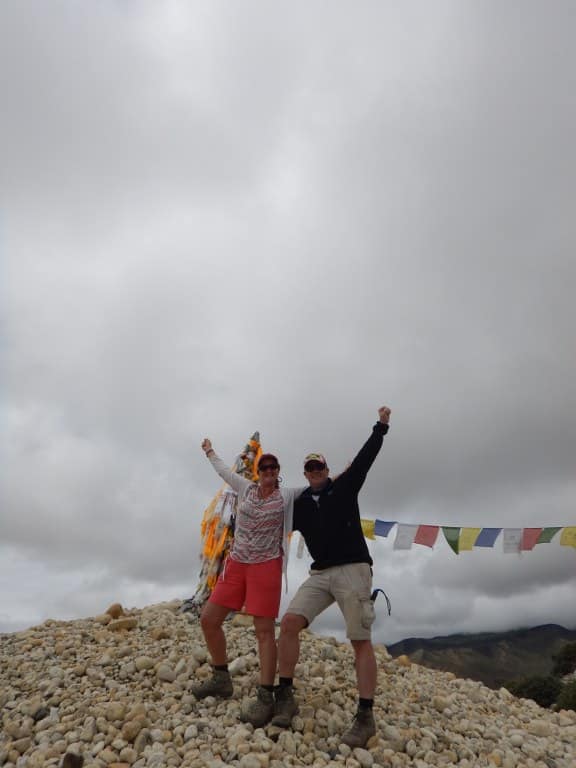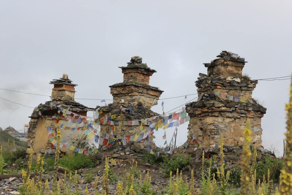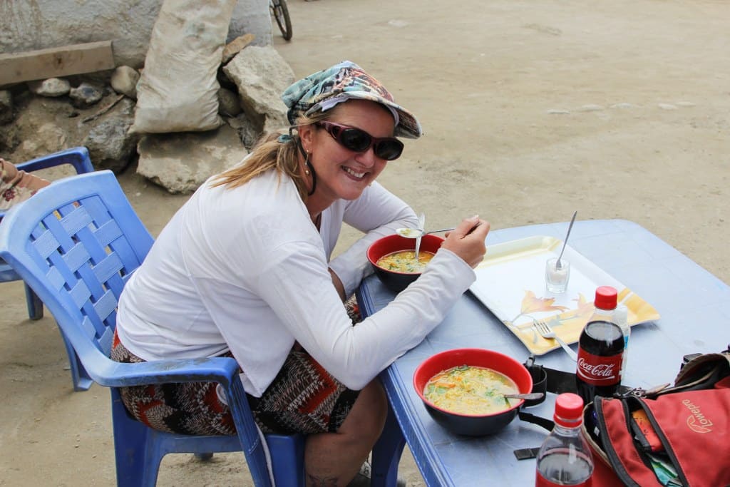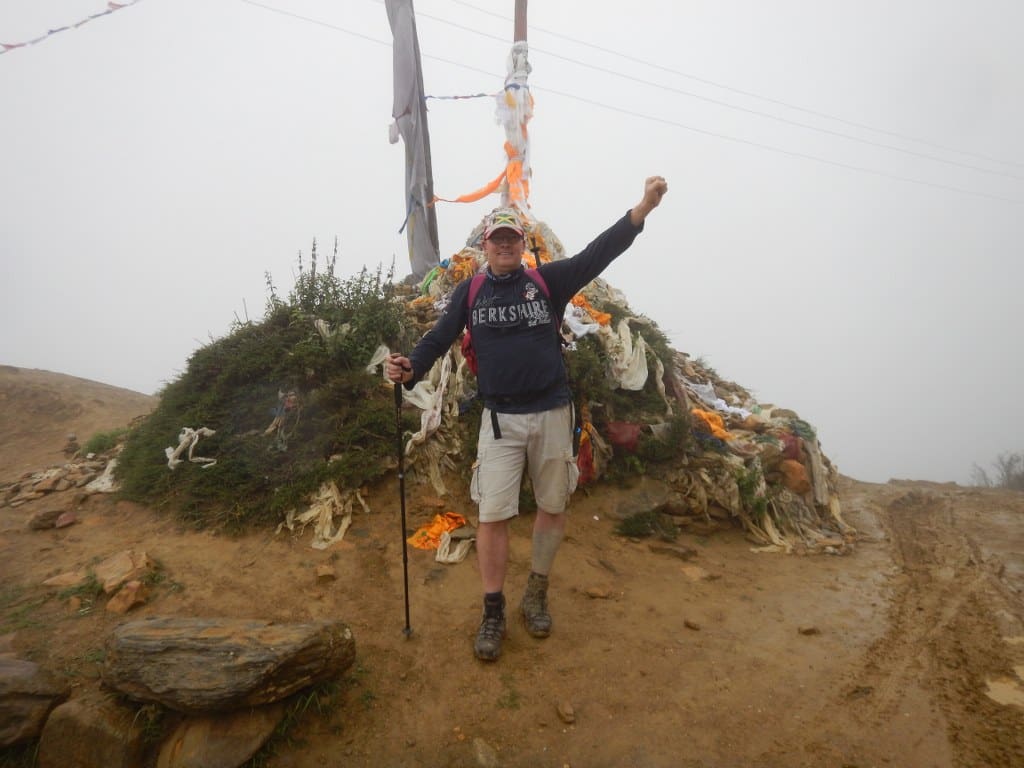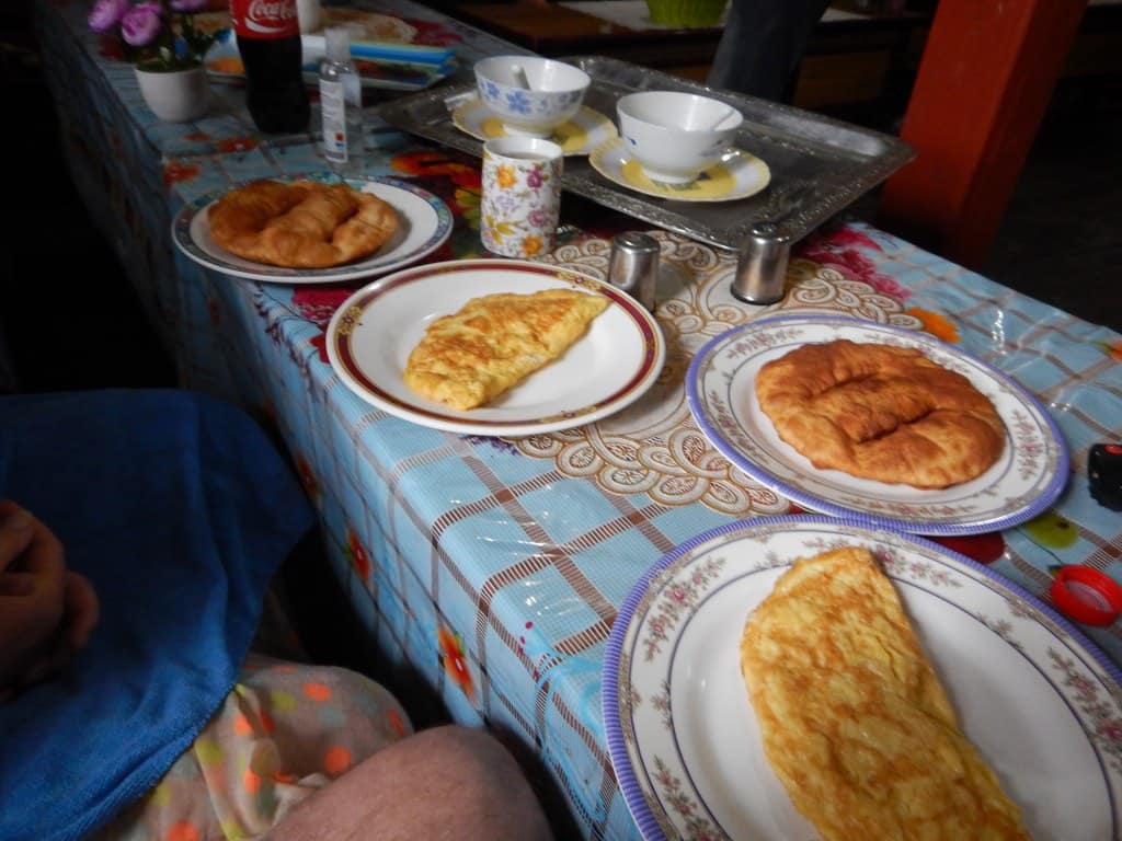We lunchen (dik verdiend) in Samer, nadat we de eerste top van 3500 meter hebben bereikt. Doordat de lucht ijler wordt, is de ademhaling strakker en heftiger, soms een beetje duizeligheid. Dus die lunch gaat er wel in, heerlijk genieten van Tibetaans brood. Binod heeft nog een klein champignonnetje.