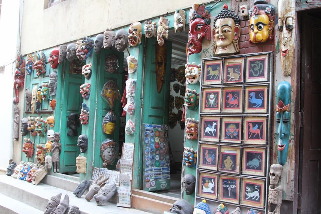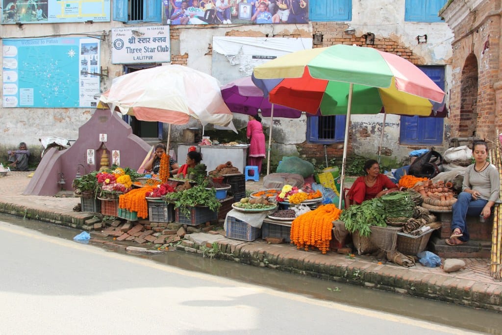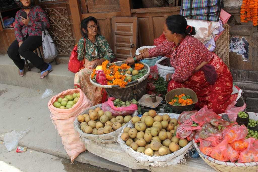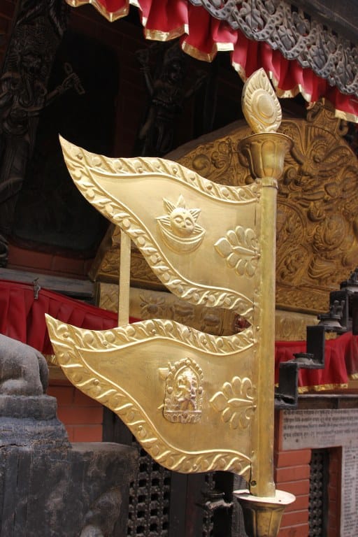 De slager op de hoek. Lamsvlees, let op: alleen mannetjes worden geslacht, vrouwtjes dus niet. Veel groente en fruitsoorten die wij niet kennen in Nederland. De Nepalese vlag in brons bij een van de vele tempels in de stad. De zon, aarde en Ganesh.