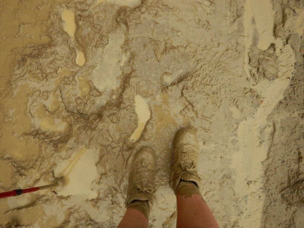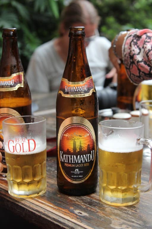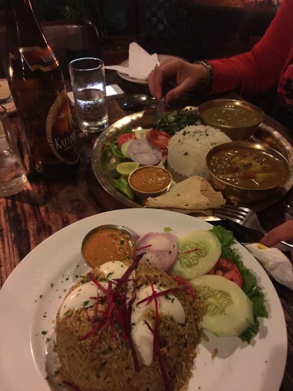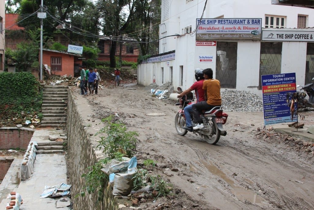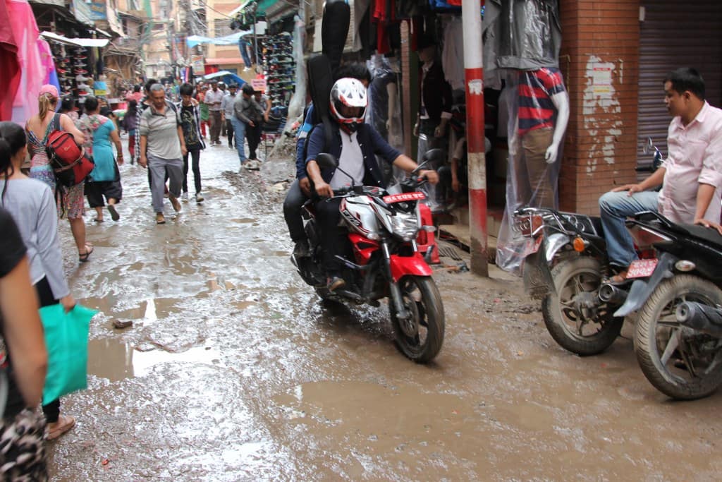a een paar uur regenen zien de straten er erg modderig uit. Dit zijn dus gewoon de hoofdwegen in het centrum van de stad. What else in Kathmandu……. Proost! Na een slopende dag en nacht, eten we in het nabij gelegen restaurant Gaia. Dit op aanraden van Maxim. Onze eerste Nepalese maaltijd is om te genieten! Heerlijk.