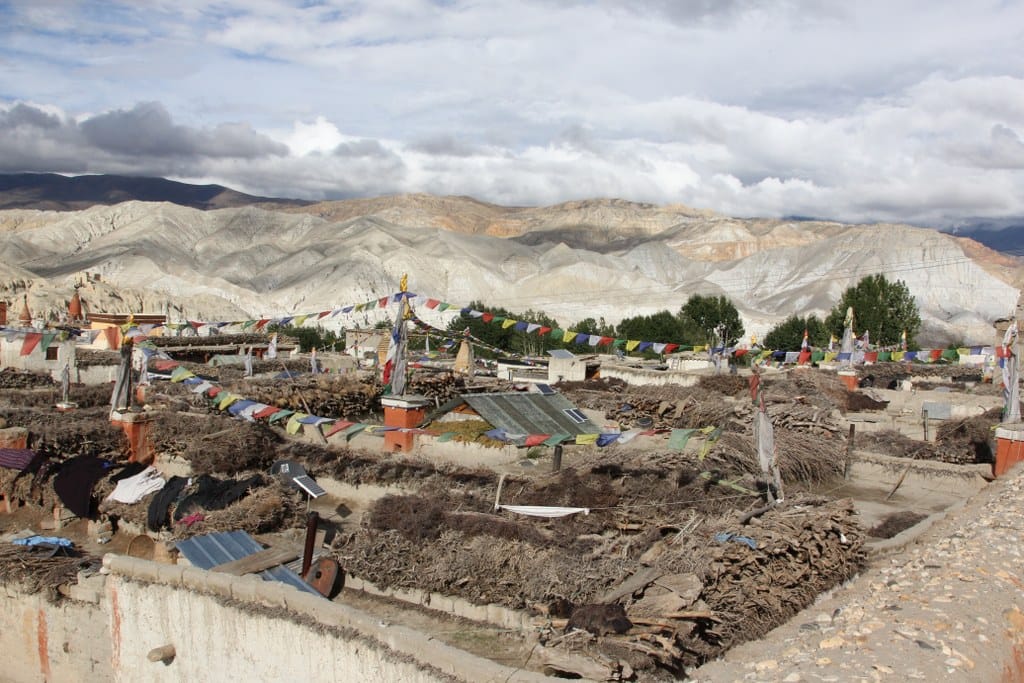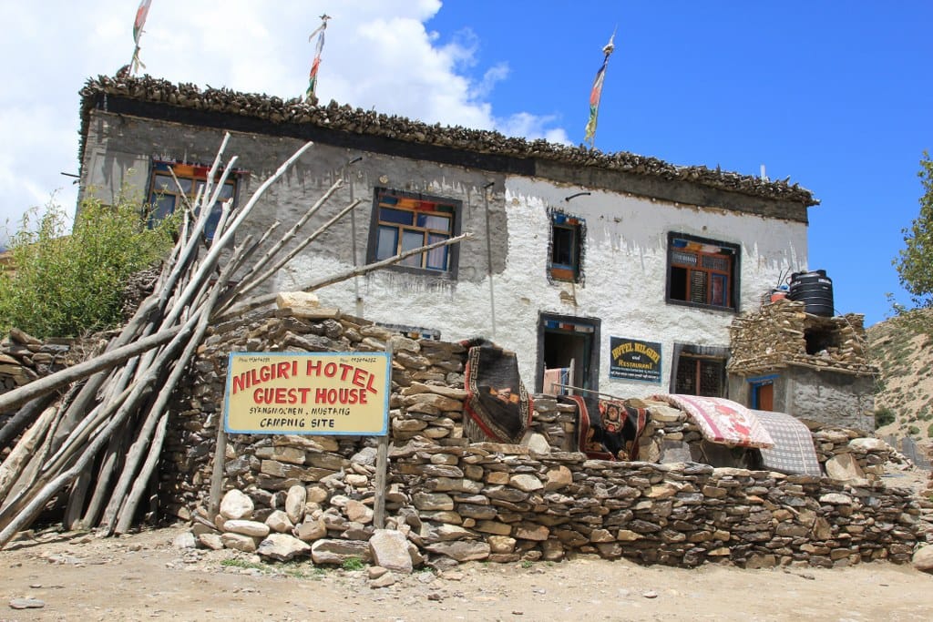 Richting het einde zijn de kilometers voelbaar, zeker ook de voeten zijn goed gemasseerd vanwege de stenen en keien op de weg. Dorpje waar crematie gaande is. NEPAL, Never ending peace and love. We komen aan in Chhusang alwaar Binod een prima kamer voor ons heeft geregeld met een heerlijke douche. Dik verdiend. Nette kamer en eetruimte in deze Guesthouse, en dat allemaal in de upper Mustang.