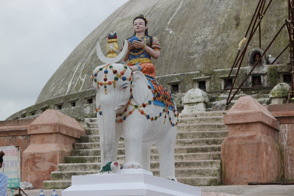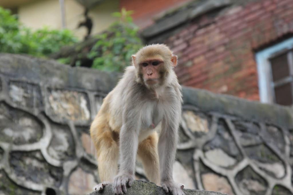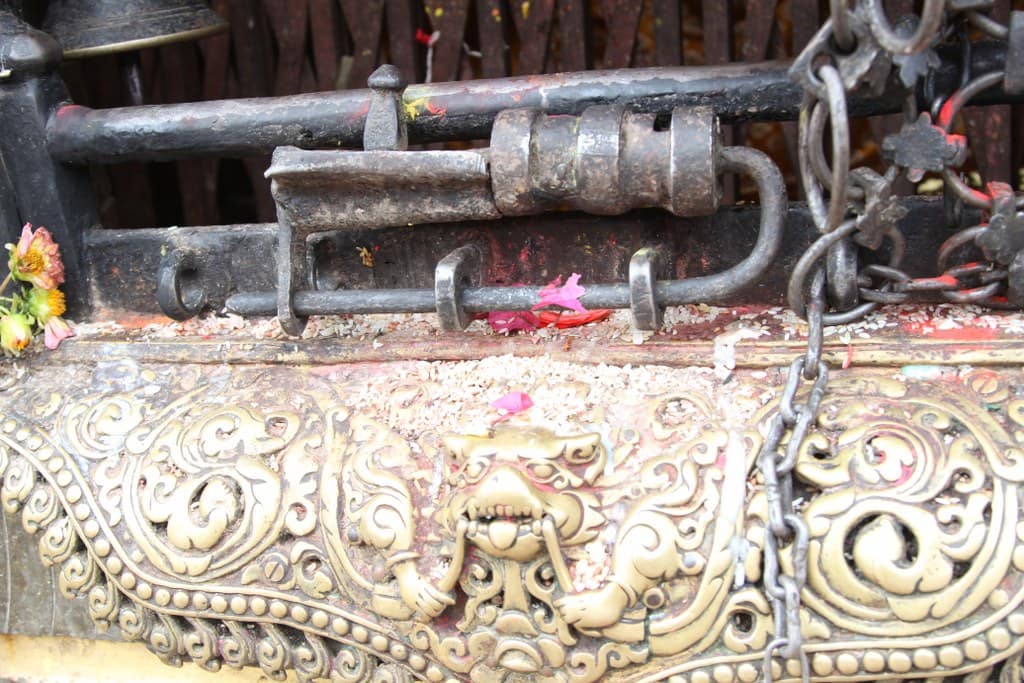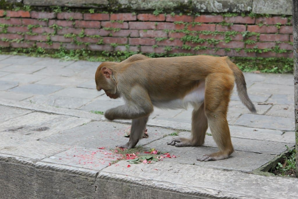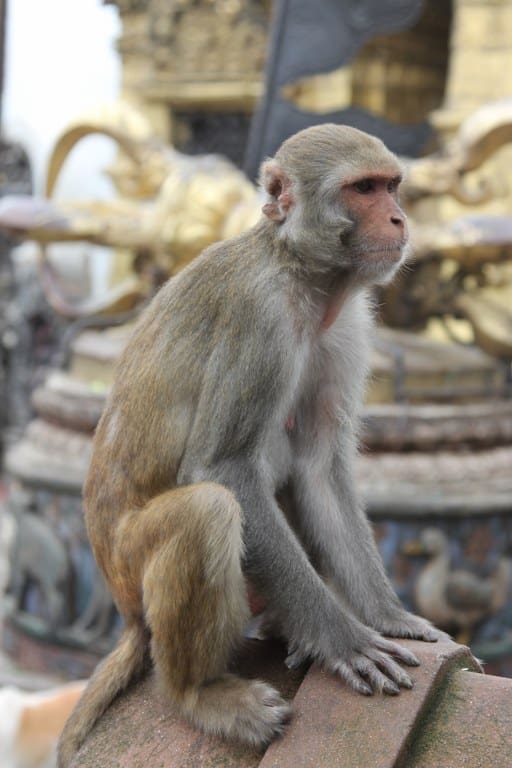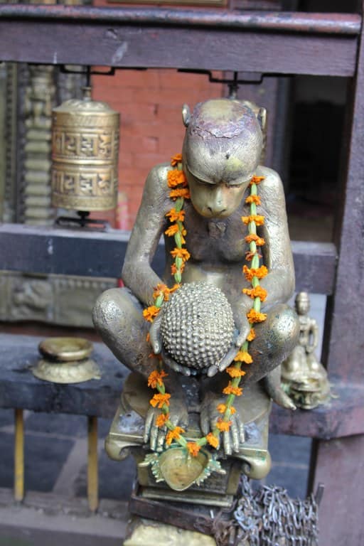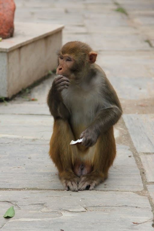 Op naar de gouden tempel, eerst even de leeuwen passeren. Eens kijken welke leeuw het hardst brult. Er wordt hier erg veel geofferd met bloemen en fruit. Daar staat deze aap centraal voor, die een vrucht offert.