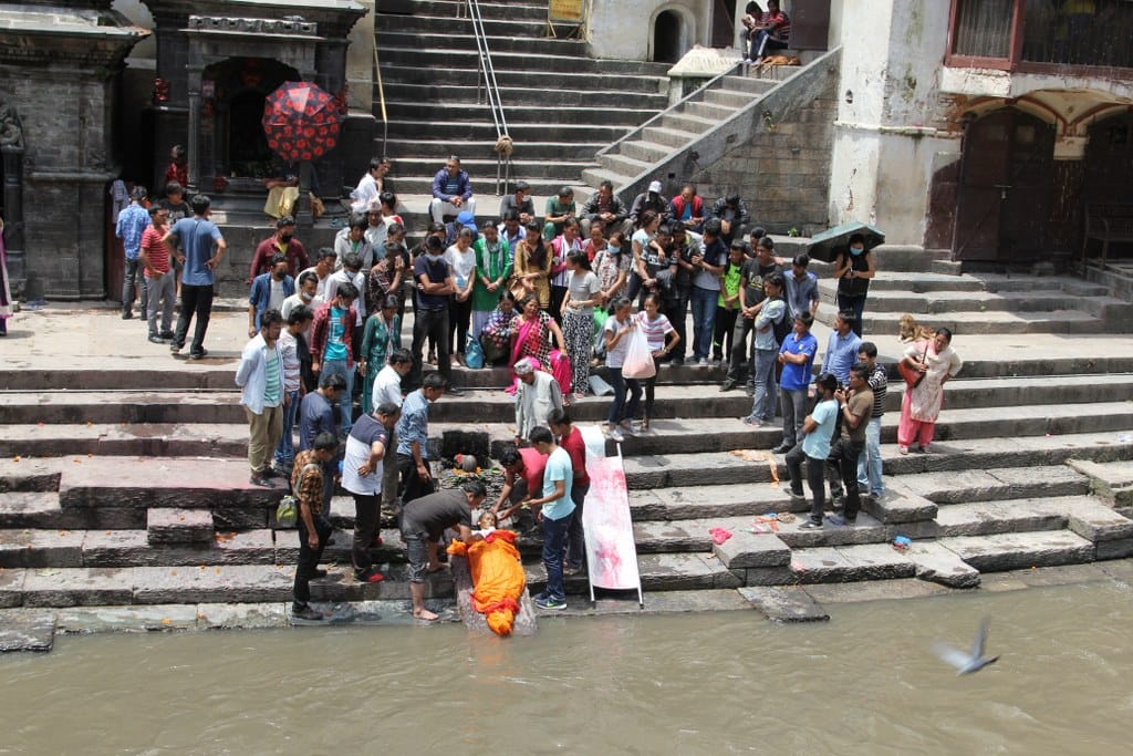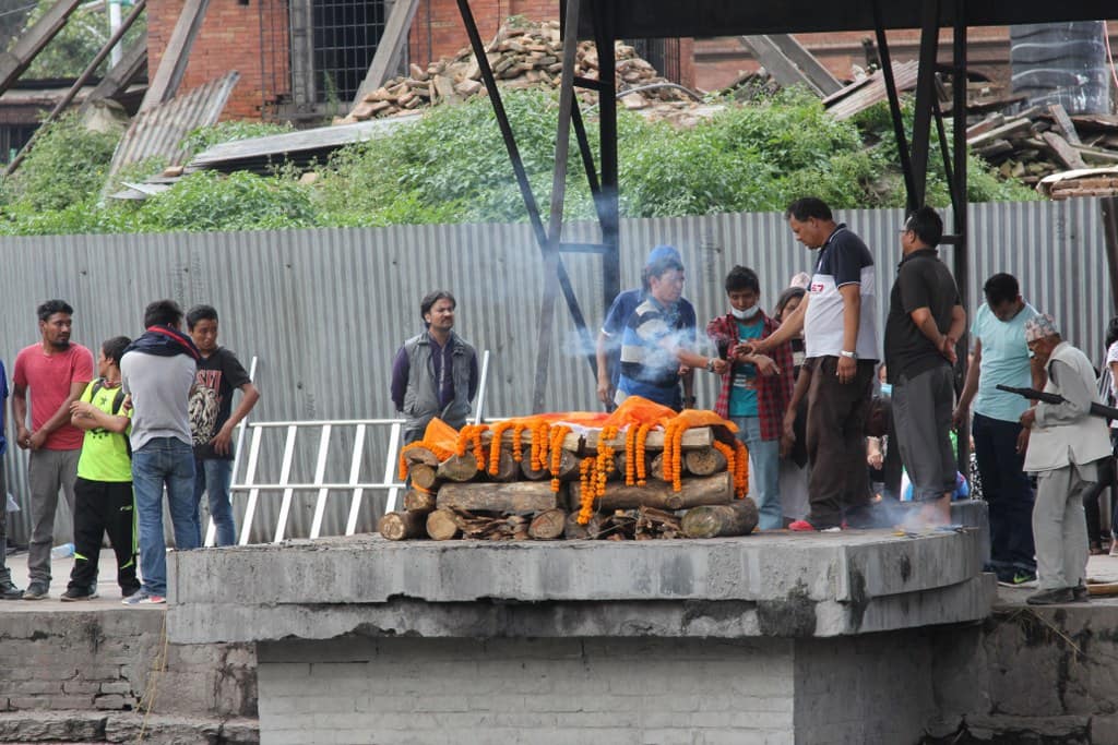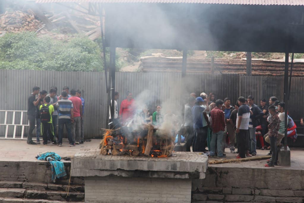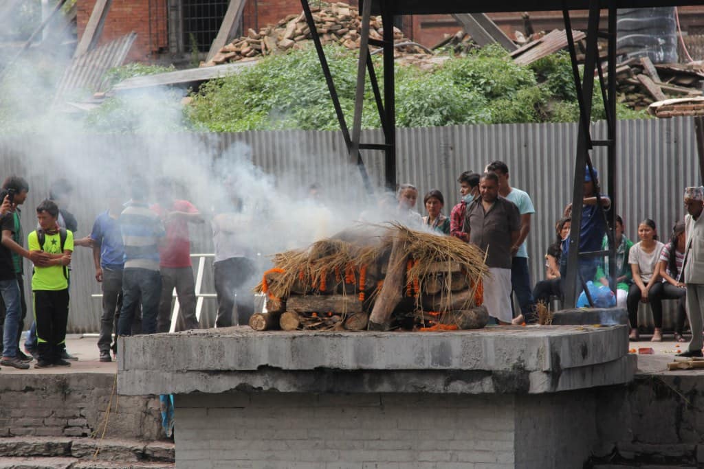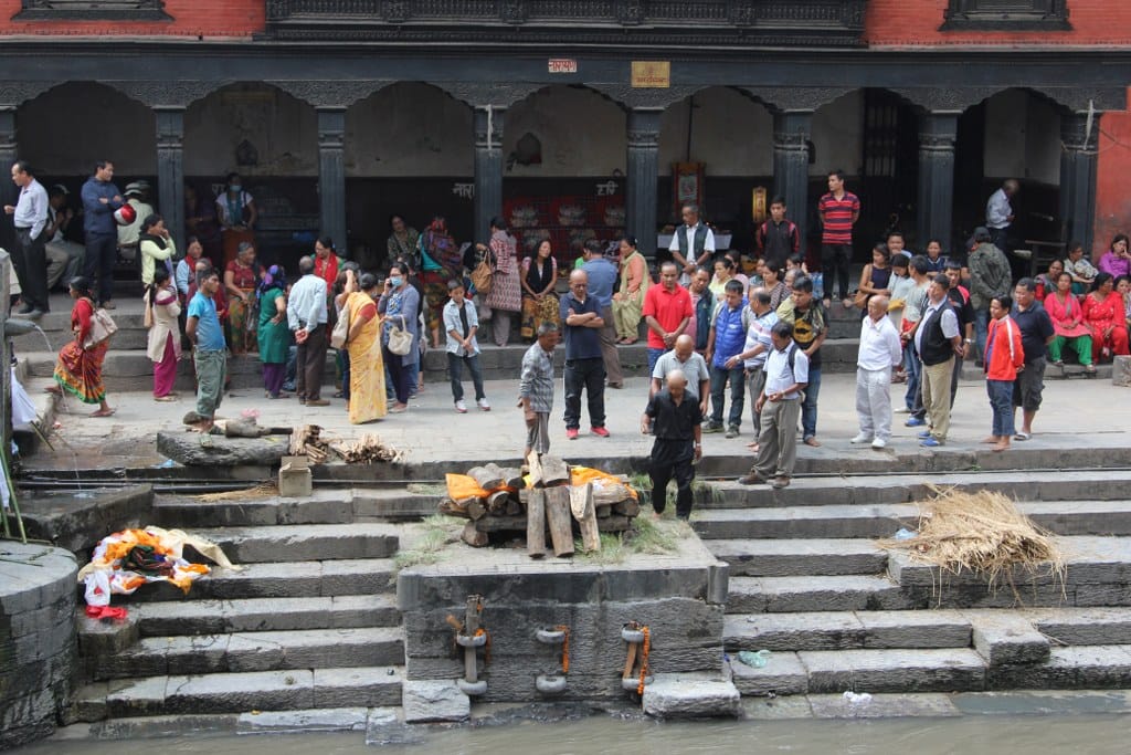 Terug bij de crematieplaats: Hier wordt een (dode) vrouw naar de rivierzijde gebracht en met de voeten in de heilige rivier gelegd. Eerst wordt het hoofd ontbloot en daarna de voeten. Aansluitend worden er liederen gezongen en mag de naaste familie water, uit de rivier, in haar gezicht en over haar voeten sprenkelen. Terwijl we dit alles aanschouwen, wordt het volgende lichaam al weer aangedragen. Deze stoet gaat nu op weg naar de crematieplaats, nadat het lichaam met bloemenslingers en andere versieringen zijn bedekt. Aangekomen op de crematieplaats ligt het hout al klaar, alvorens het lichaam daar wordt neergelegd, wordt er eerst driemaal (tegen de klok in) met het lichaam rond de houtstapel gelopen. Dit wordt gedaan door de mannelijke familieleden, in dit geval de zoons. De vrouwen kijken toe en brengen daarna nog een ceremonie. Eerst wordt er een stuk brandbaar hout op het ontblote gezicht gelegd, daarna wordt de stapel aangestoken. Ook de aanwezige familieleden filmen/fotograferen het ritueel/afscheid. Nog even een kijkje terug, en zien we het gereedmaken van de volgende twee crematies alweer in volle gang. Erg bijzonder om dit zo te zien. Voordat de volledige crematie is voltooid, duurt zo’n 3 a 4 uur. Tijdens de crematie blijft de familie/vrienden aanwezig tot het vuur gedoofd is.