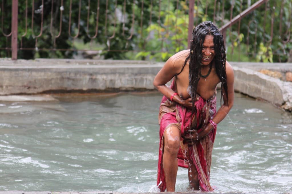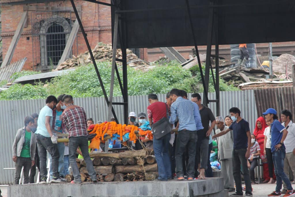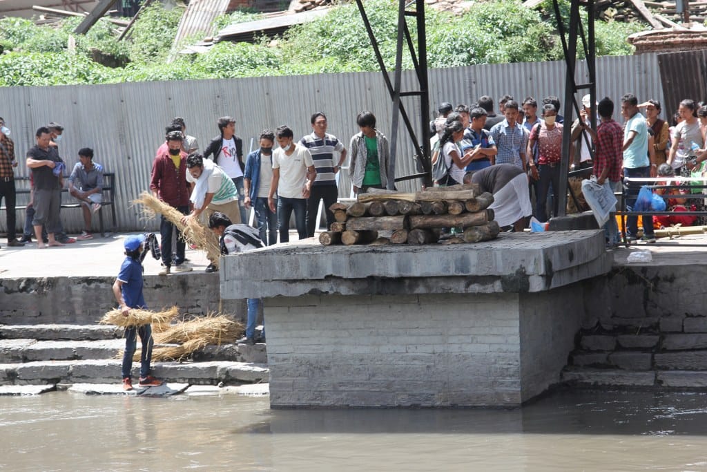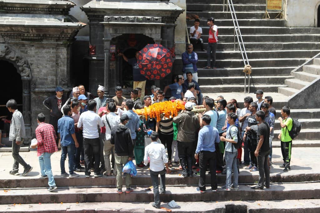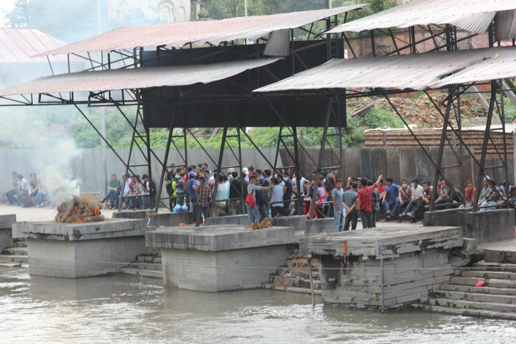 Terug bij de crematieplaats: Hier wordt een (dode) vrouw naar de rivierzijde gebracht en met de voeten in de heilige rivier gelegd. Eerst wordt het hoofd ontbloot en daarna de voeten. Aansluitend worden er liederen gezongen en mag de naaste familie water, uit de rivier, in haar gezicht en over haar voeten sprenkelen. Terwijl we dit alles aanschouwen, wordt het volgende lichaam al weer aangedragen. Deze stoet gaat nu op weg naar de crematieplaats, nadat het lichaam met bloemenslingers en andere versieringen zijn bedekt. Aangekomen op de crematieplaats ligt het hout al klaar, alvorens het lichaam daar wordt neergelegd, wordt er eerst driemaal (tegen de klok in) met het lichaam rond de houtstapel gelopen. Dit wordt gedaan door de mannelijke familieleden, in dit geval de zoons. De vrouwen kijken toe en brengen daarna nog een ceremonie. Eerst wordt er een stuk brandbaar hout op het ontblote gezicht gelegd, daarna wordt de stapel aangestoken. Ook de aanwezige familieleden filmen/fotograferen het ritueel/afscheid. Nog even een kijkje terug, en zien we het gereedmaken van de volgende twee crematies alweer in volle gang. Erg bijzonder om dit zo te zien. Voordat de volledige crematie is voltooid, duurt zo’n 3 a 4 uur. Tijdens de crematie blijft de familie/vrienden aanwezig tot het vuur gedoofd is.