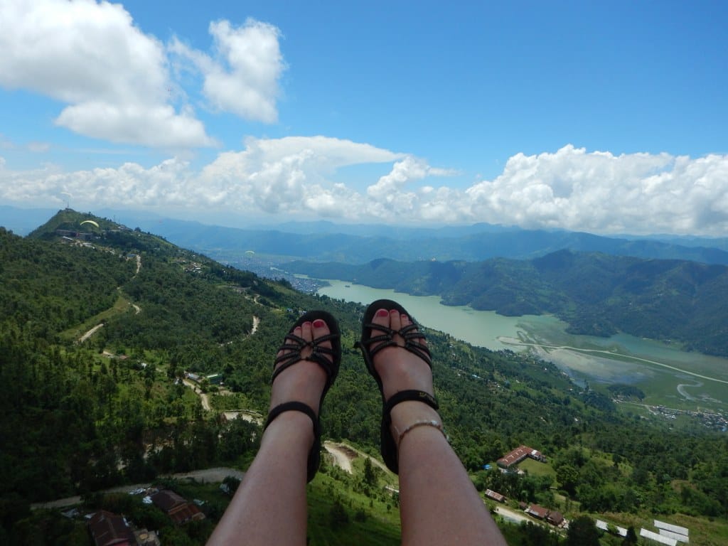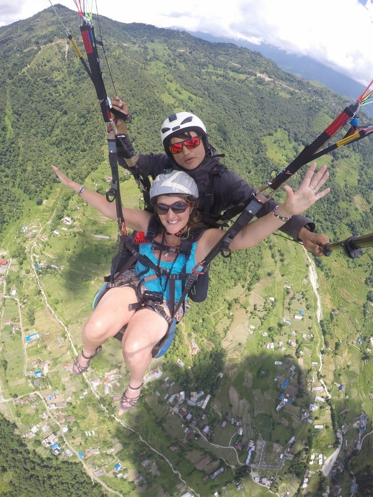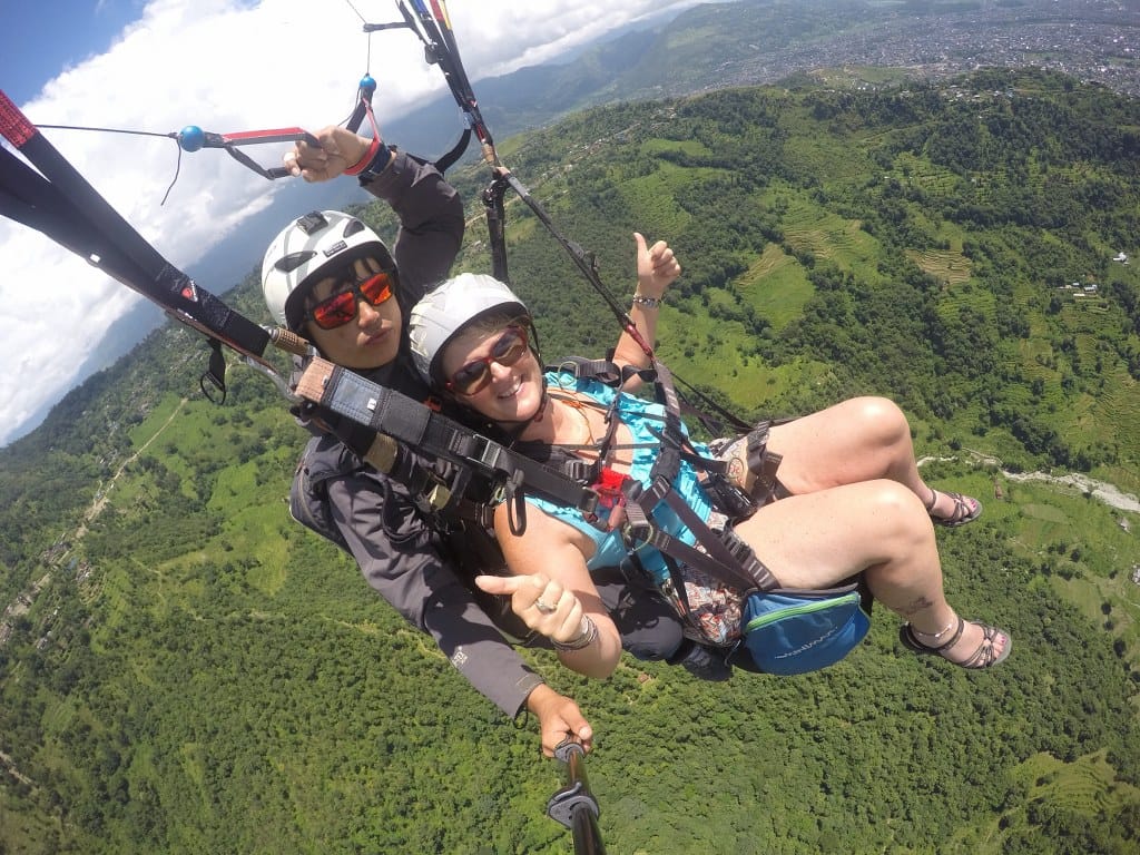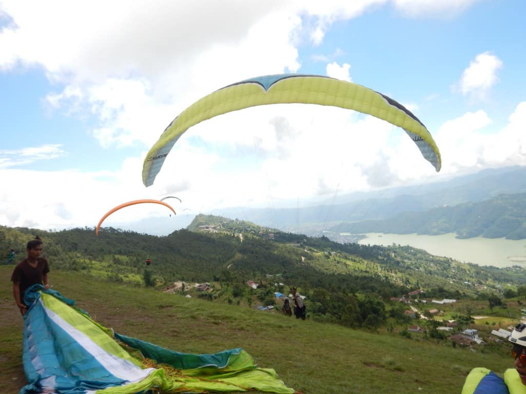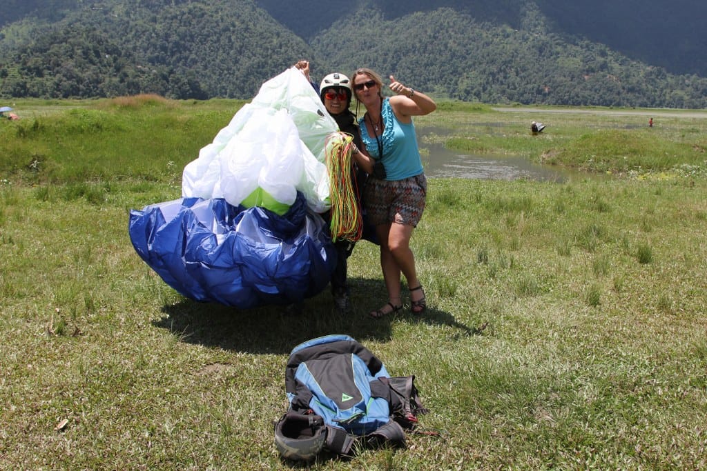 Bij ons hotel aangekomen, gaan we eerst ff ontbijten bij am/pm cafe. We hebben hier al eens geluncht toen we eerder in Pokhara waren, voor onze trekking. Aansluitend gaan we snel jolanda’s paraglide’s tocht boeken. Oeps, vertrek al over een half uur, rond 09.30 uur. Snel opfrissen en wegwezen. Ruud mag een uurtje later vertrekken naar de landingsplaats van het paragliden. Het is Nepal, dus vertrekken is altijd later dan gepland. Jolanda gaat met jeep naar de top van de berg aan het Fewa lake, uurtje rijden. Daar is het wachten geblazen tot er een plaatsje vrij komt om te vertrekken op het veld. Er hangen continu zo’n 60 paragliders in de lucht, mede doordat het deze dag echt perfect weer is. Wachten op een windvlaag, een paar meter rennen en wegwezen, de lucht in. Zitten en relaxen in de lucht.