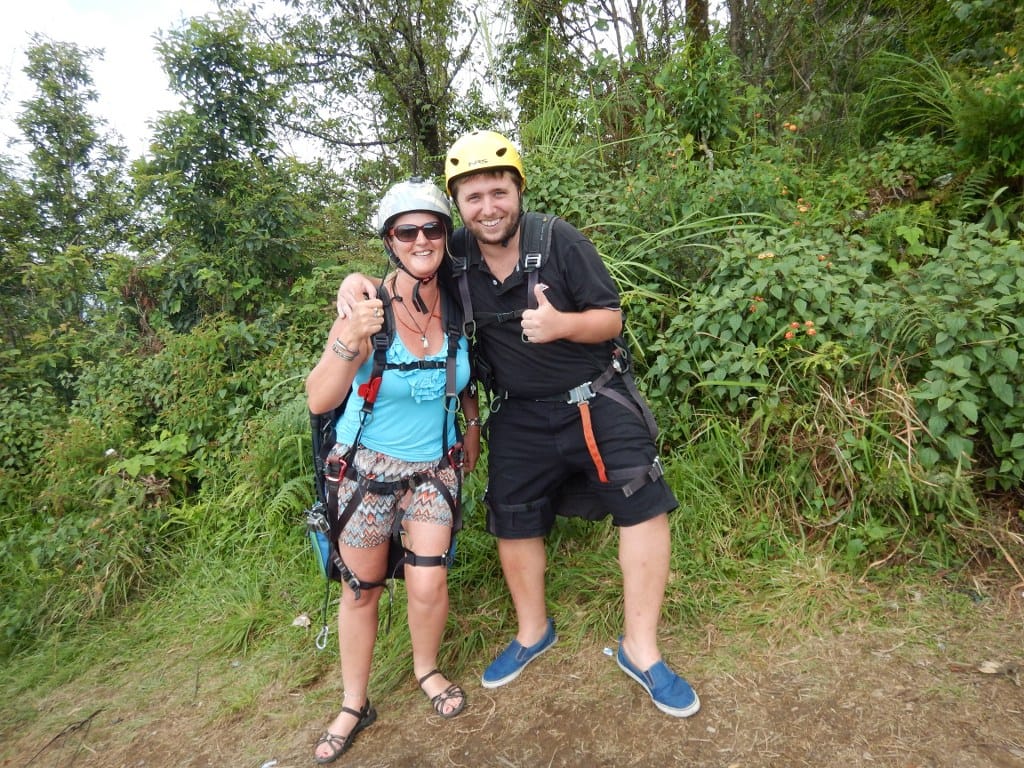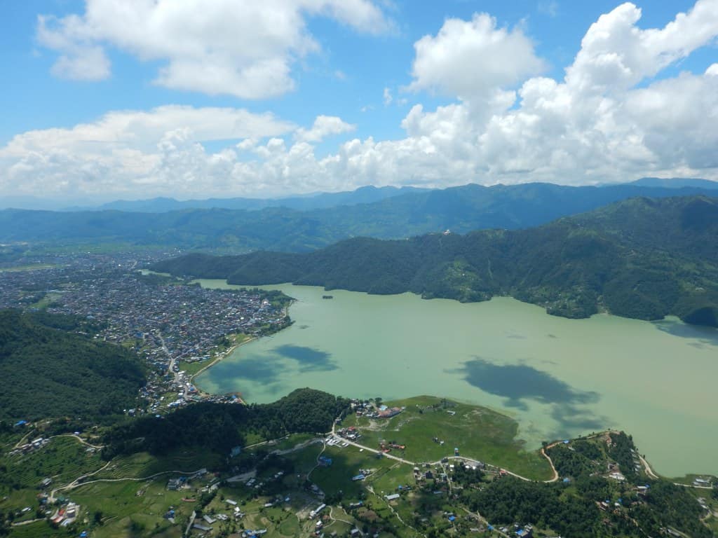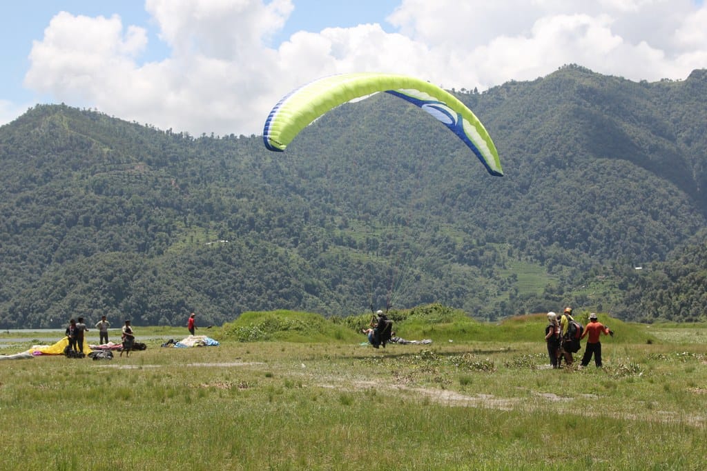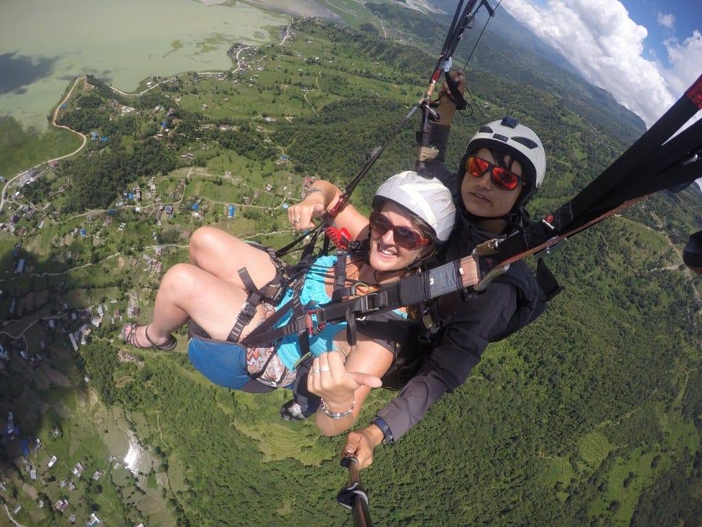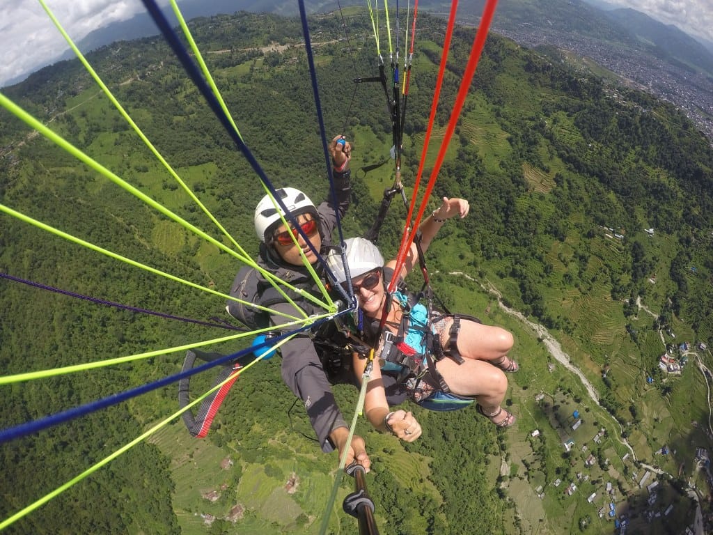 Bij ons hotel aangekomen, gaan we eerst ff ontbijten bij am/pm cafe. We hebben hier al eens geluncht toen we eerder in Pokhara waren, voor onze trekking. Aansluitend gaan we snel jolanda’s paraglide’s tocht boeken. Oeps, vertrek al over een half uur, rond 09.30 uur. Snel opfrissen en wegwezen. Ruud mag een uurtje later vertrekken naar de landingsplaats van het paragliden. Het is Nepal, dus vertrekken is altijd later dan gepland. Jolanda gaat met jeep naar de top van de berg aan het Fewa lake, uurtje rijden. Daar is het wachten geblazen tot er een plaatsje vrij komt om te vertrekken op het veld. Er hangen continu zo’n 60 paragliders in de lucht, mede doordat het deze dag echt perfect weer is. Wachten op een windvlaag, een paar meter rennen en wegwezen, de lucht in. Zitten en relaxen in de lucht.