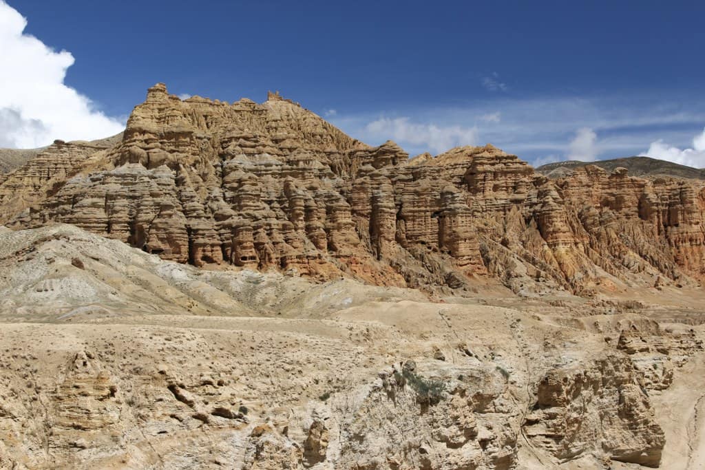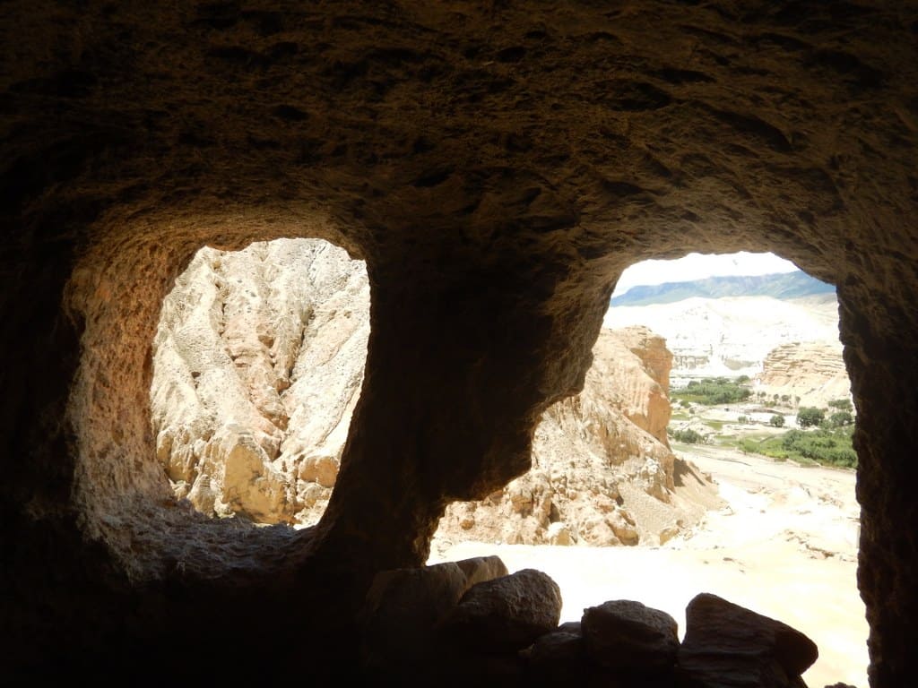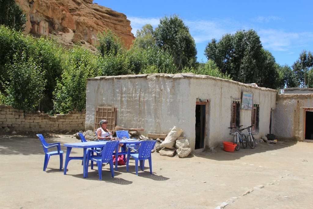 We wandelen nog even berg op om nog een aantal caves te bekijken waar momenteel nog steeds mensen wonen. Het berg op wandelen blijft vermoeiend op deze hoogtes, dus flink hijgen om voldoende zuurstof binnen te krijgen. We kunnen deze caves niet in omdat dit echt prive is, wel erg gaaf om te zien dat dergelijk grotten nog steeds gebruikt worden. Daarna lunch (noodles soep met verse groenten) in Chhoser en weer op naar Lo Mantang by horse and Mountainbike. Jaaaaa, en op een terrasje buiten. Erg bijzonder want die kennen ze in het Mustang gebied niet echt. Wel even uitkijken welke stoelen je neemt, ze zijn namelijk niet allemaal Ruud en Jolanda proof!