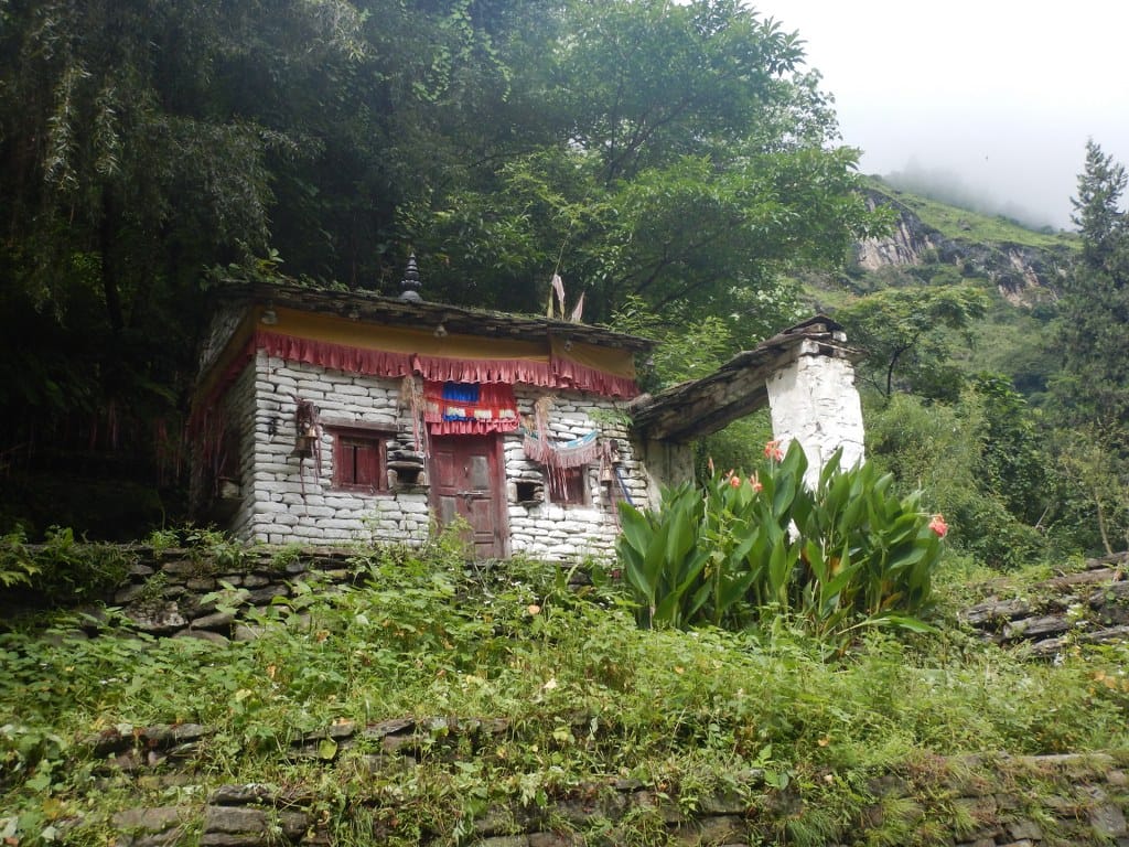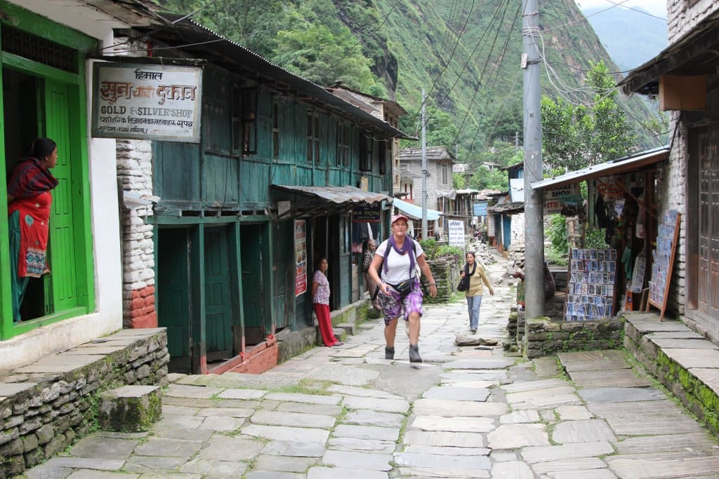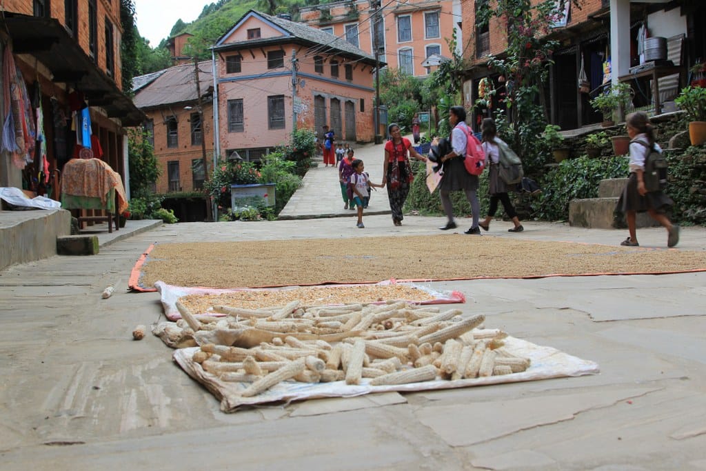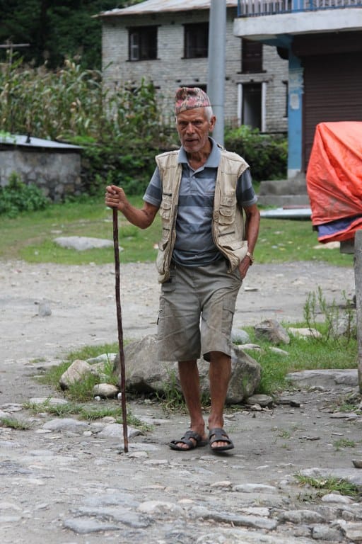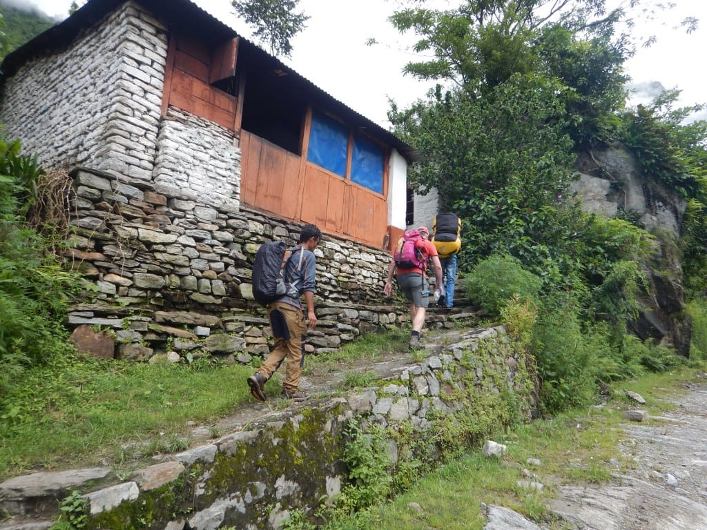 We gaan al snel klimmen, serieus klimmen. We passeren enkele geweldige bergdorpjes. We lopen langs smalle paadjes en erg diepe afgronden. Gelukkig dat Binod er bij is zodat ik begeleid kan worden langs de afgronden, niks voor Ruudje.