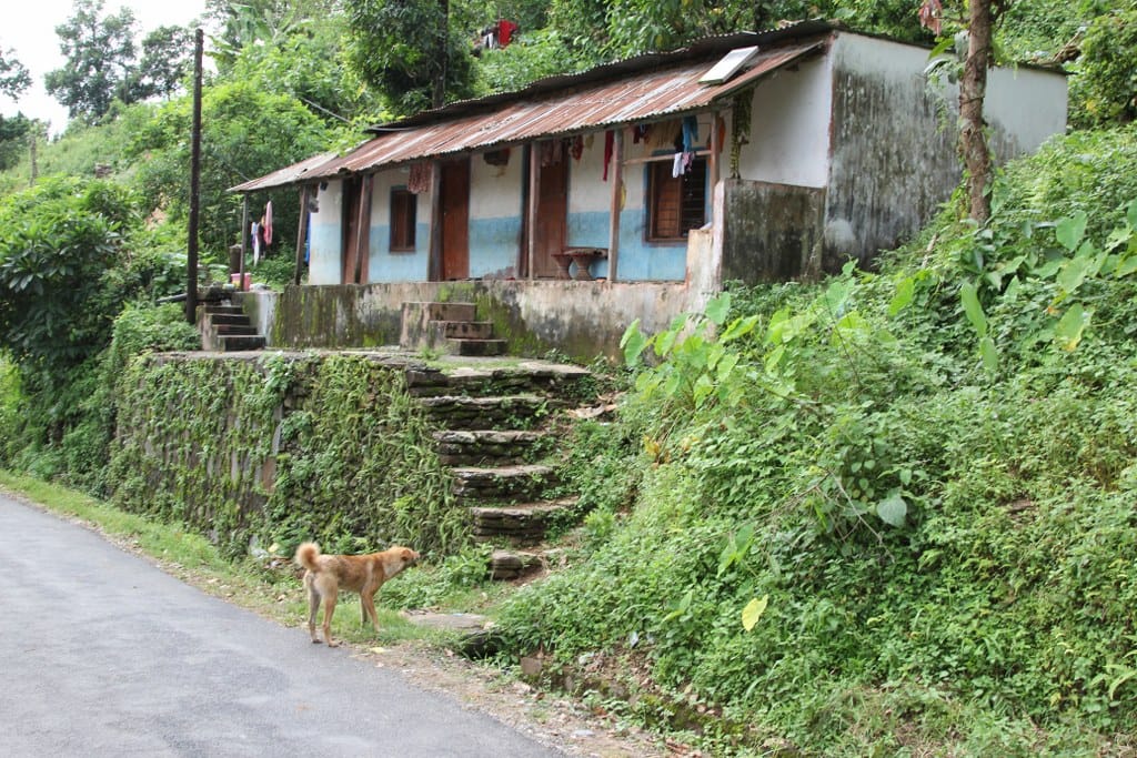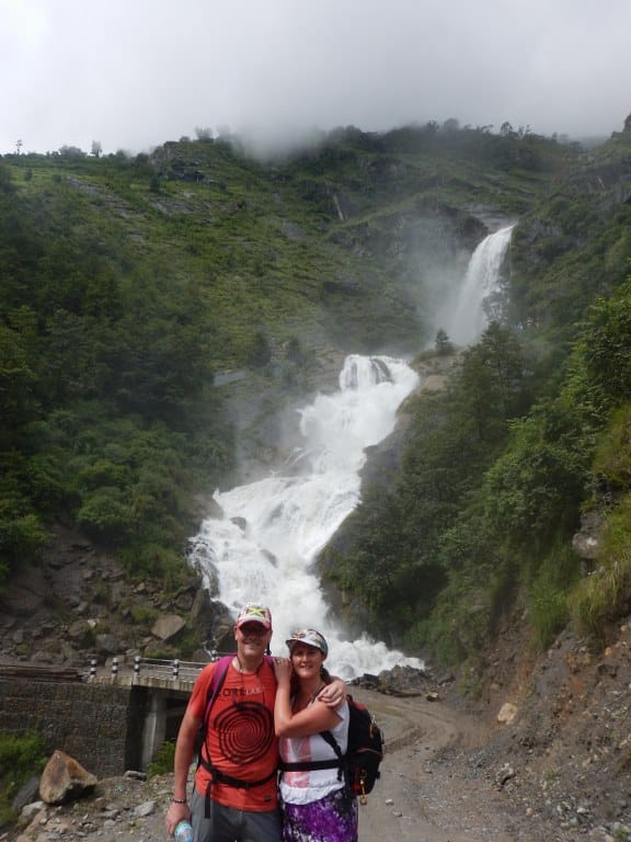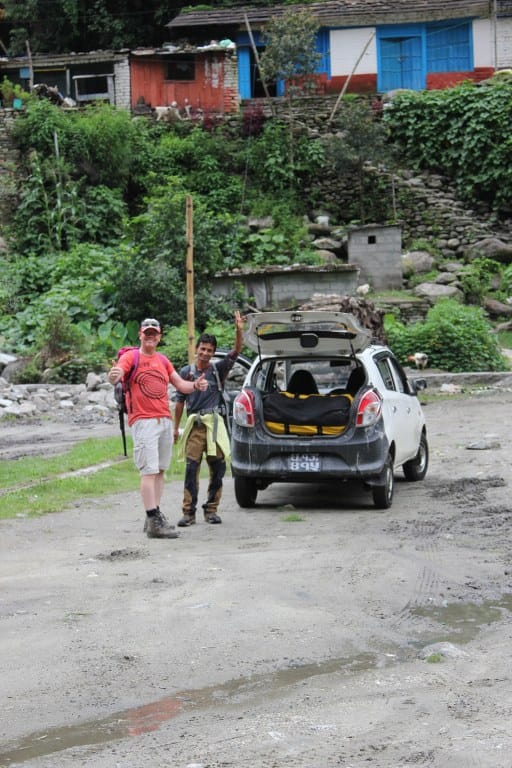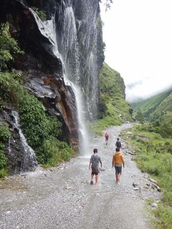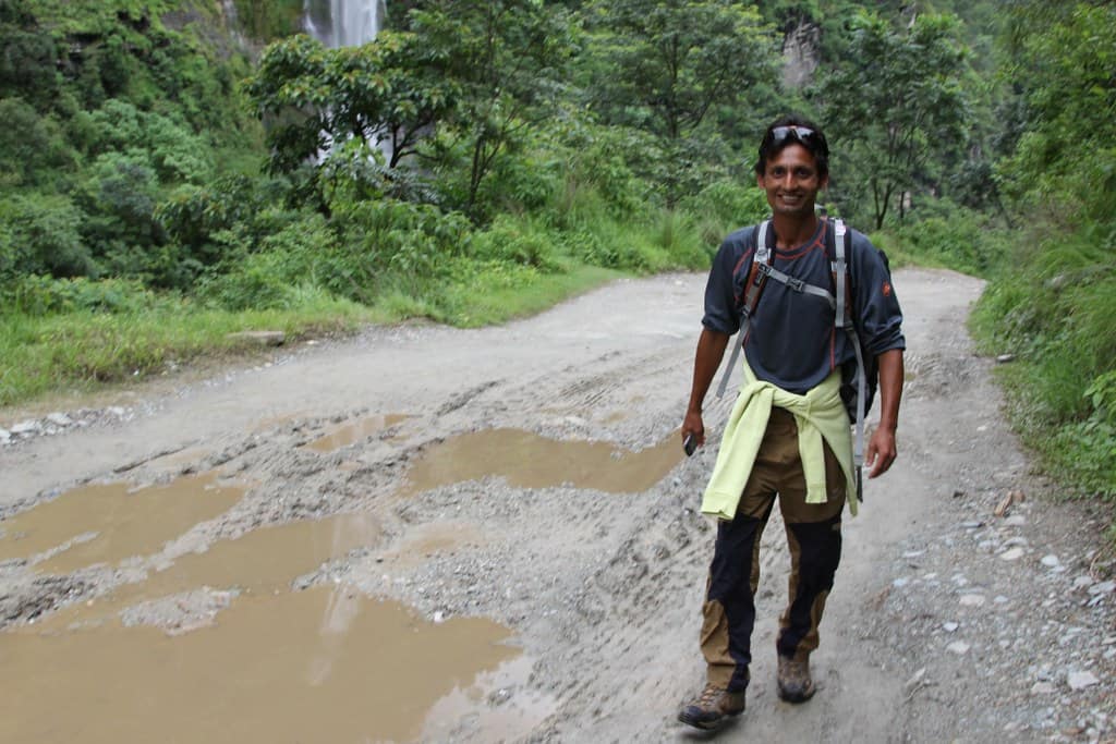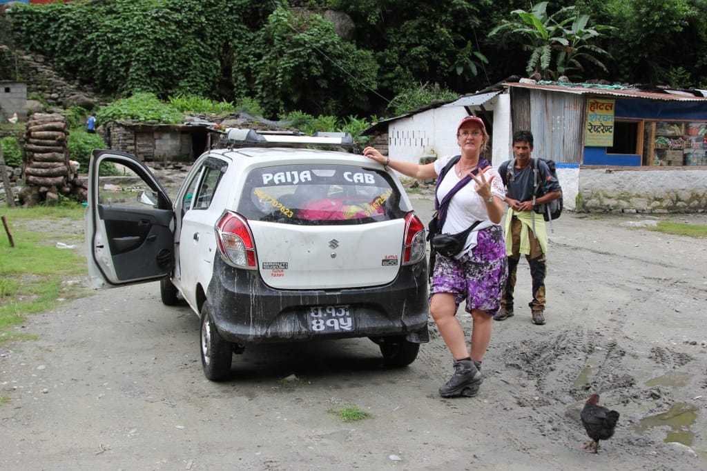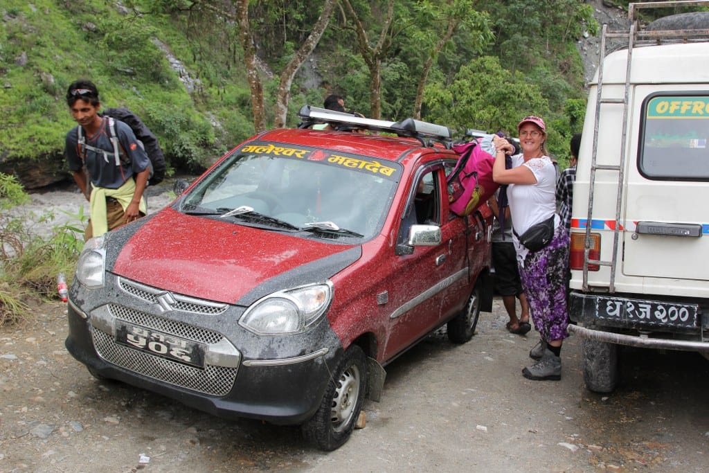 Na twee uur wandelen, door modder, plassen en stenen zien we weer auto’s staan. Deze tocht was niet geheel ongevaarlijk vanwege de landslides en vallende stenen maar Binod houdt alles goed in de gaten. Top gids! We vervolgen wederom met een klein autootje over wegen die in NL als onbegaanbaar verklaard zouden worden.
