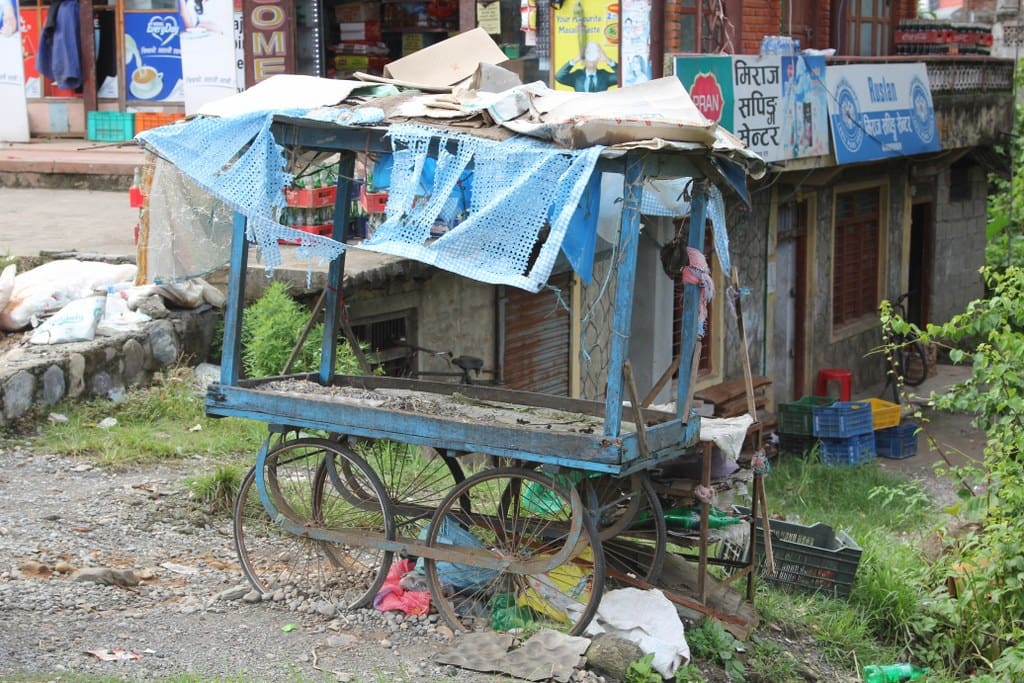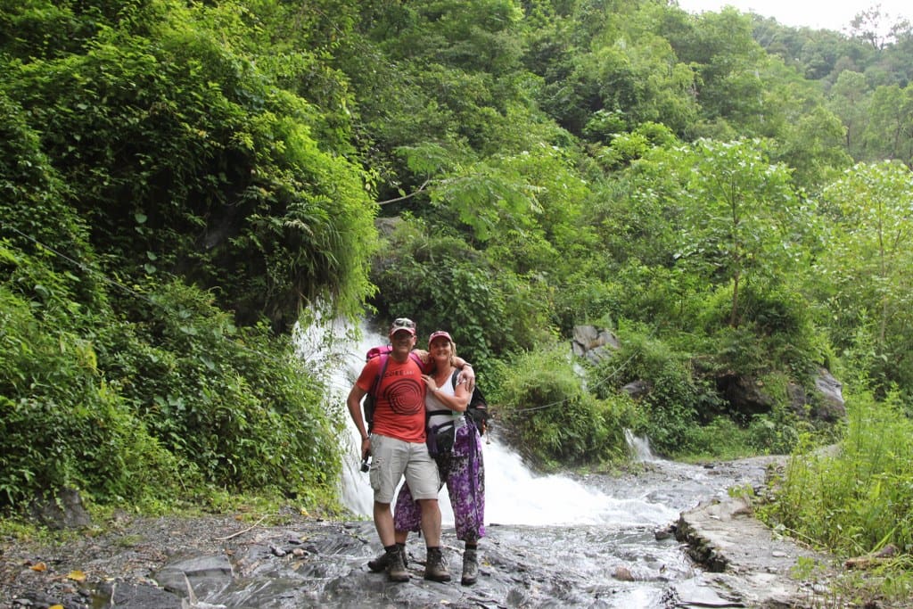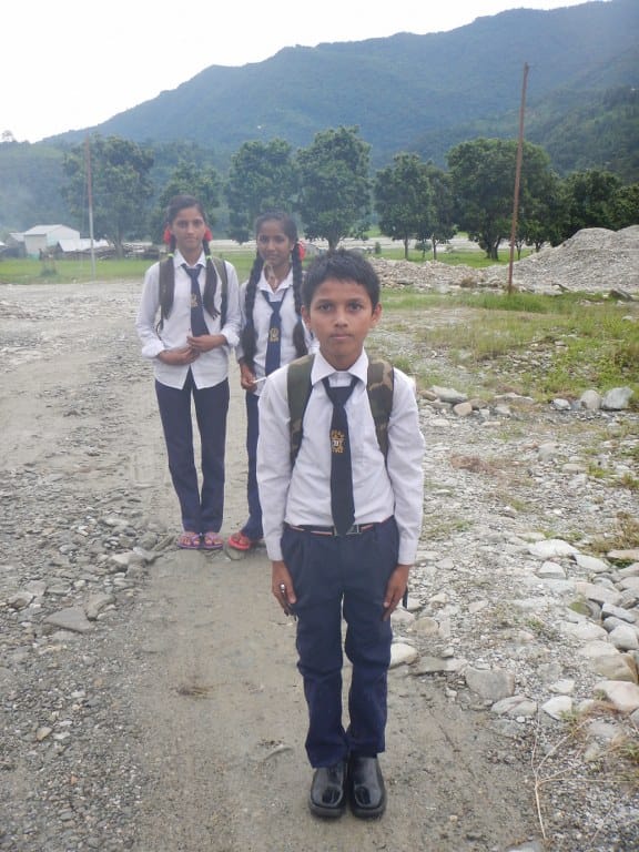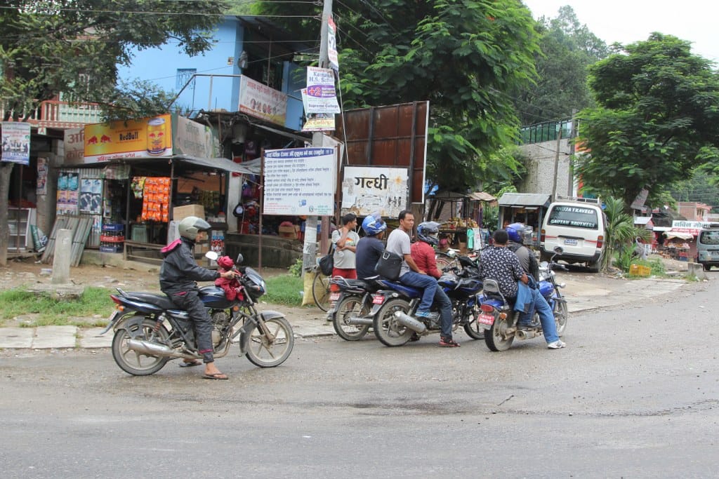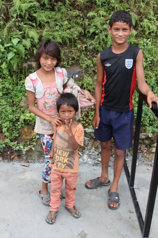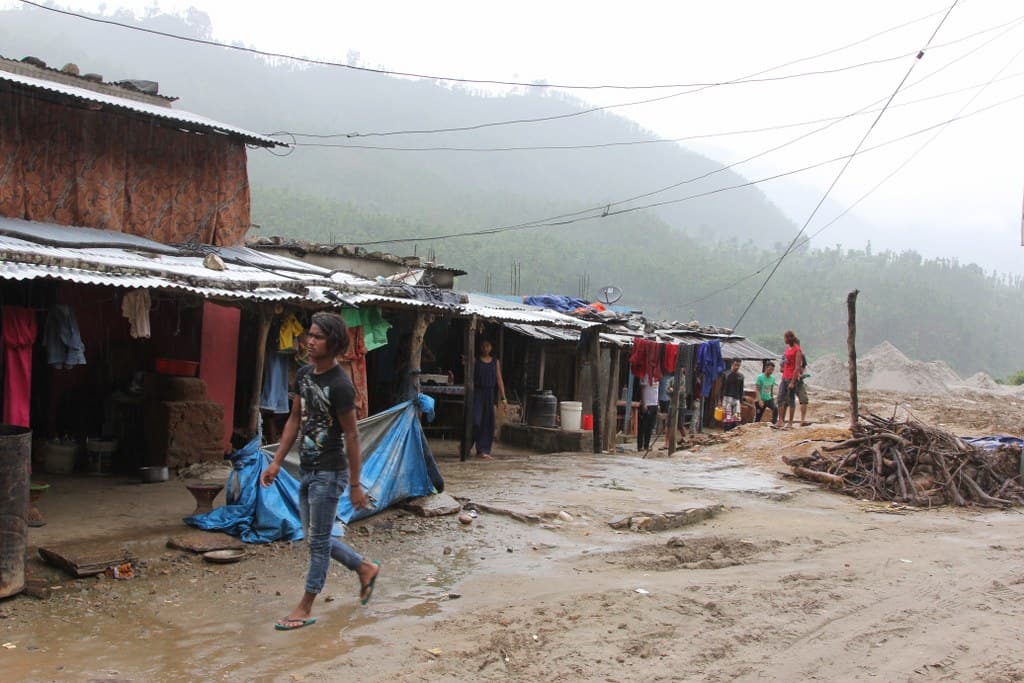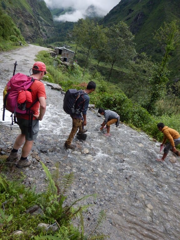 Na twee uur wandelen, door modder, plassen en stenen zien we weer auto’s staan. Deze tocht was niet geheel ongevaarlijk vanwege de landslides en vallende stenen maar Binod houdt alles goed in de gaten. Top gids! We vervolgen wederom met een klein autootje over wegen die in NL als onbegaanbaar verklaard zouden worden.