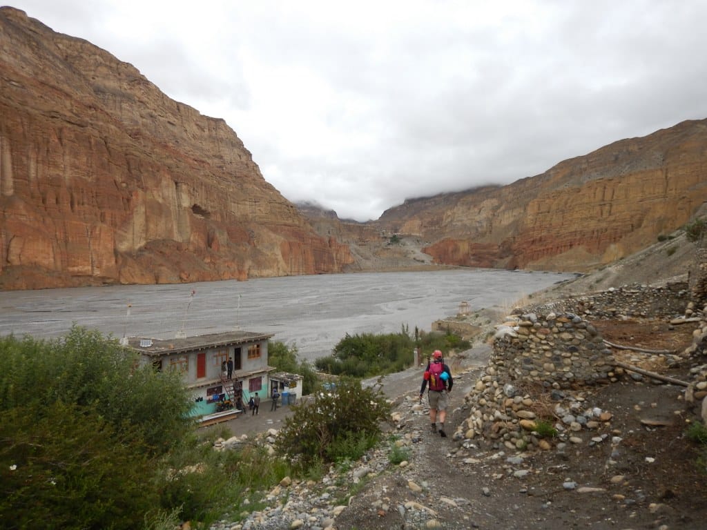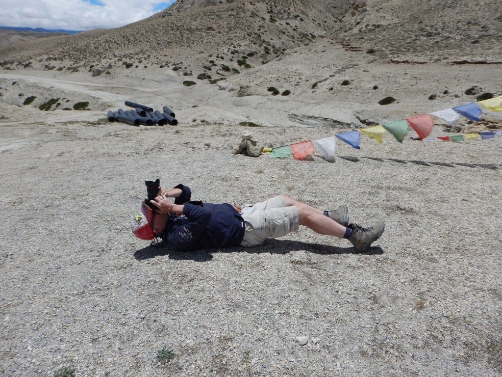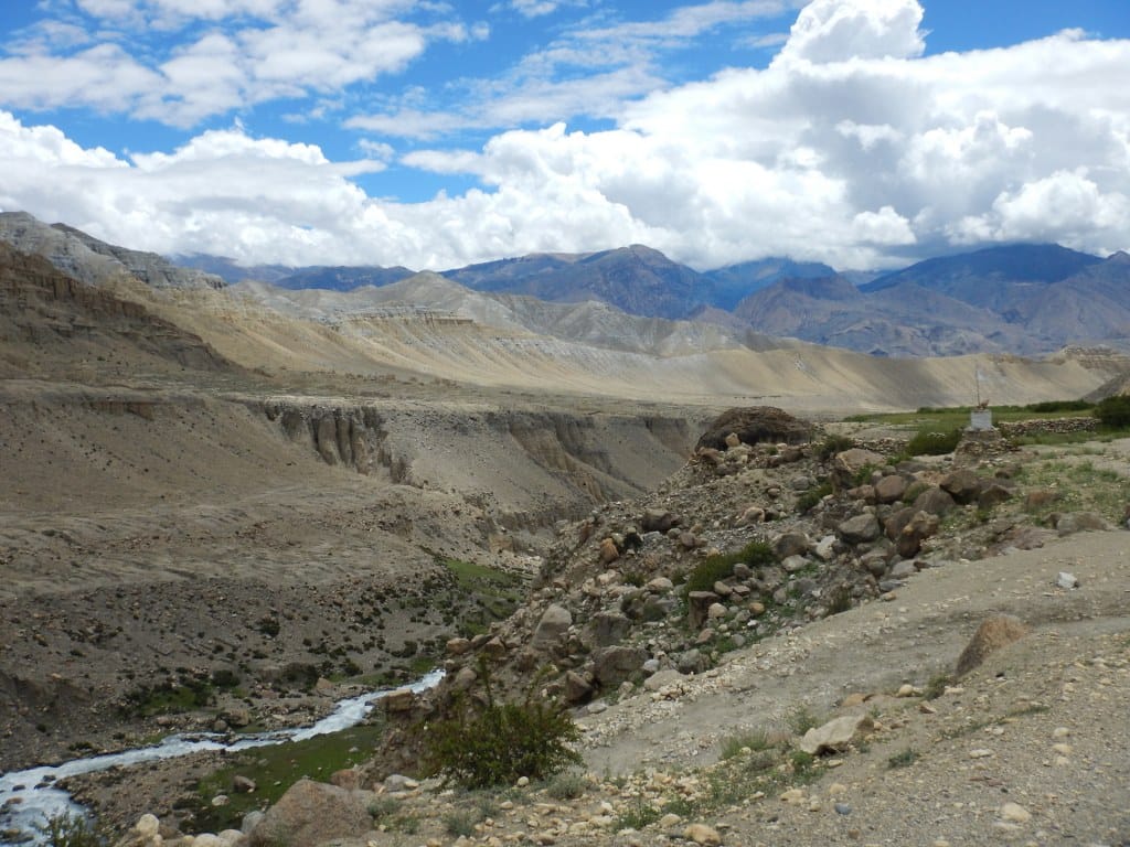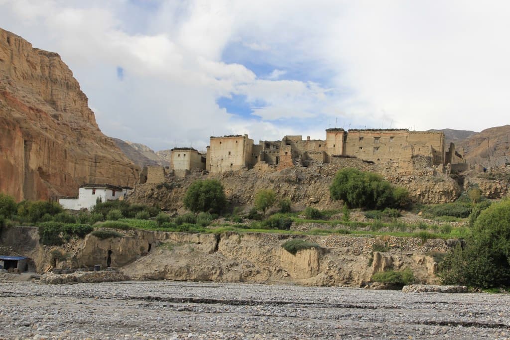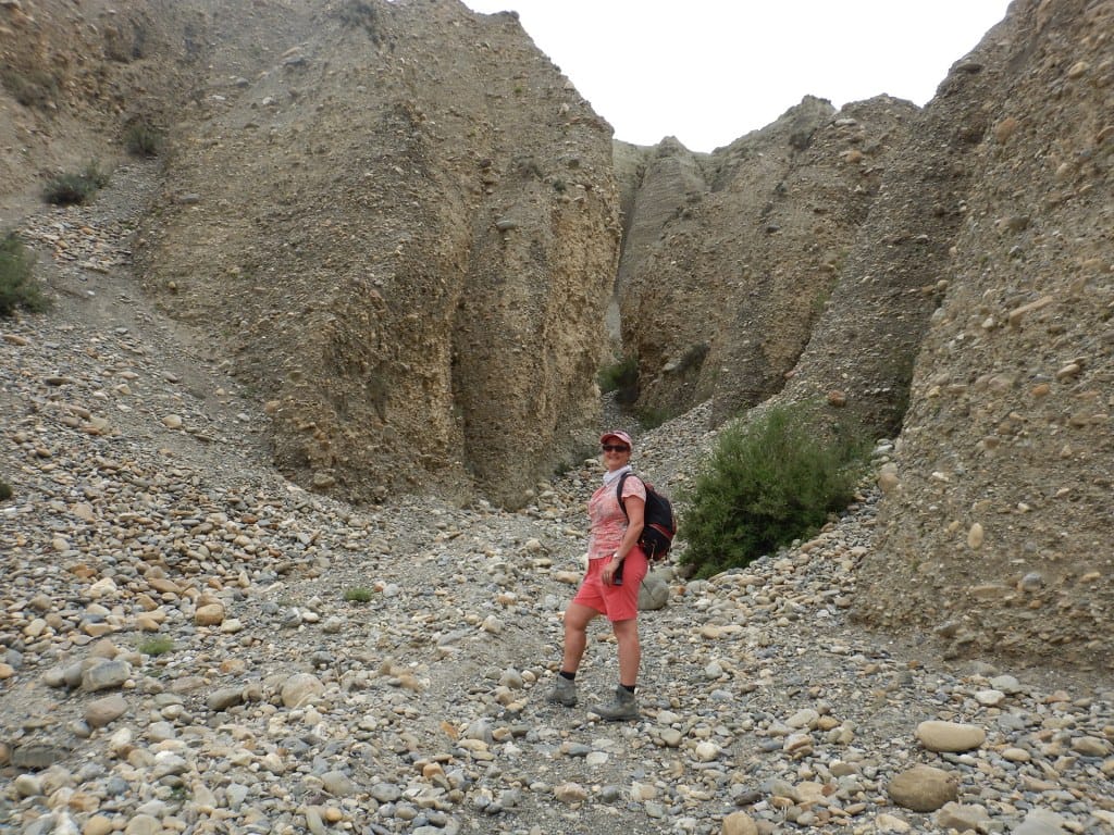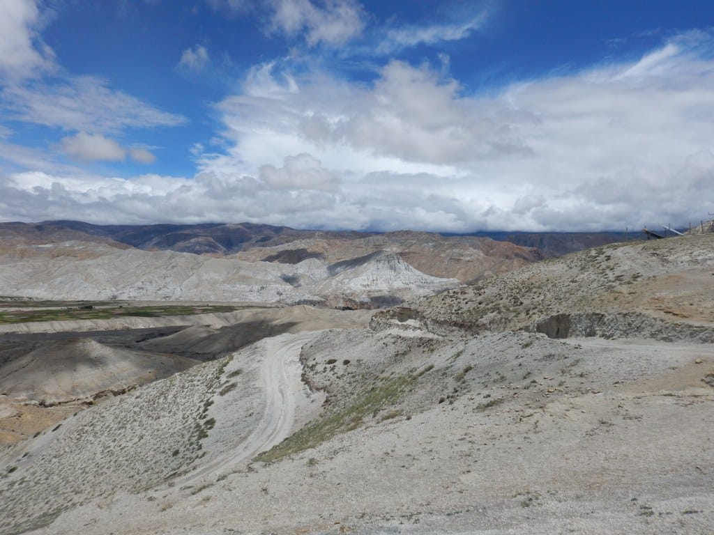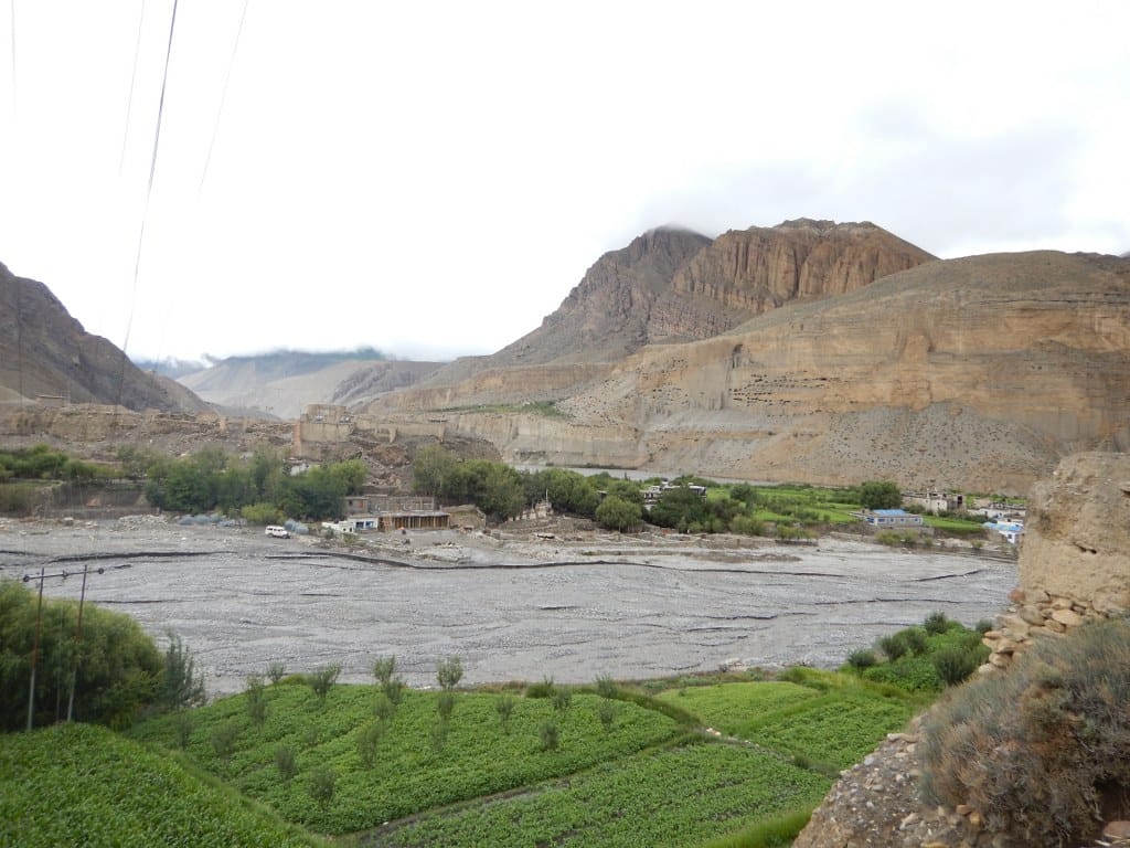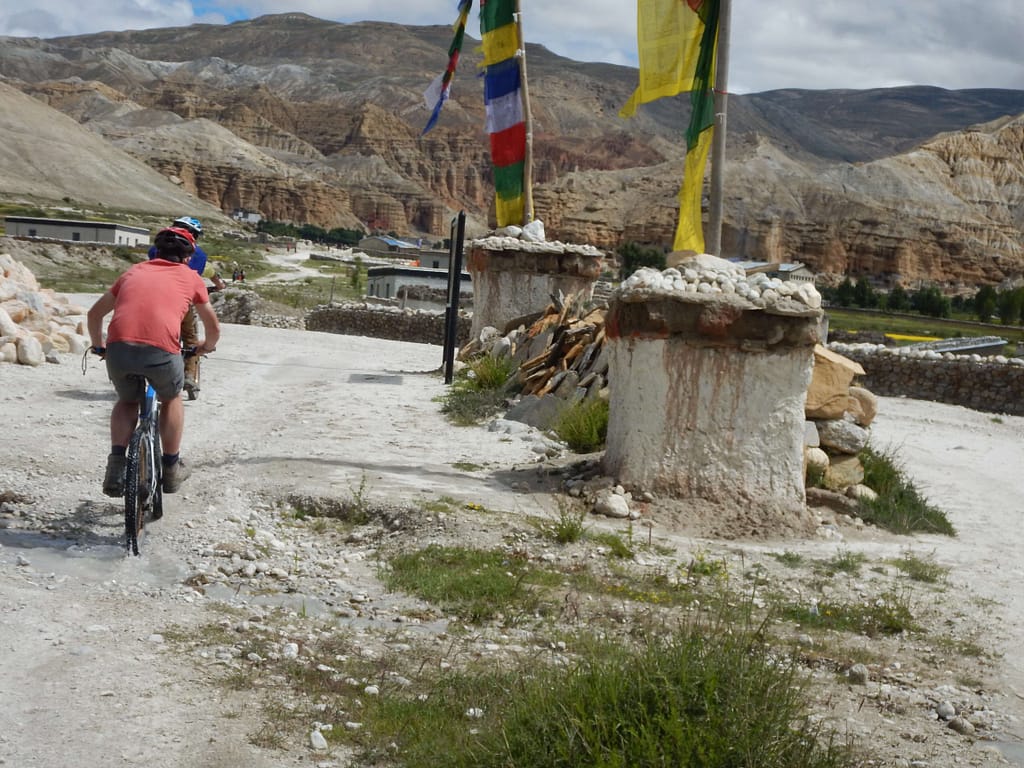 Rond het middaguur gaat het hier nogal te keer qua wind, dus mondkapje voor en labello voor de lippen. Petten verankeren dus. Dit “windfenomeen” treedt elke dag op in het lower-mustang gebied nabij Jomsom. We vervolgen onze route met een serieuze klim van zo’n 25%, daarna is het veel klimmen en dalen. Een geweldig gebied. We merken goed dat de lucht al wat ijler wordt. Dus de ademhalingsfrequentie kan omhoog. Ook niet gek want we starten in Jomson op ongeveer 1700 meter en slapen in Chhusang op zo’n 2900 meter, klein beetje is dat wel voelbaar (draaierig). Erg rustig gebied, enkele jeeps, paarden en ezels veel meer komen we hier niet tegen. Wel gaaf dat we 12 gieren zagen zitten in de rivierbedding.