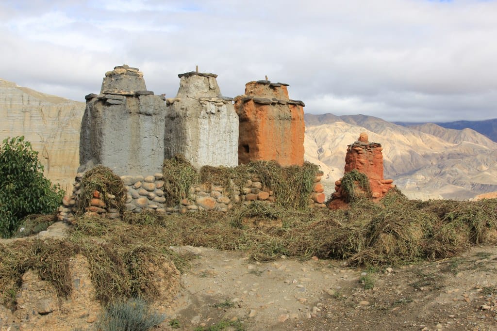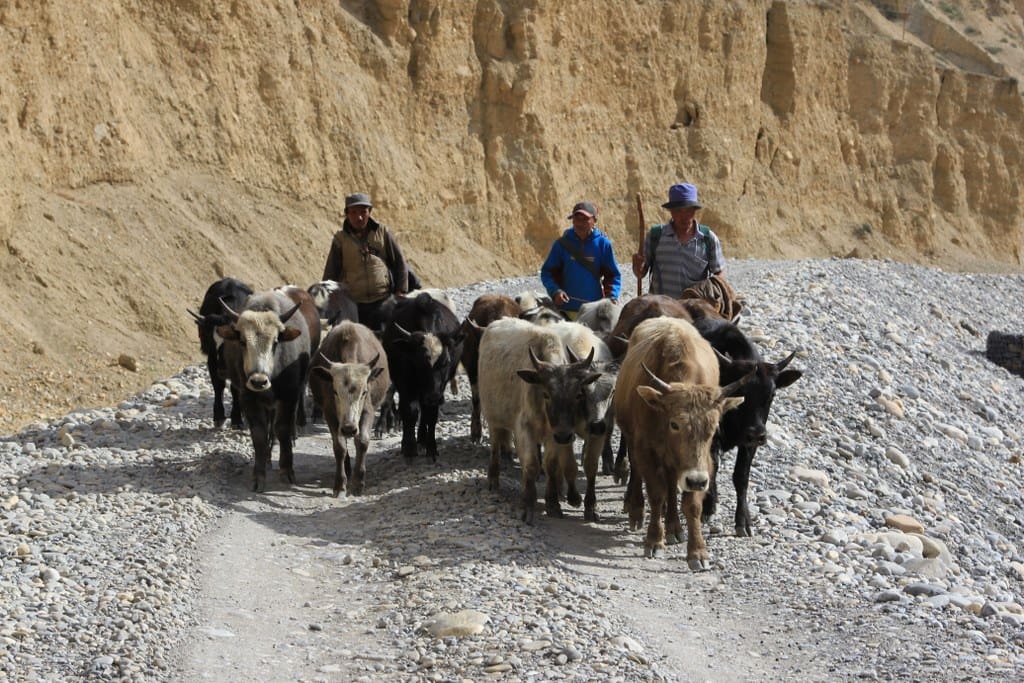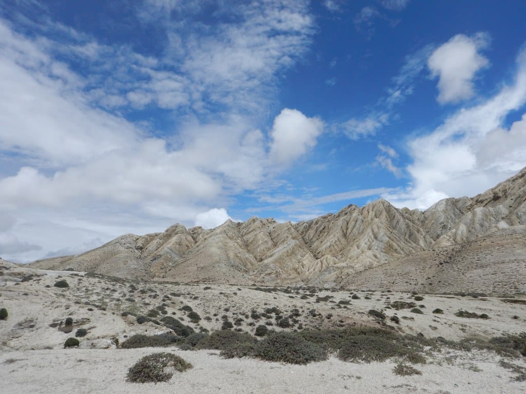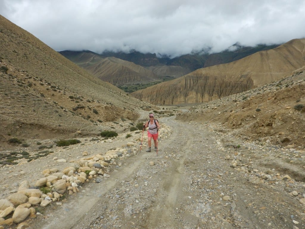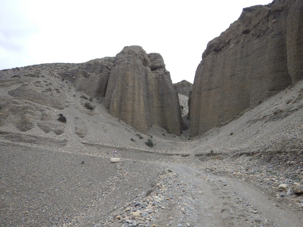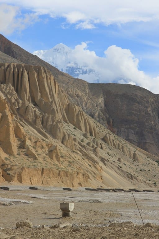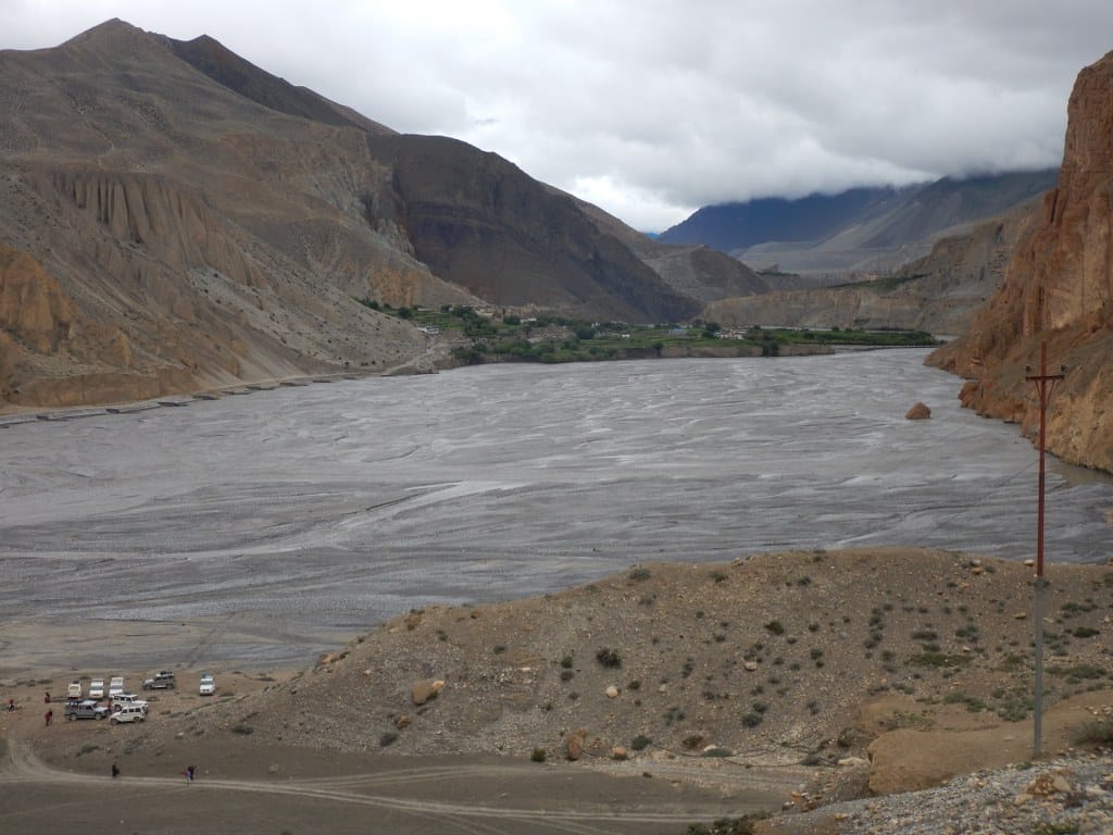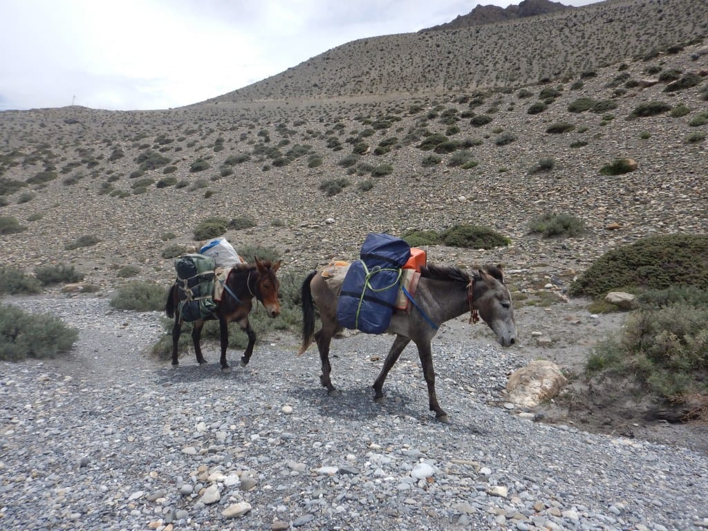 Rond het middaguur gaat het hier nogal te keer qua wind, dus mondkapje voor en labello voor de lippen. Petten verankeren dus. Dit “windfenomeen” treedt elke dag op in het lower-mustang gebied nabij Jomsom. We vervolgen onze route met een serieuze klim van zo’n 25%, daarna is het veel klimmen en dalen. Een geweldig gebied. We merken goed dat de lucht al wat ijler wordt. Dus de ademhalingsfrequentie kan omhoog. Ook niet gek want we starten in Jomson op ongeveer 1700 meter en slapen in Chhusang op zo’n 2900 meter, klein beetje is dat wel voelbaar (draaierig). Erg rustig gebied, enkele jeeps, paarden en ezels veel meer komen we hier niet tegen. Wel gaaf dat we 12 gieren zagen zitten in de rivierbedding.