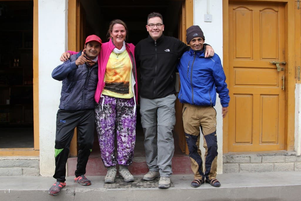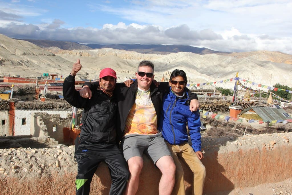 8 augustus: Goedemorgen Muktinath! We staan tijdig op want we gaan als eerste de Monastery bezoeken. Een erg heilige en belangrijke plaats voor Boeddhisten en Hindoeïsten over heel Tibet, Nepal en India. Die komen hier regelmatig naar toe. Voor iedereen is het belangrijk hier minimaal een maal in hun leven te zijn geweest. Gelukkig zijn we niet alleen, een aantal mensen uit India zijn naar Muktinath afgereisd. Voor hun is het geen probleem dat wij wat filmen en fotograferen, dit levert ons enkele leuke beelden op. Erg bijzonder om te zien wat Muktinath betekent voor veel mensen. Even op de foto met “onze” Binod en Bhim, ons Trekking team!