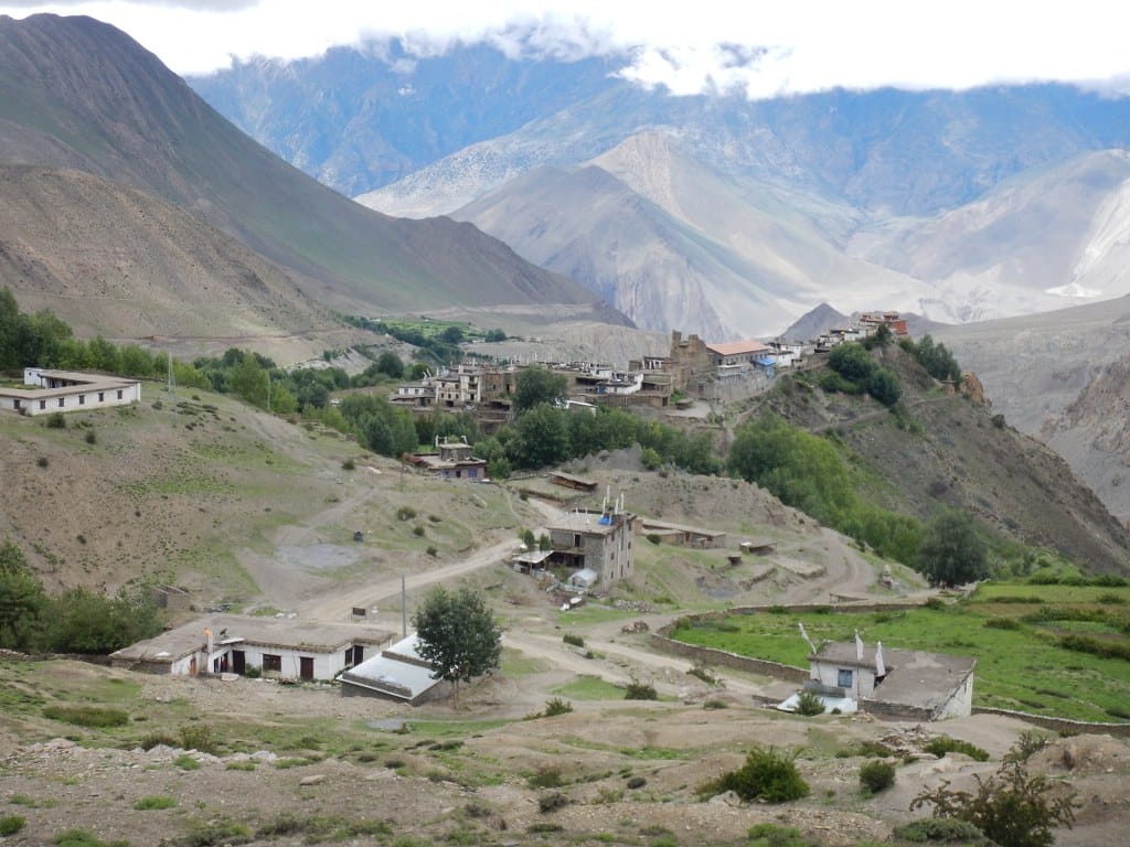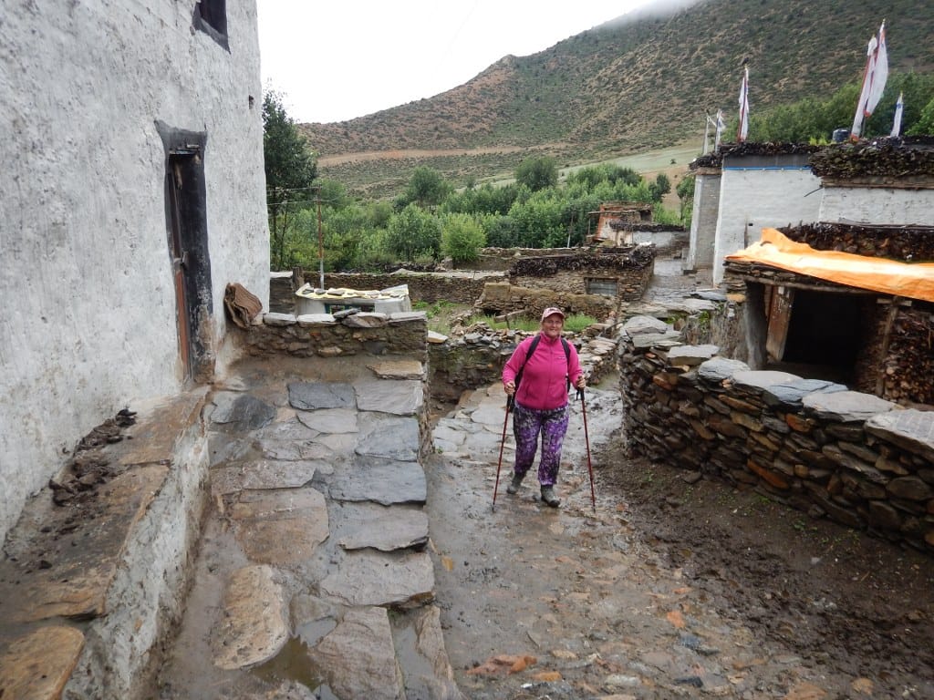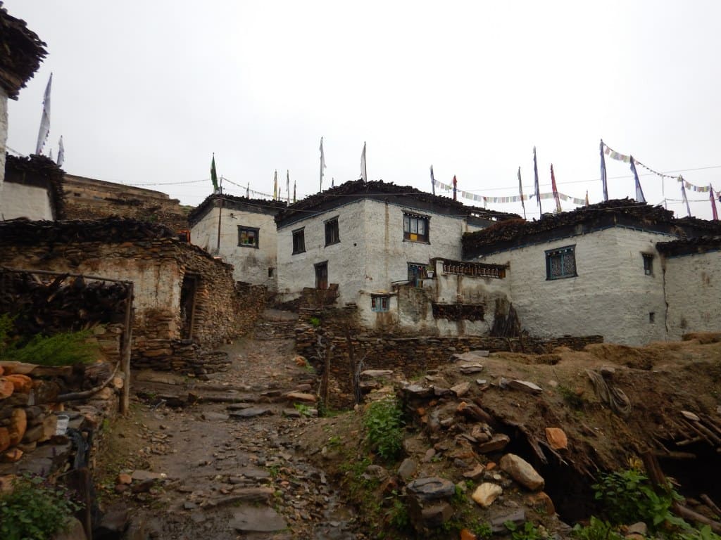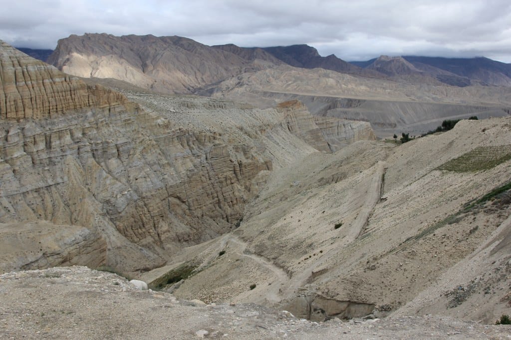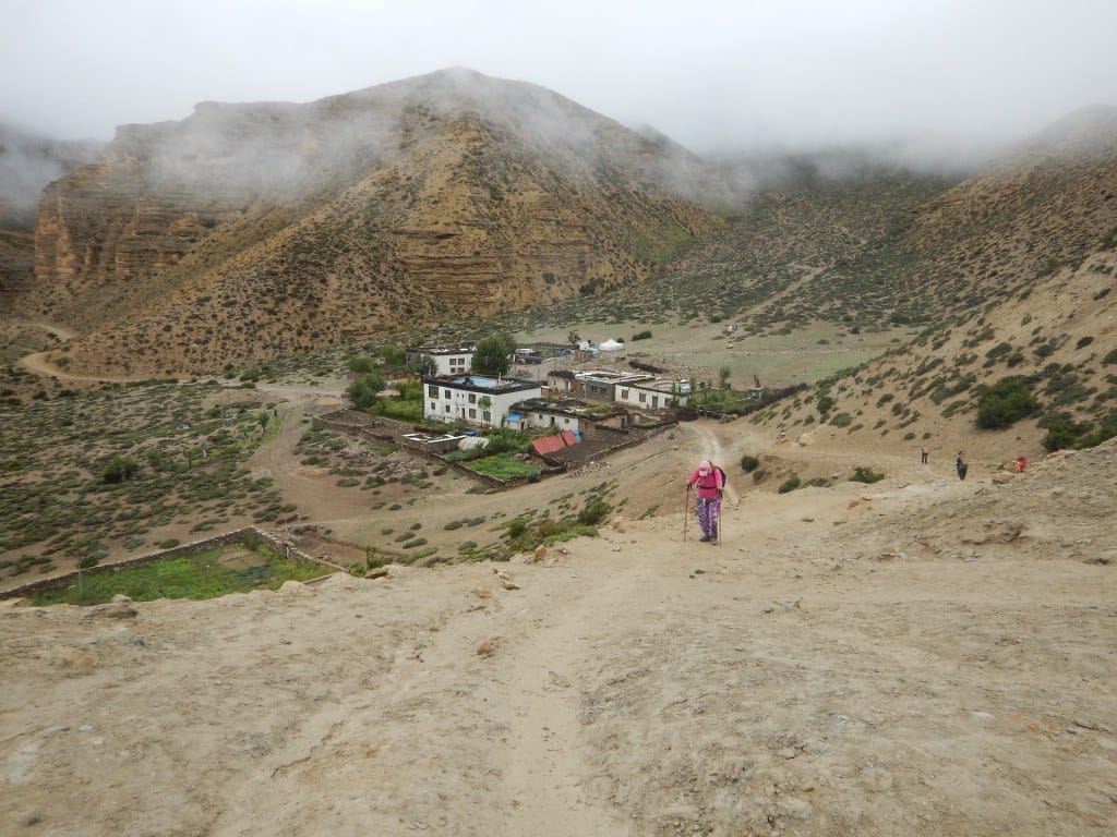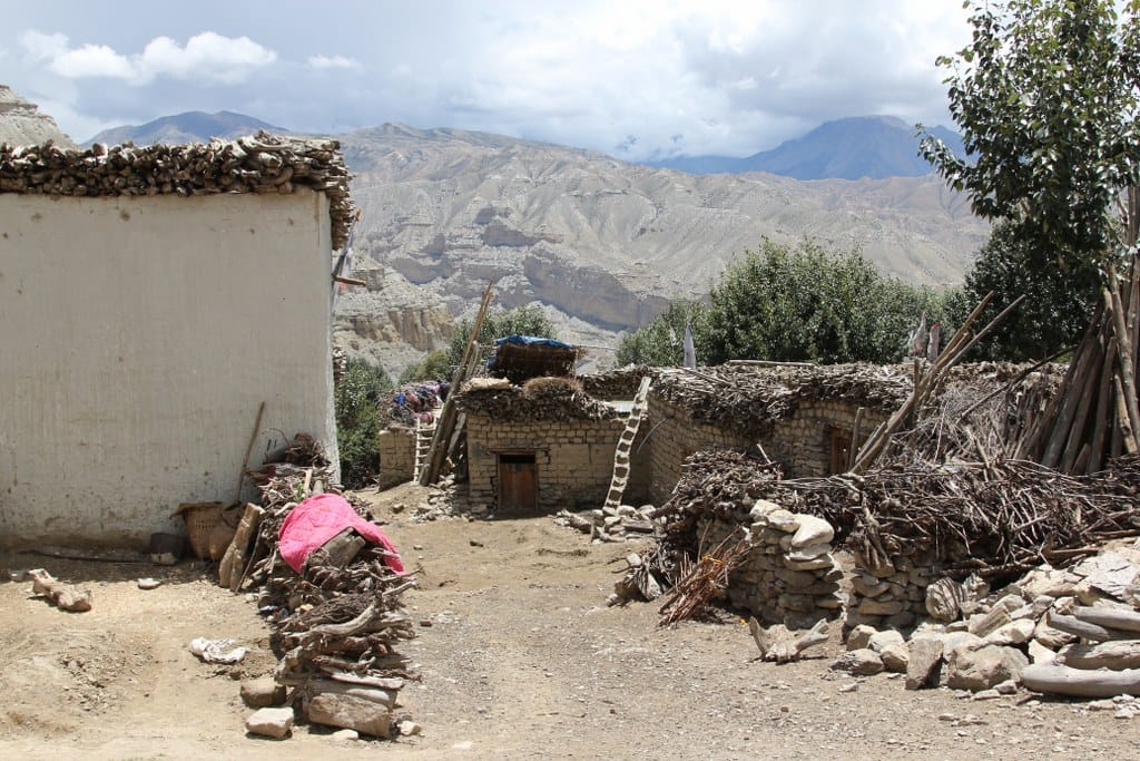 1 augustus: “Goedemorgen” Syangmochen. Vanuit onze “hut” hebben we de eerste nacht op 3775 meter overleefd, alhoewel we wel vaker wakker zijn geworden. Doet toch wel iets slapen op hoogte. Het heeft de gehele nacht geregend, we horen van de eigenaar dat het in heel zijn leven in Upper Mustang nog nooit zoveel heeft geregend. Het regent nu al negen dagen achter elkaar. Aangezien de daken van modder zijn gemaakt, beginnen nu alle huizen te lekken. Al het plastic wat voorhanden is, is dus noodzakelijk en daarbij wordt er meer modder uit de grond gehaald om extra deklagen aan te brengen. Na het havermout ontbijt, wederom in de keuken, vertrekken we naar Ghami. Eerlijk is eerlijk, dit is tot op heden wel het meest basic wat we tot op heden hebben meegemaakt. Met natte schoenen aan (lang leve de landslides) zijn we weer onderweg. De trekking goes on……. We krijgen meteen een goede opwarmer, want we moeten meteen stijl omhoog.