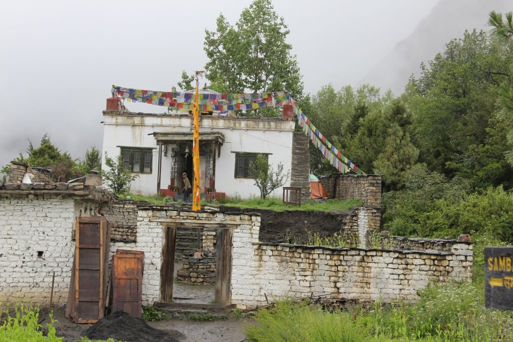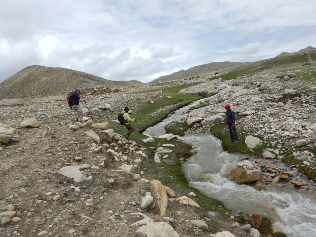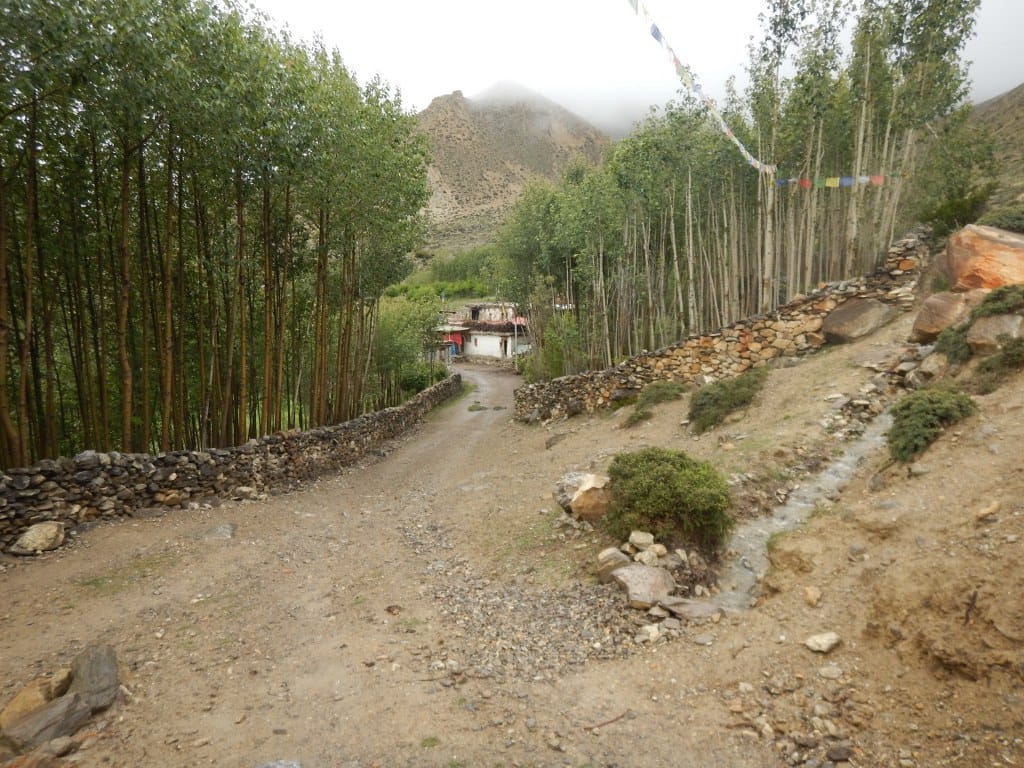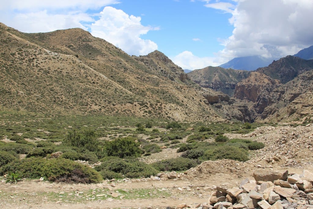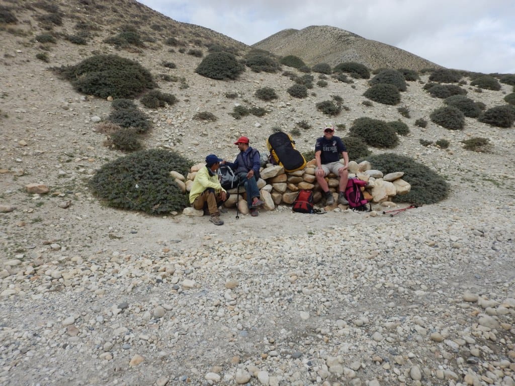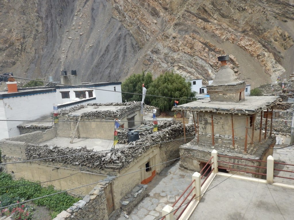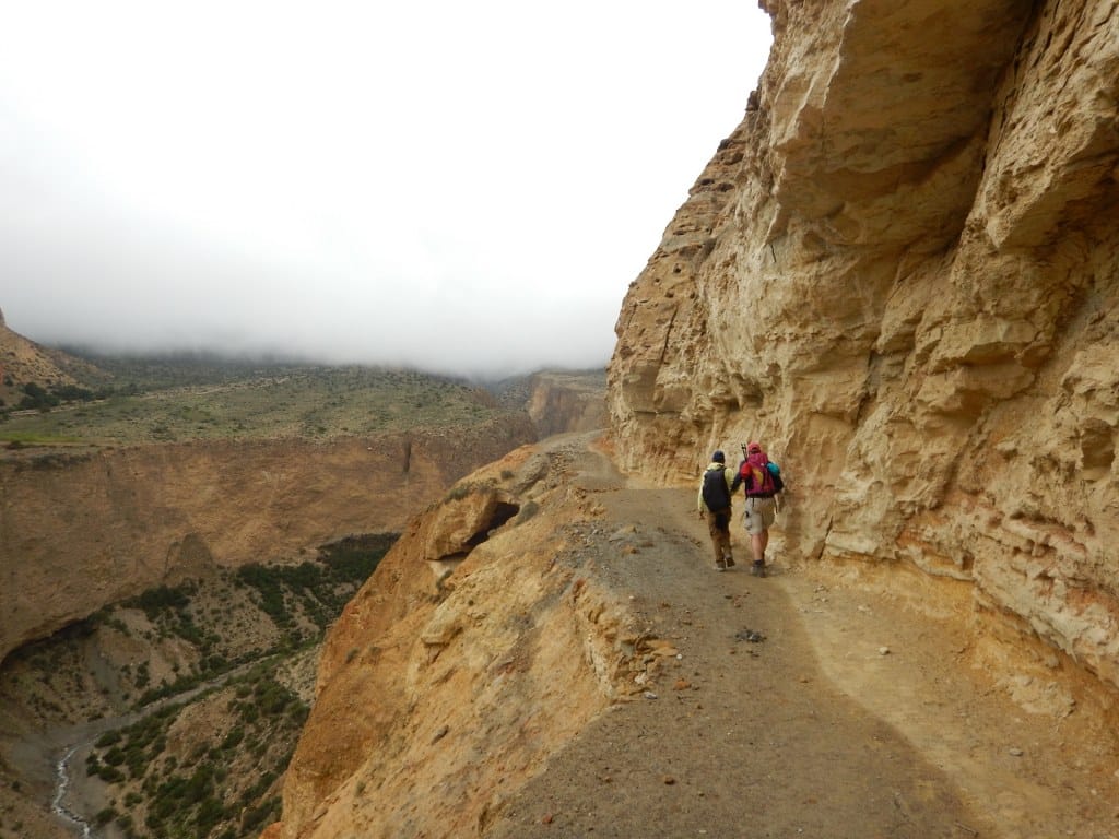 1 augustus: “Goedemorgen” Syangmochen. Vanuit onze “hut” hebben we de eerste nacht op 3775 meter overleefd, alhoewel we wel vaker wakker zijn geworden. Doet toch wel iets slapen op hoogte. Het heeft de gehele nacht geregend, we horen van de eigenaar dat het in heel zijn leven in Upper Mustang nog nooit zoveel heeft geregend. Het regent nu al negen dagen achter elkaar. Aangezien de daken van modder zijn gemaakt, beginnen nu alle huizen te lekken. Al het plastic wat voorhanden is, is dus noodzakelijk en daarbij wordt er meer modder uit de grond gehaald om extra deklagen aan te brengen. Na het havermout ontbijt, wederom in de keuken, vertrekken we naar Ghami. Eerlijk is eerlijk, dit is tot op heden wel het meest basic wat we tot op heden hebben meegemaakt. Met natte schoenen aan (lang leve de landslides) zijn we weer onderweg. De trekking goes on……. We krijgen meteen een goede opwarmer, want we moeten meteen stijl omhoog.