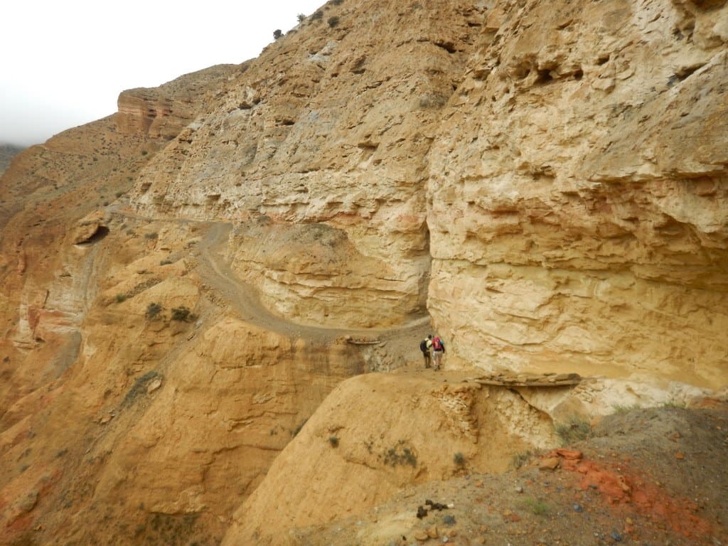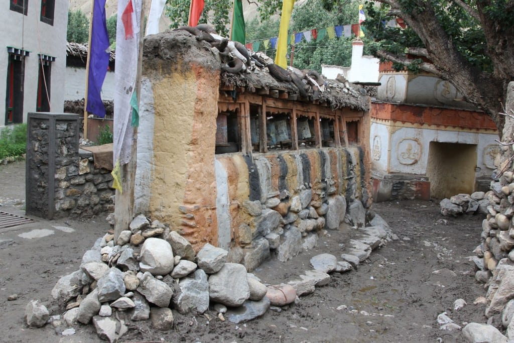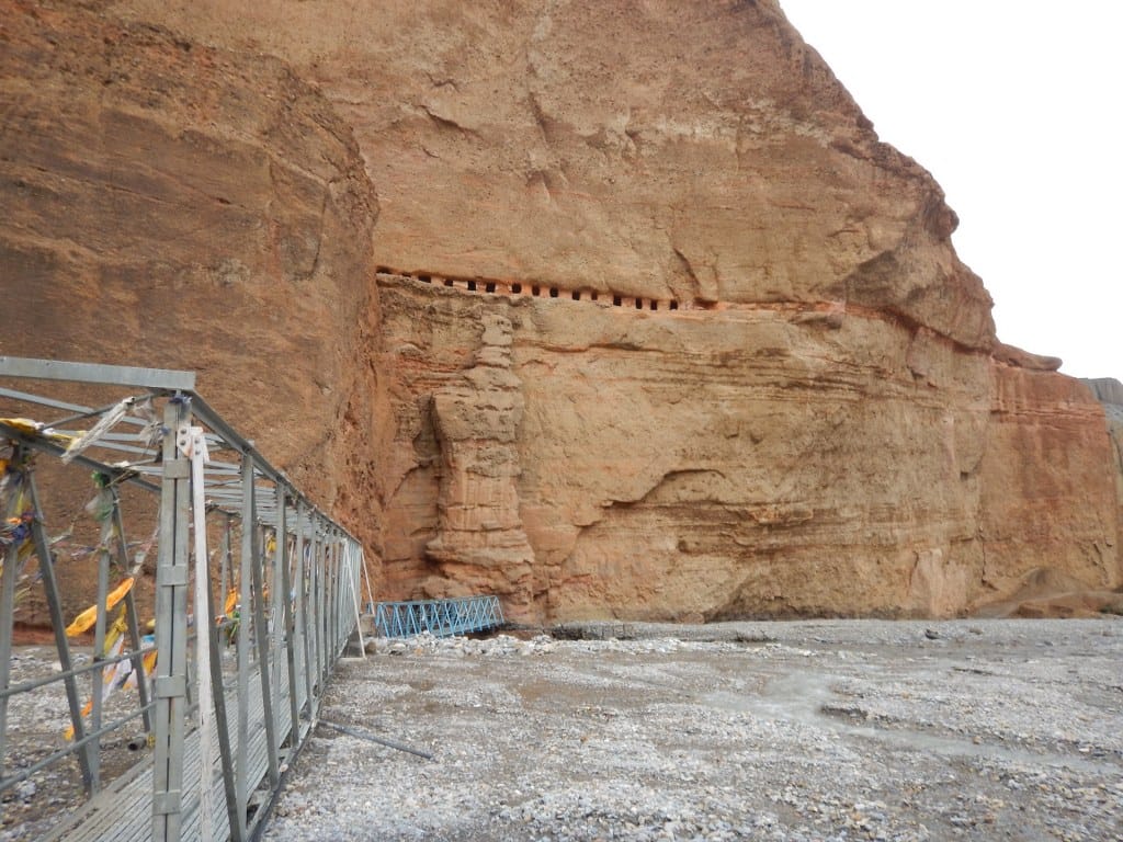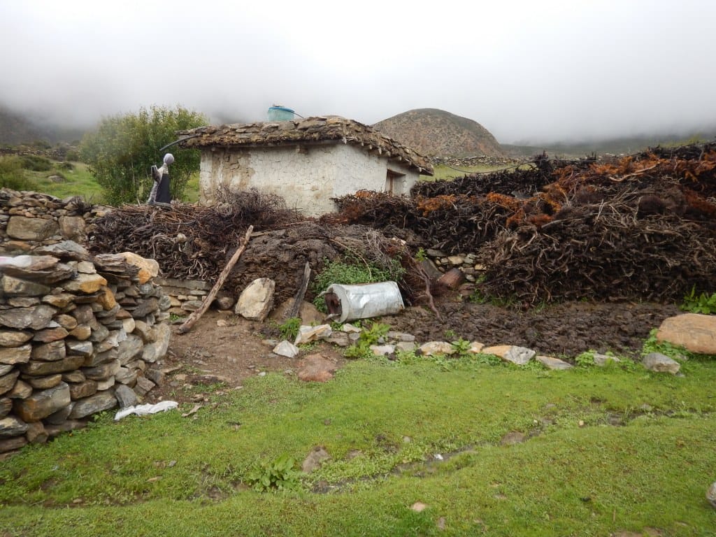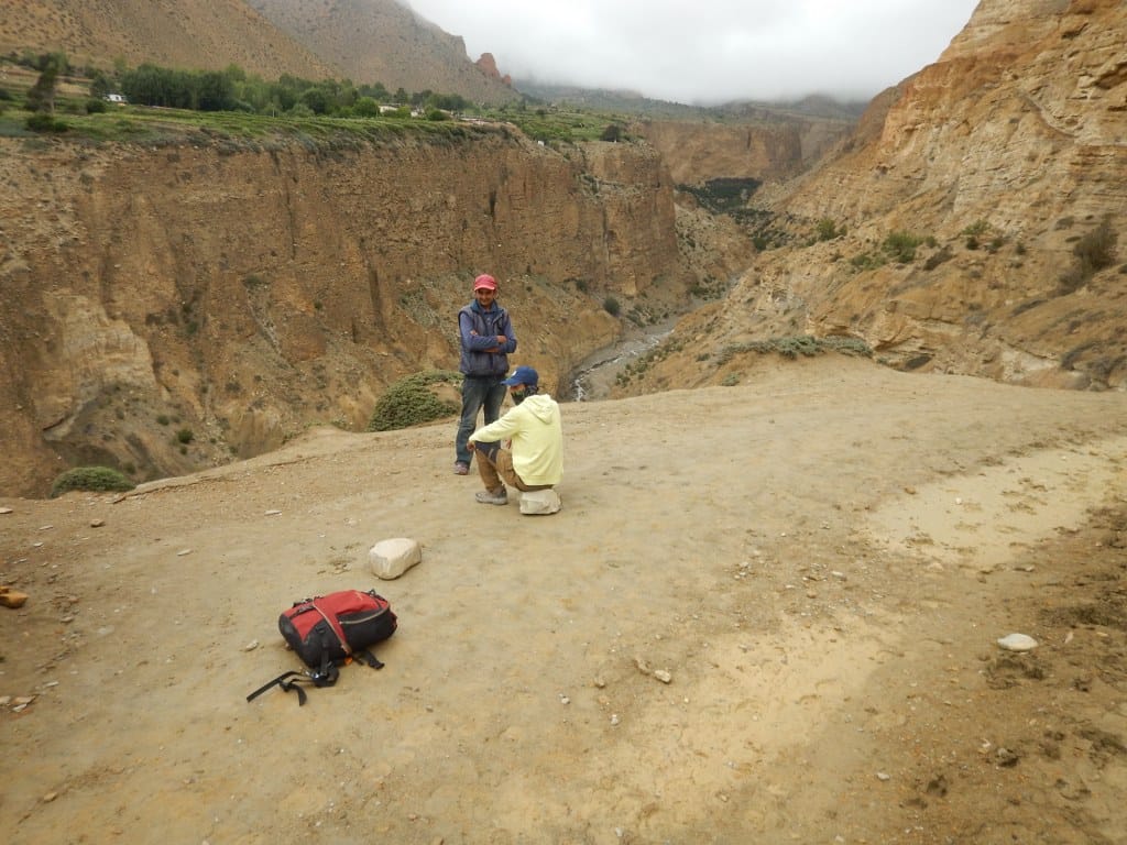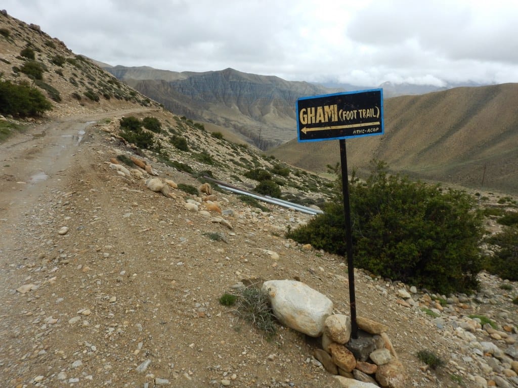 1 augustus: “Goedemorgen” Syangmochen. Vanuit onze “hut” hebben we de eerste nacht op 3775 meter overleefd, alhoewel we wel vaker wakker zijn geworden. Doet toch wel iets slapen op hoogte. Het heeft de gehele nacht geregend, we horen van de eigenaar dat het in heel zijn leven in Upper Mustang nog nooit zoveel heeft geregend. Het regent nu al negen dagen achter elkaar. Aangezien de daken van modder zijn gemaakt, beginnen nu alle huizen te lekken. Al het plastic wat voorhanden is, is dus noodzakelijk en daarbij wordt er meer modder uit de grond gehaald om extra deklagen aan te brengen. Na het havermout ontbijt, wederom in de keuken, vertrekken we naar Ghami. Eerlijk is eerlijk, dit is tot op heden wel het meest basic wat we tot op heden hebben meegemaakt. Met natte schoenen aan (lang leve de landslides) zijn we weer onderweg. De trekking goes on……. We krijgen meteen een goede opwarmer, want we moeten meteen stijl omhoog.
