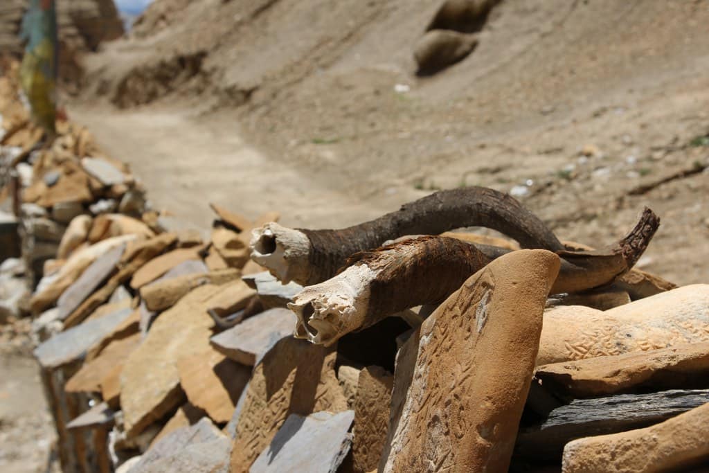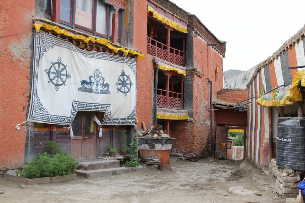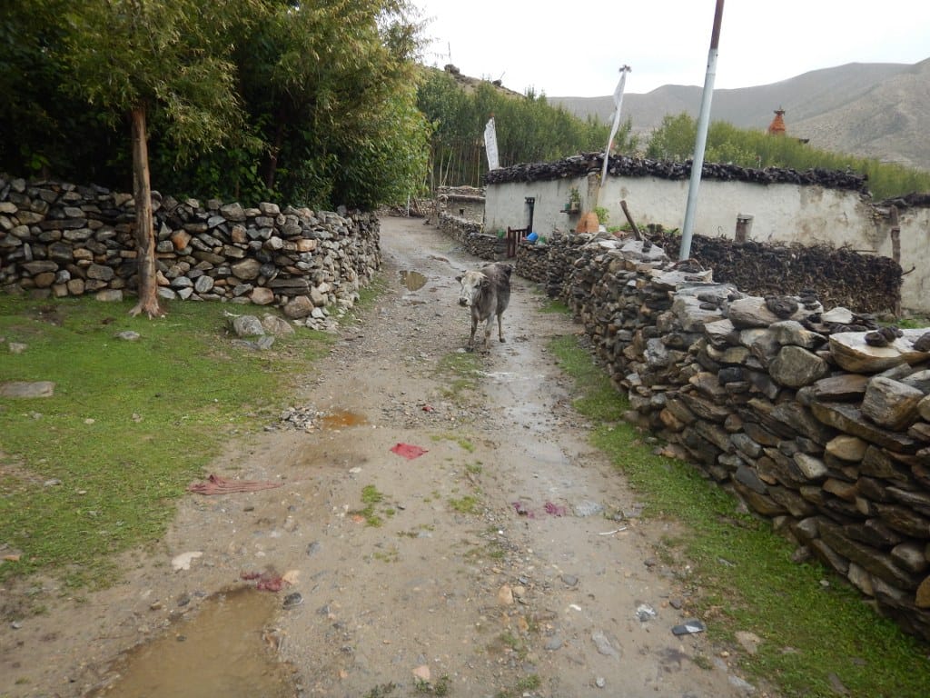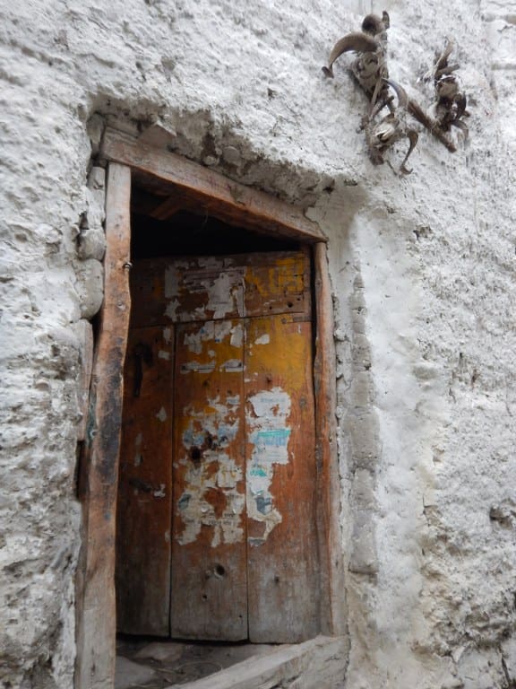 31 juli: Goedemorgen Chhusang! Ontbijt om 07.00 uur met een heerlijke havermout met appeltjes, noemen ze hier Porridge.Tegen de klok van 08.00 uur gaan we van start met onze route naar Syangmochen. We lopen door Chhusang weer de wijde wereld van Mustang in. Mensen hangen een ossekop bij de deur om de geesten weg te houden.