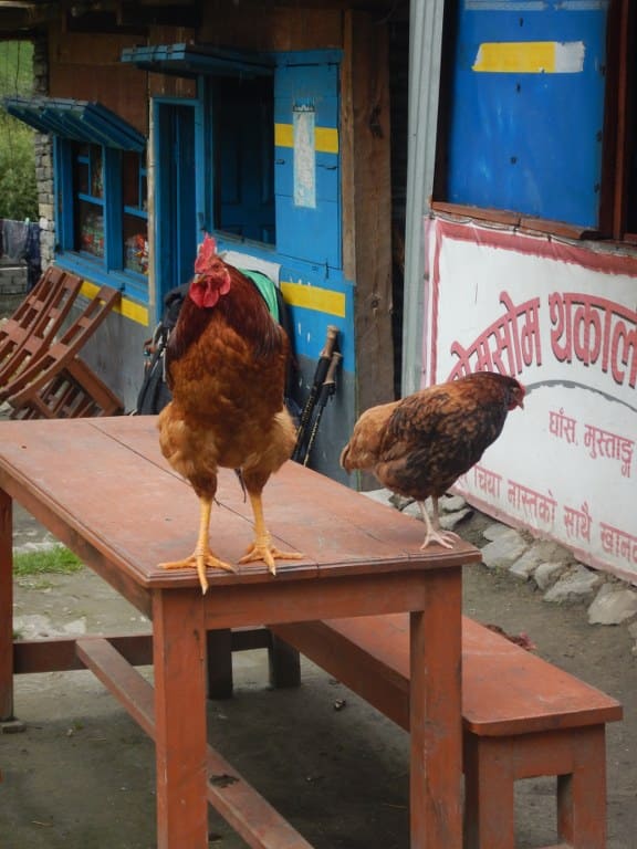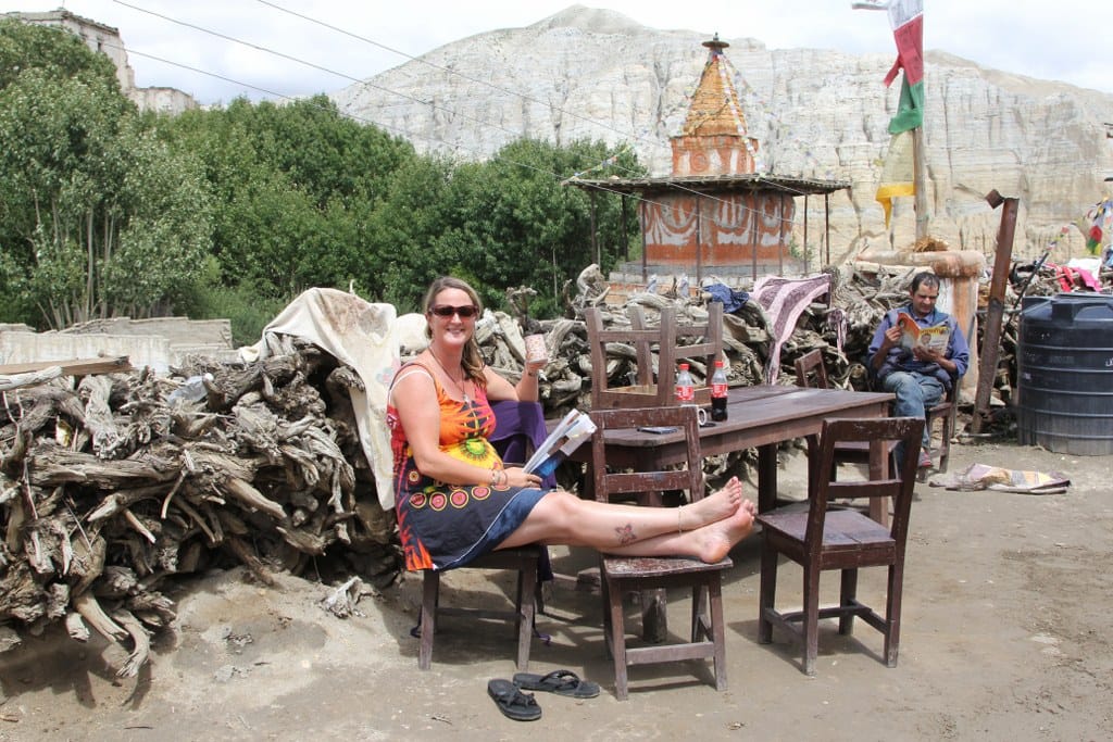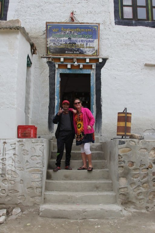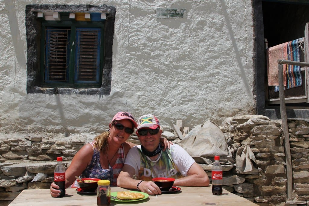 Koffie bij de Yak Donalds, samen met onze gids Binod. Wederom een goed gesprek over Nepal en alle facetten rondom donaties e.d. Interessant en we leren steeds meer van dit schitterende land! Jolanda gaat nog ff plat, we zijn weer 700 meter gedaald maar nog aantal op 2800 meter. Ook van het dalen kun je wat misselijk zijn. Ruudje heeft er wat minder last van en drinkt een lekker koud Tuborg biertje (750 cl), terwijl wat laptop werk. We hadden hier acht dagen geleden een redelijke goede Wifi, echter nu is heel Kagbeni afgesloten van internet. Tja, zo gaat dat hier kennelijk. Niemand maakt zich er druk over en de mail kan nog wel een dagje wachten. Tis toch nie anders…….