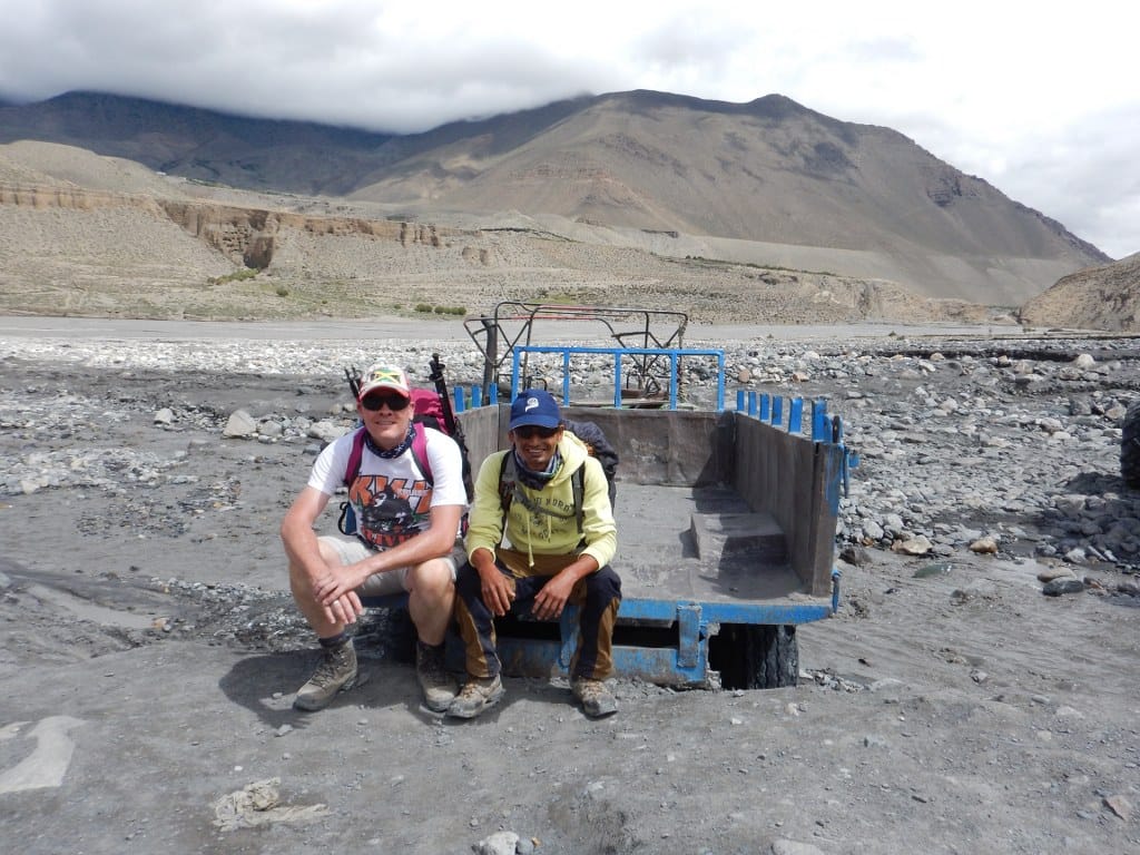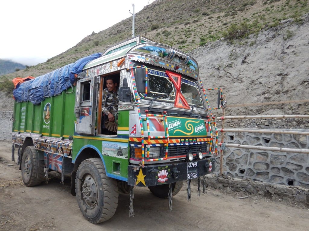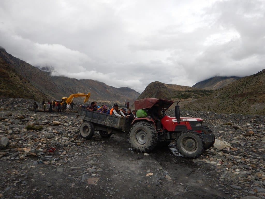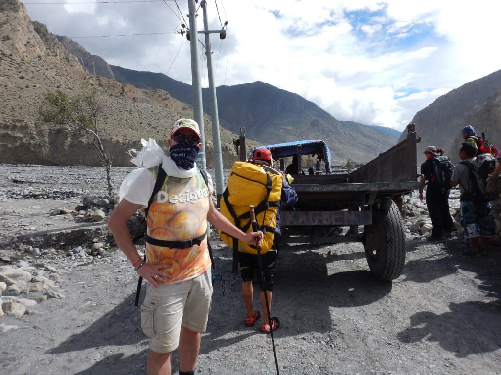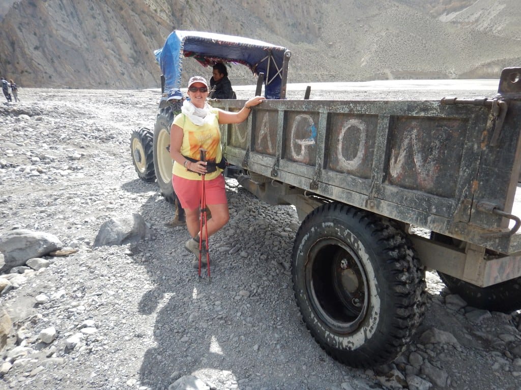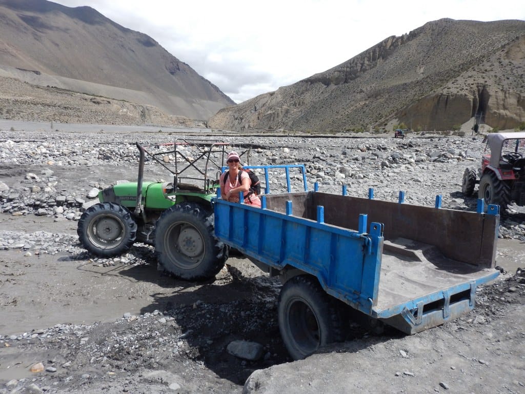 We zijn bijna in Jomsom en dan blijkt plotseling de weg, weg te zijn. Vanmorgen was hier nog een brug, nu dus niet meer. We zien een bus staan midden in de rivier, deze staat vast en kan niet meer verder. Geen optie dus om met onze bus hetzelfde te doen. Oplossing is al onderweg! Er komen twee tractors aan om iedereen na de overzijde te rijden, tevens hebben ze al palen bij voor de nieuwe brug. We mogen met z’n allen in de achterbak van een tractor. Veiligheid? Ach ja, ook wij willen naar Jomsom. Aan de andere zijde van de rivier staat al een andere bus te wachten voor het vervolg. Een onvergetelijke ervaring, zeker onze dagmovie even kijken.