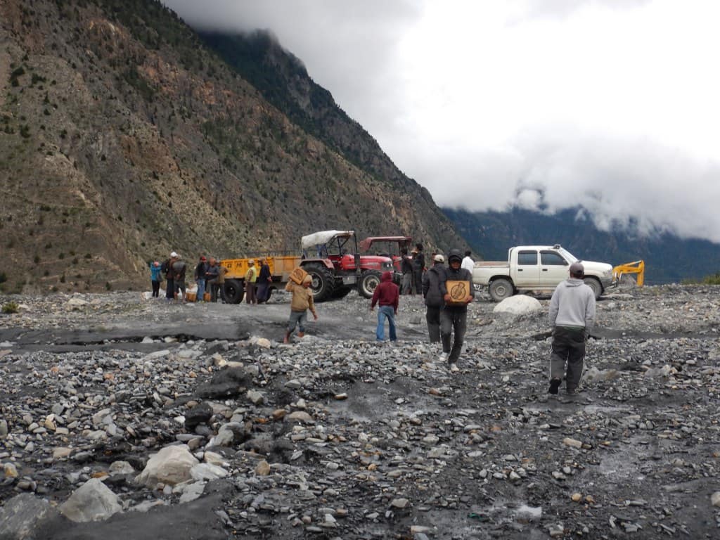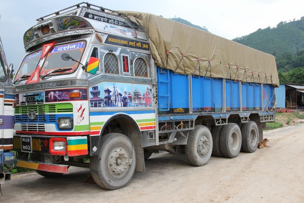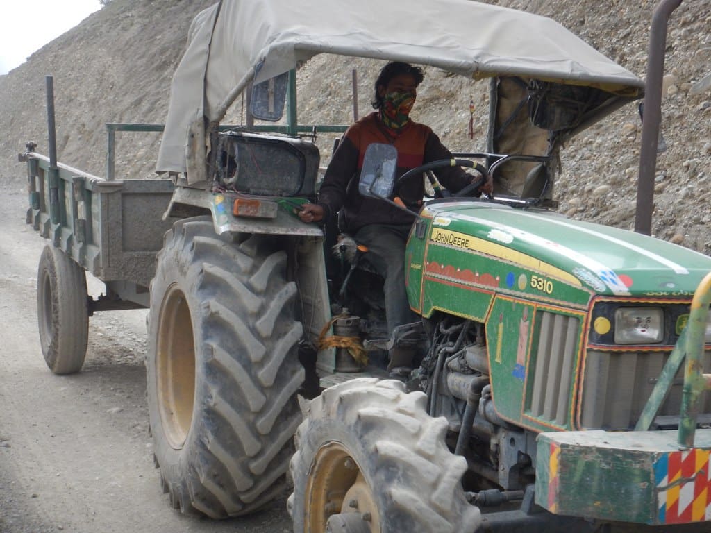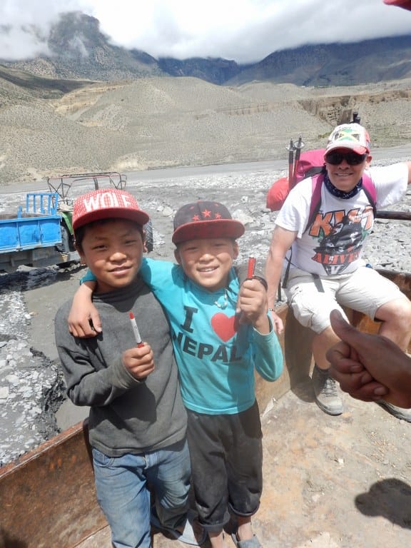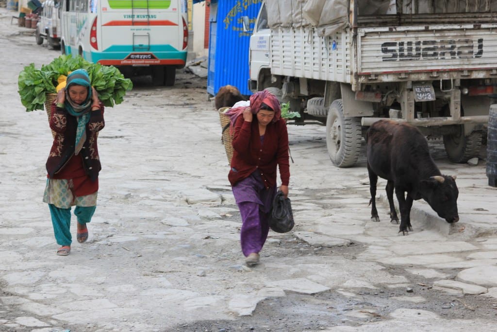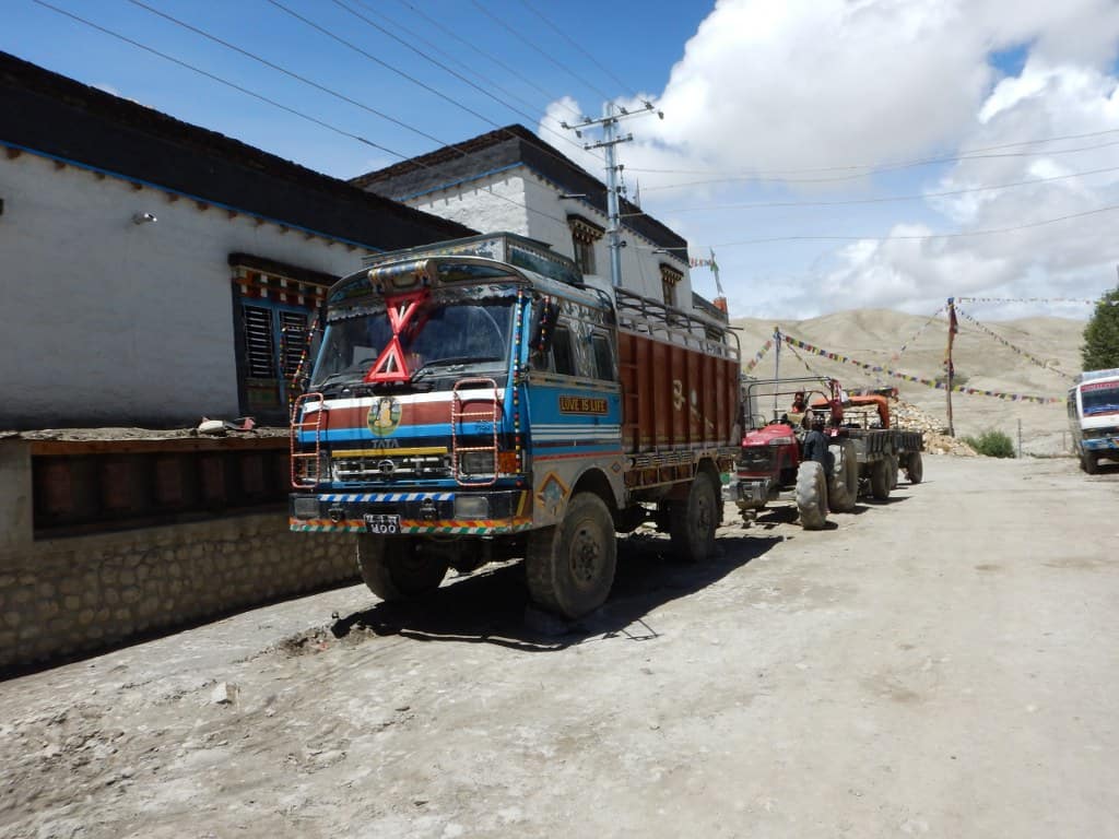 We zijn bijna in Jomsom en dan blijkt plotseling de weg, weg te zijn. Vanmorgen was hier nog een brug, nu dus niet meer. We zien een bus staan midden in de rivier, deze staat vast en kan niet meer verder. Geen optie dus om met onze bus hetzelfde te doen. Oplossing is al onderweg! Er komen twee tractors aan om iedereen na de overzijde te rijden, tevens hebben ze al palen bij voor de nieuwe brug. We mogen met z’n allen in de achterbak van een tractor. Veiligheid? Ach ja, ook wij willen naar Jomsom. Aan de andere zijde van de rivier staat al een andere bus te wachten voor het vervolg. Een onvergetelijke ervaring, zeker onze dagmovie even kijken.