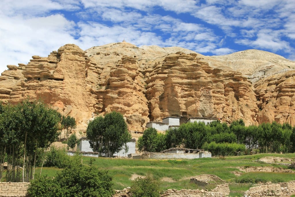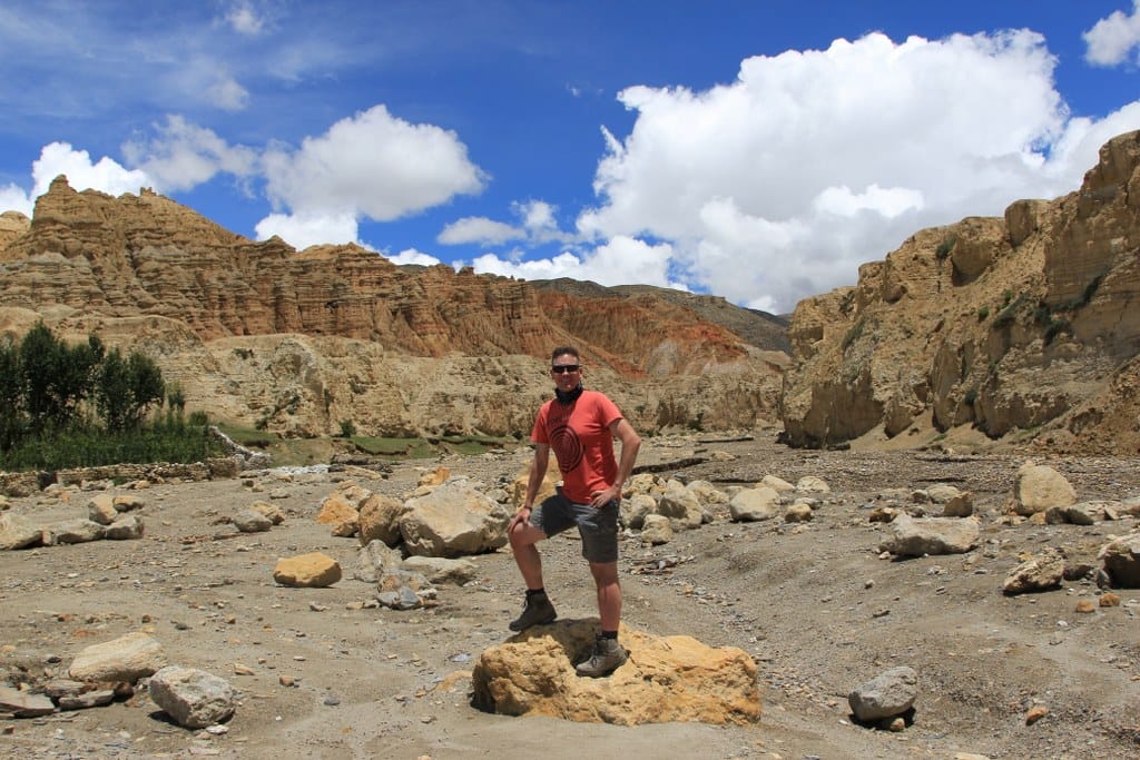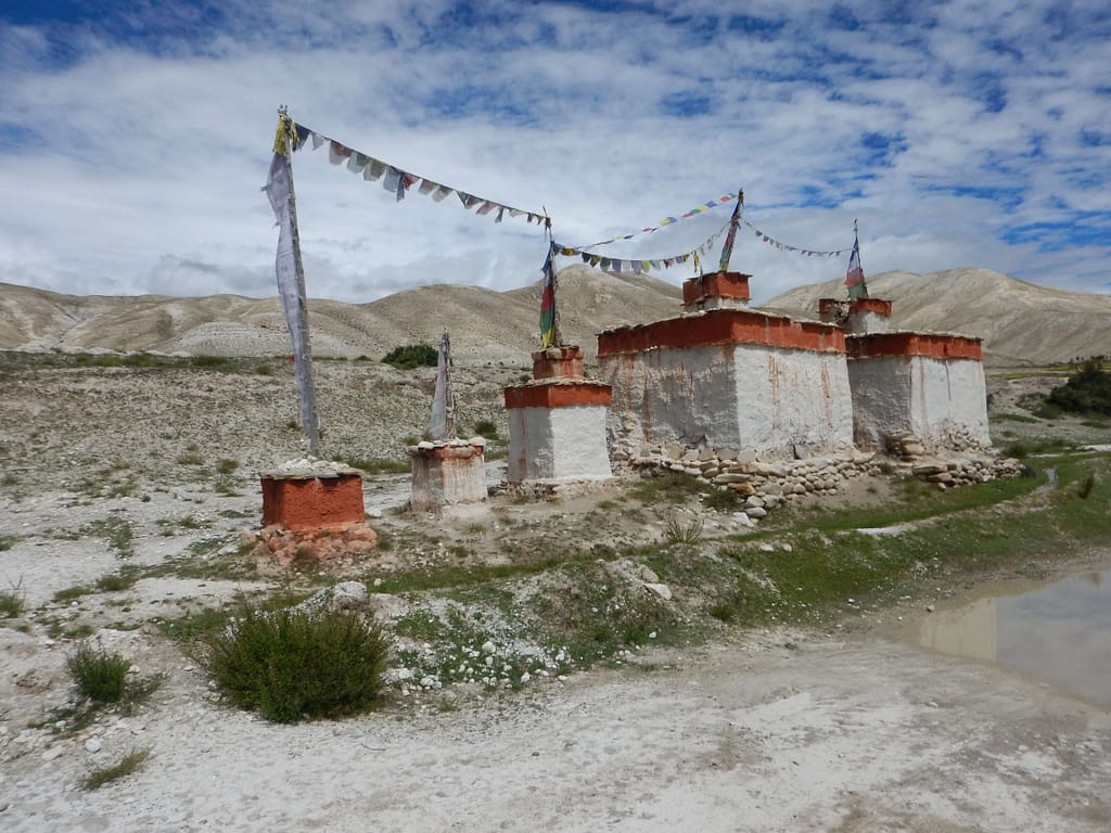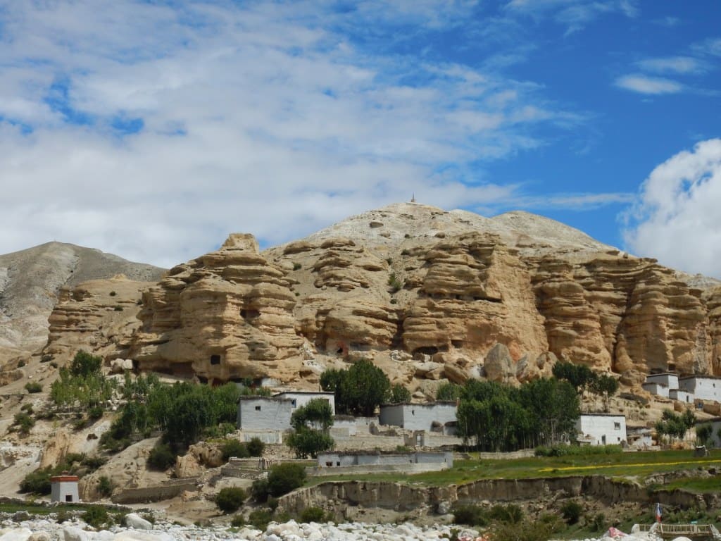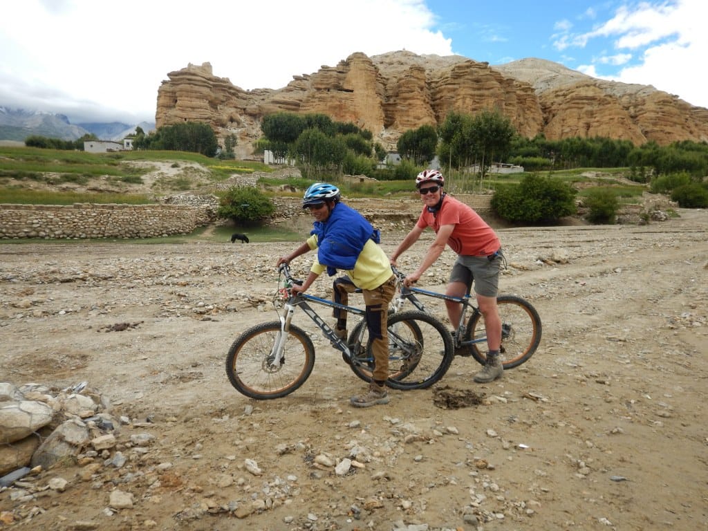 4 Augustus: Goedemorgen Lo Manthang! Lo Manthang is de hoofdstad van het Upper-Mustang district. Weer een nieuwe dag in Upper-Mustang van start. Vandaag gaan we naar Chhoser Vlei, Binod en Ruud op de Mountainbike en Jolanda met het paard. Nadat alles in gereedheid is gebracht zijn we van start. Binod en Ruud mogen als eerste gaan wandelen, gaat na Lo Manthang zo steil omhoog dat is niet te fietsen. Het paard van Jolanda heeft er iets minder moeite mee. Daarna is het gassen geblazen, stukken op en stukken neer, genieten. Wel opletten want de wegen zijn niet vlak en redelijke gevaarlijk. Prachtig weer vandaag, zelfs enkele schitterende pieken van het Himalaya duiken op. Binod en Ruud zijn iets eerder in Chhoser dan Jolanda, de fiets is toch iets sneller. Zeker in het tempo waarin we fietsen en de risico’s die we nemen, toch van belang om goed op te letten want hier vallen dan duurt het lang voor je bij een dokter of ziekenhuis bent!
