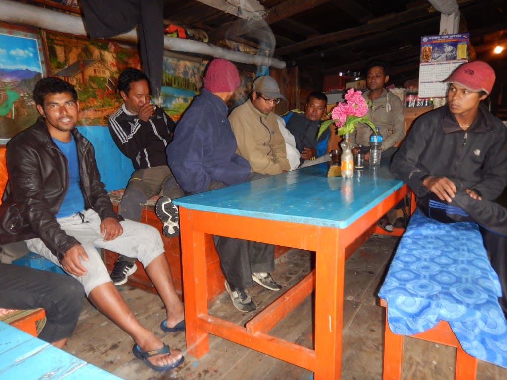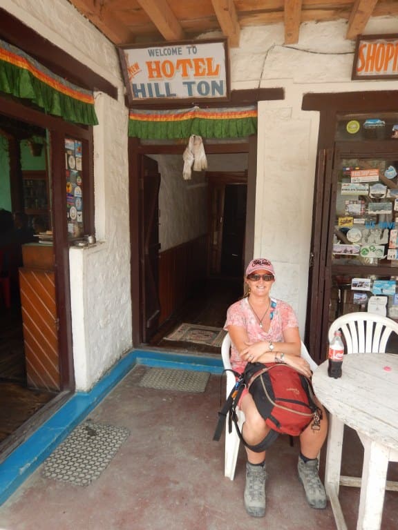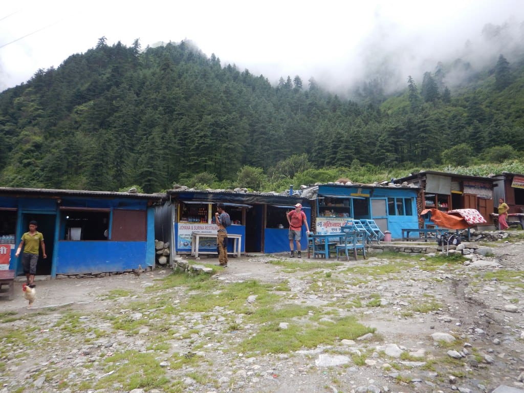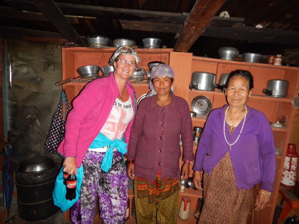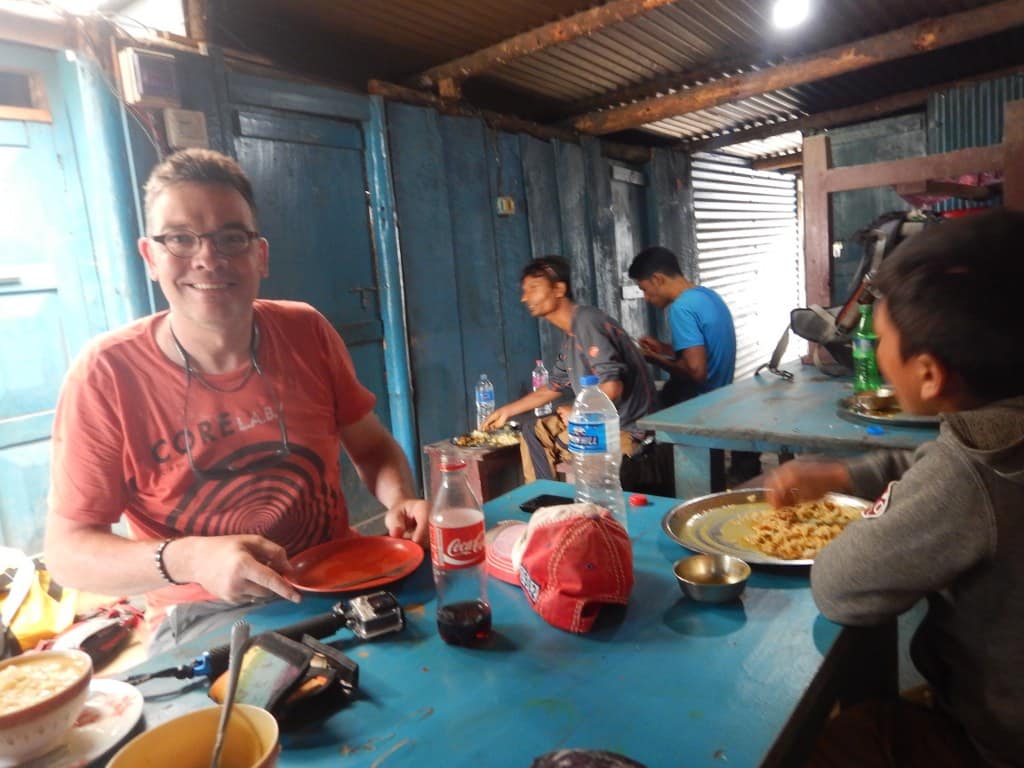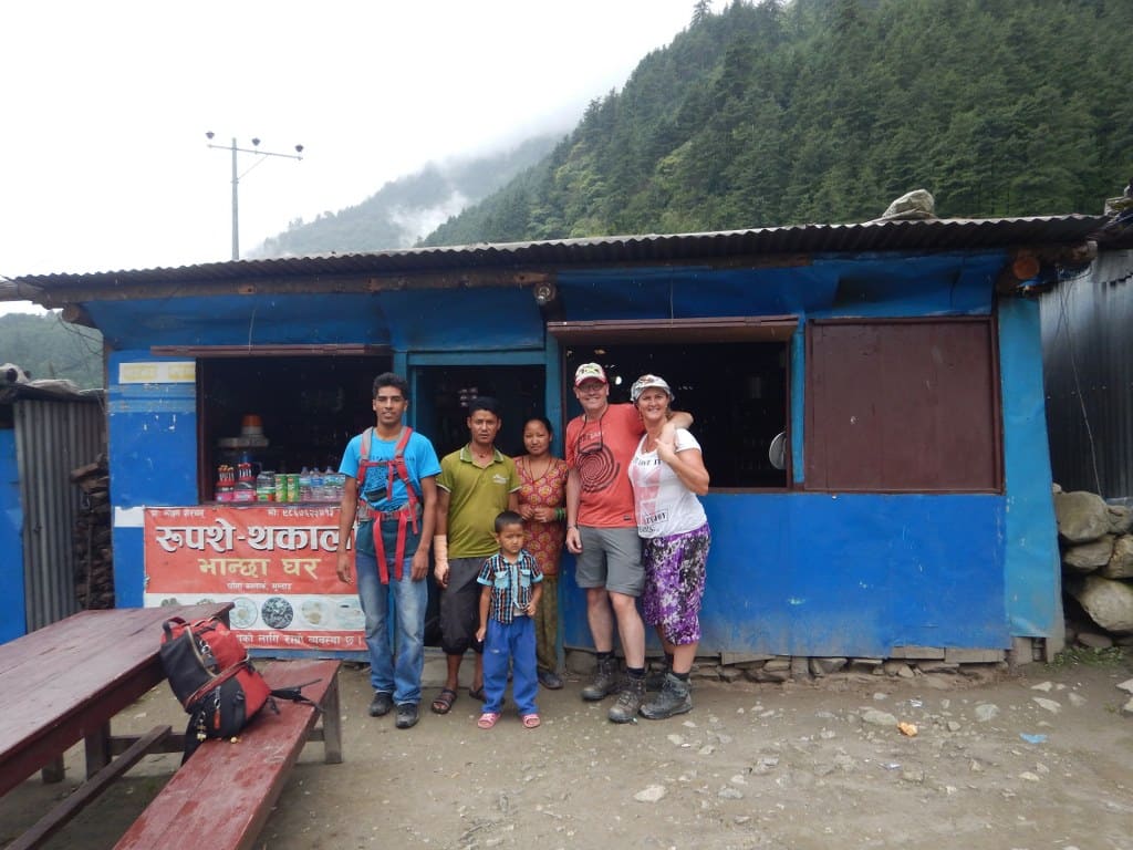 Rond 17.00 uur komen we aan bij onze Guesthouse/hotel. Nilgiri Guest House & Restaurant, zie ook: www.wijhebbengeenwebsiteindebergenvannepal.com. We mogen even gebruik maken van de “Bath-Room”, helaas geen warm water…. Na zo’n zware dag, en je benen vol modder, zou een lekkere warme douche wel welkom zijn, ook voor de reuk trouwens! Tja, tis nie anders. We kunnen ons wat opfrissen en dat is ook genoeg ook. We hebben een zeer primitief kamertje, geen elektriciteit en water. Twee planken met een matrasje er op en een eigen gat in de kamer, oftewel wc….. We mogen ’s avond bij deze familie in de keuken mee eten. Echt een hele leuke ervaring na een pittige dag. We gaan lekker rond 21.00 uur plat. Vandaag was de zonnebrand en zonnebril niet echt noodzakelijk.