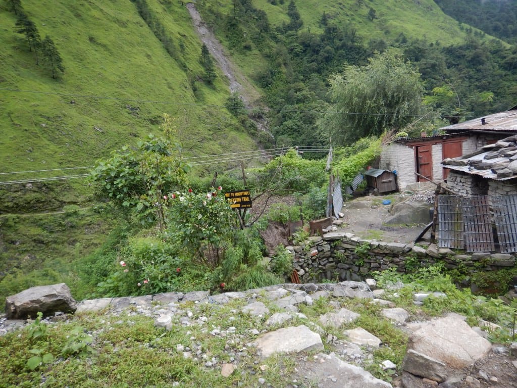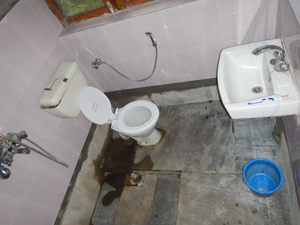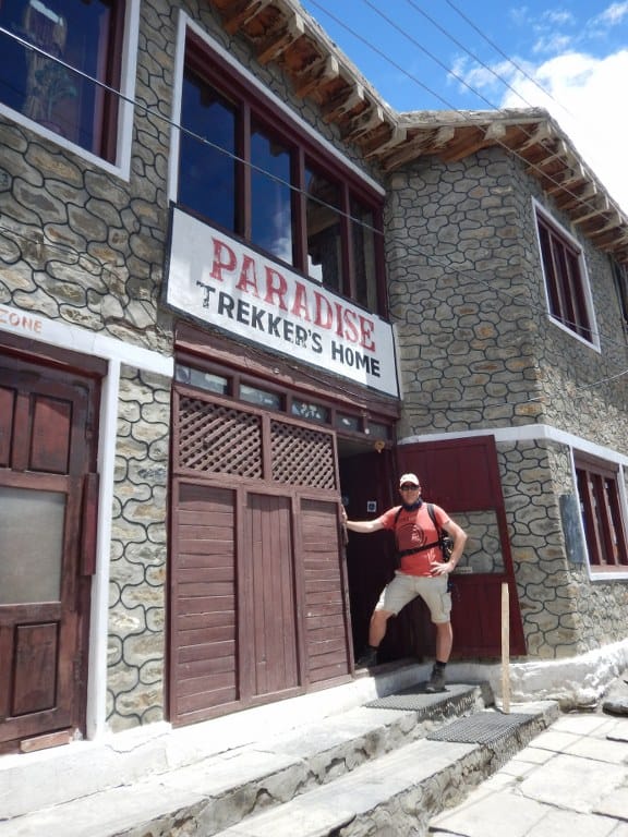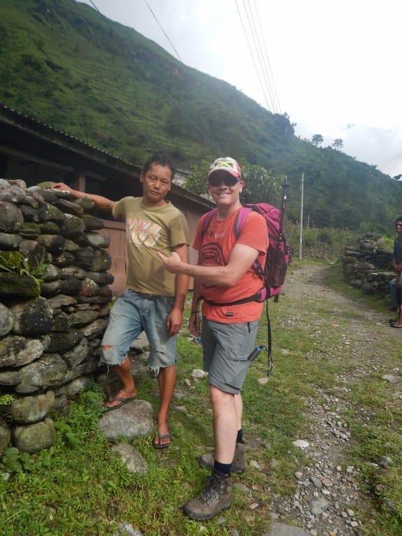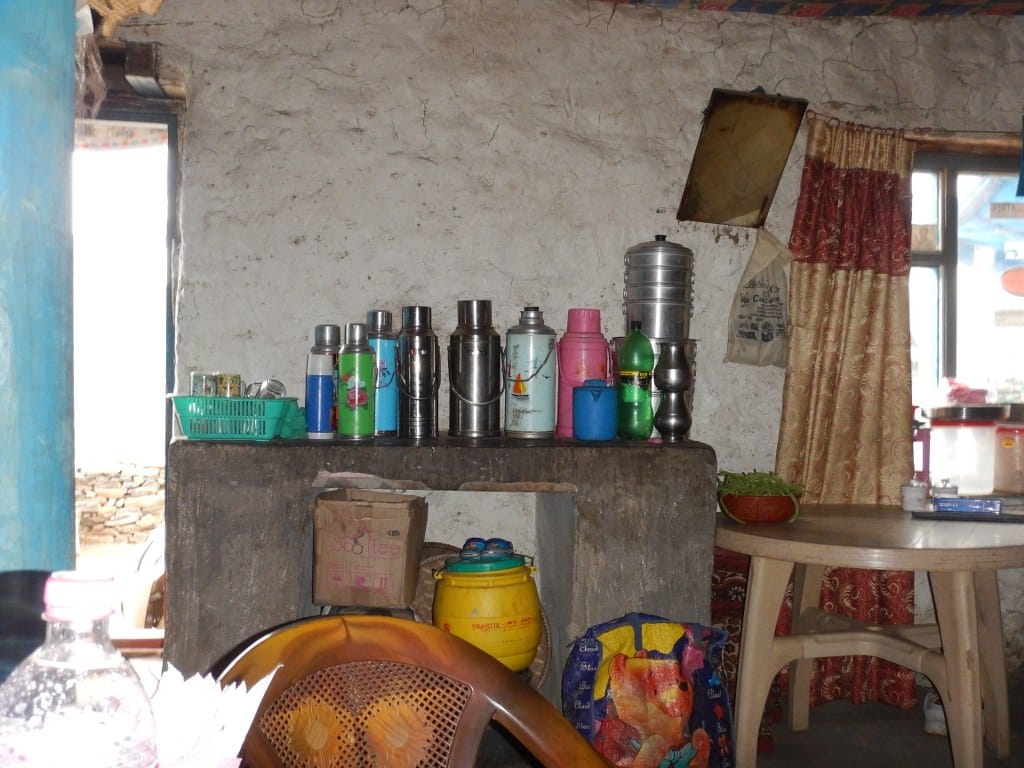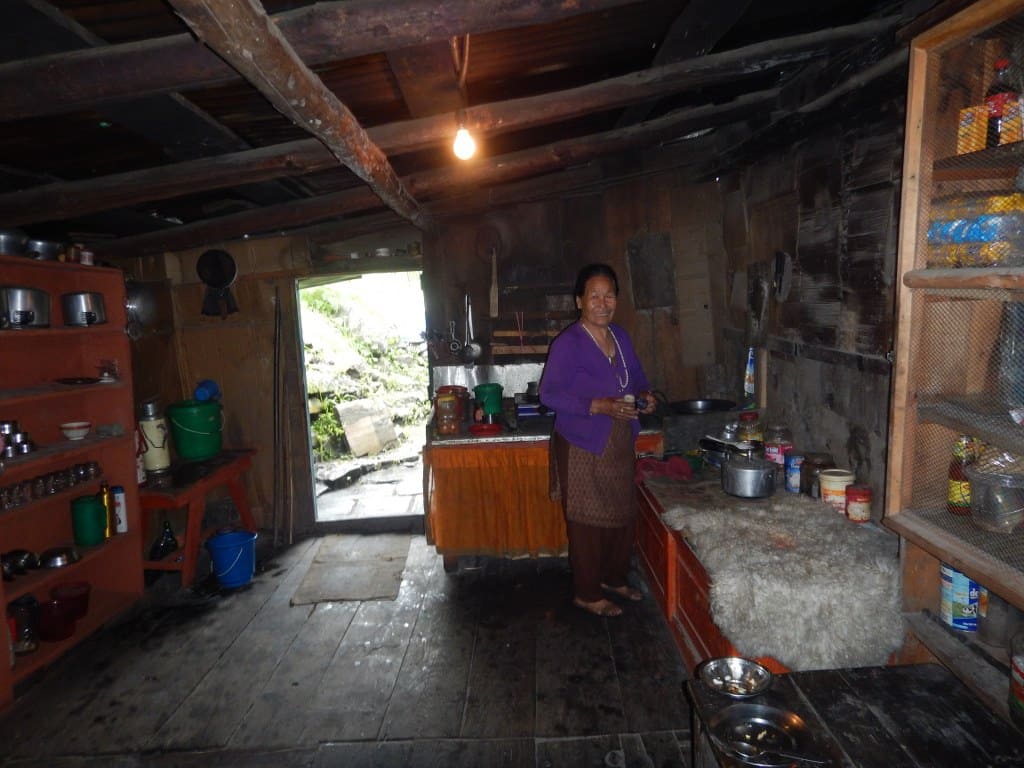 Rond 17.00 uur komen we aan bij onze Guesthouse/hotel. Nilgiri Guest House & Restaurant, zie ook: www.wijhebbengeenwebsiteindebergenvannepal.com. We mogen even gebruik maken van de “Bath-Room”, helaas geen warm water…. Na zo’n zware dag, en je benen vol modder, zou een lekkere warme douche wel welkom zijn, ook voor de reuk trouwens! Tja, tis nie anders. We kunnen ons wat opfrissen en dat is ook genoeg ook. We hebben een zeer primitief kamertje, geen elektriciteit en water. Twee planken met een matrasje er op en een eigen gat in de kamer, oftewel wc….. We mogen ’s avond bij deze familie in de keuken mee eten. Echt een hele leuke ervaring na een pittige dag. We gaan lekker rond 21.00 uur plat. Vandaag was de zonnebrand en zonnebril niet echt noodzakelijk.