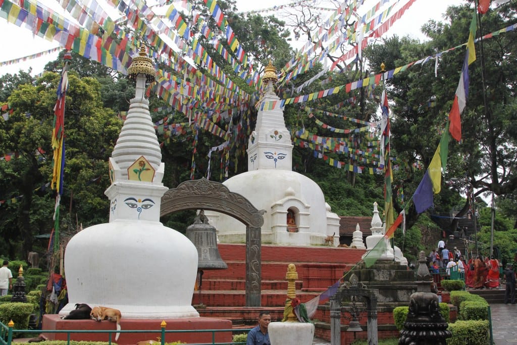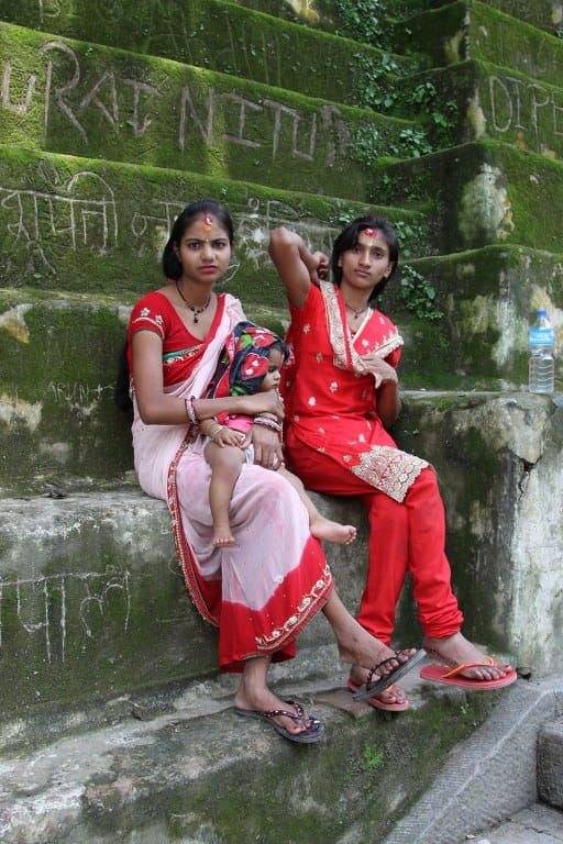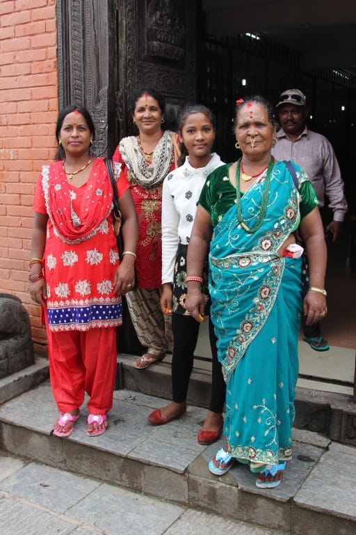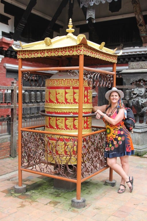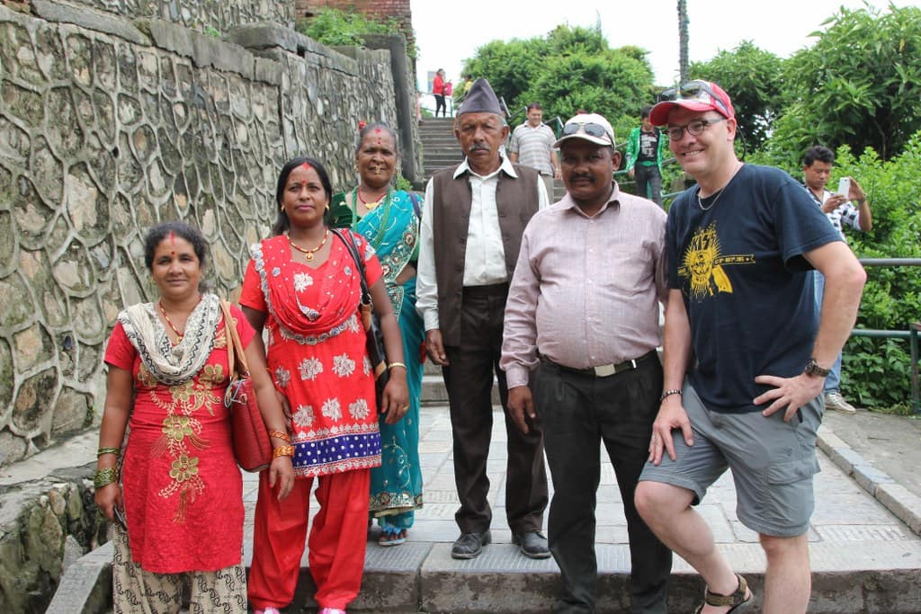 25 juli: Goedemorgen, onze laatste ochtend in Kathmandu. Na het ontbijt checken we uit, de taxi en onze gids (Binod) staan al klaar voor ons. We bezoeken eerst de Swayambu Temple ook wel Monkey Temple genoemd, dit omdat er vele apen rondhangen. We hebben hier een prachtig uitzicht over Kathmandu Vallei. De kleuren op de beelden komen door het offeren van bloemen, fruit, pigmenten e.d. Overal bij de tempels zijn 108 gebedswielen aanwezig, door aan de 108 wielen te draaien heb je de mantras gebeden. In gids bij hebben heeft zo zijn voordelen, wij wilde graag deze mooie en kleurrijke mensen op de foto zetten. Binod helpt ons een handje. Daarna wilde deze Nepalese mensen met ons op de foto. Hun waren een dagje uit en kwamen zo’n 200 km van Kathmandu vandaan, voor hun is het erg bijzonder om deze Monkey Temple te bezoeken. Daarvoor hebben ze hun mooiste kleren aangedaan.