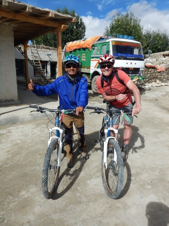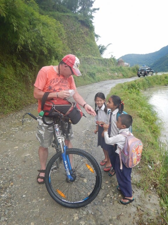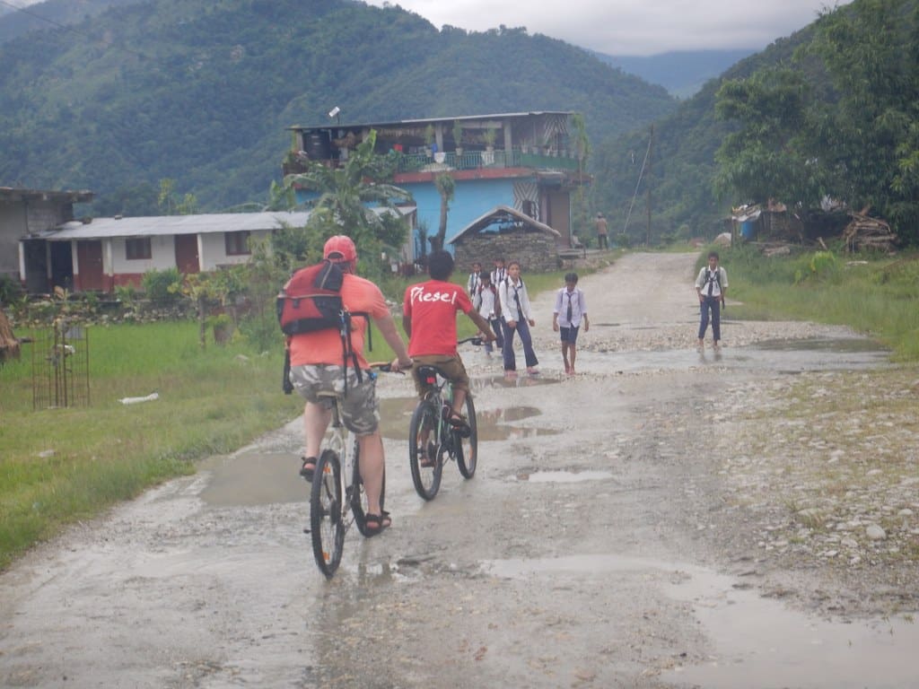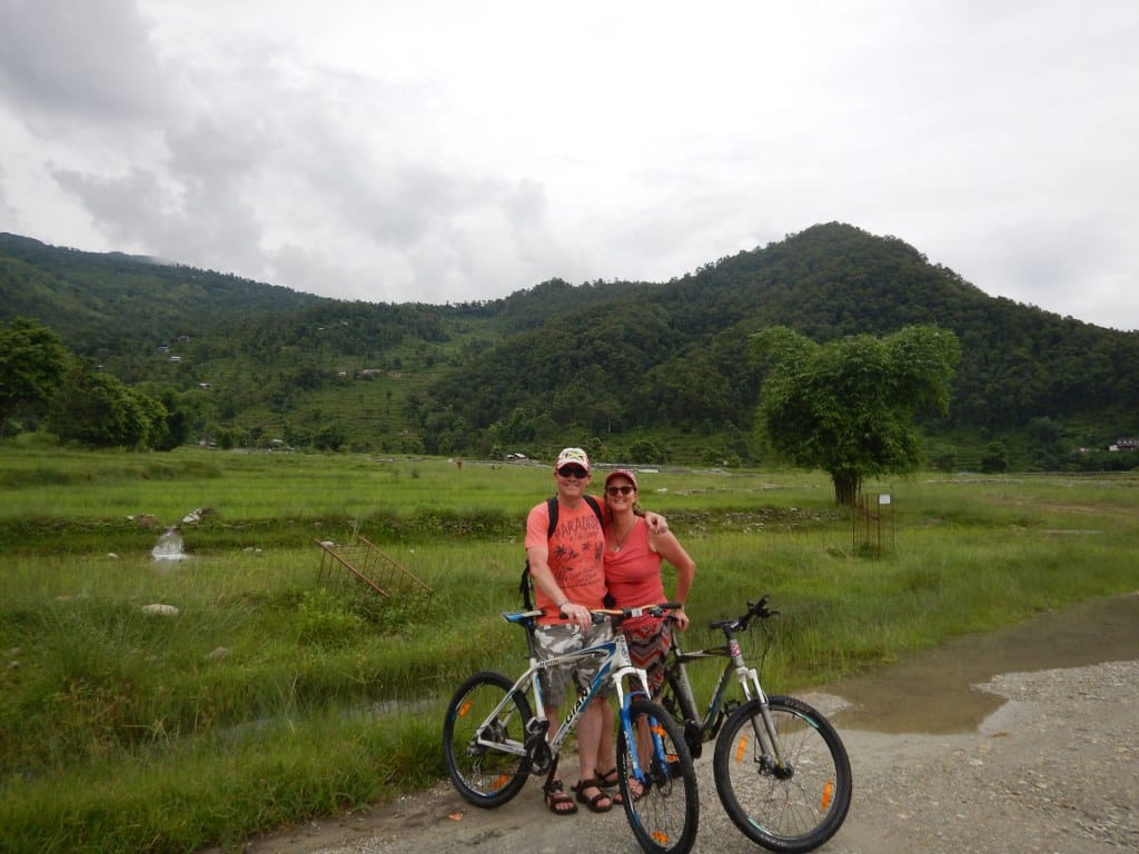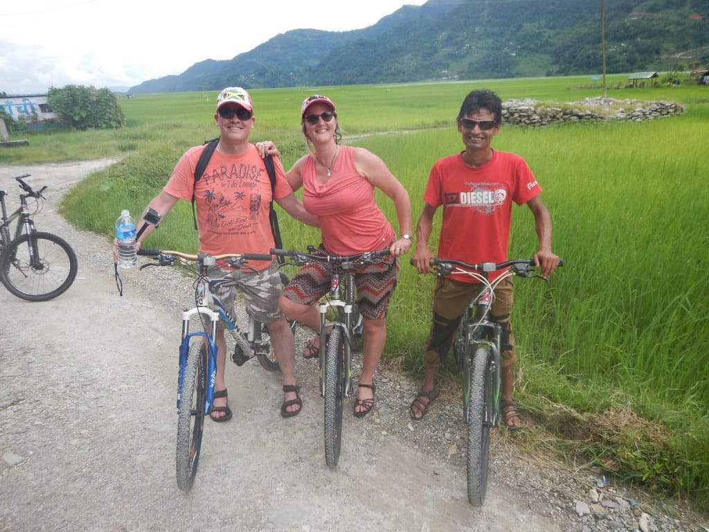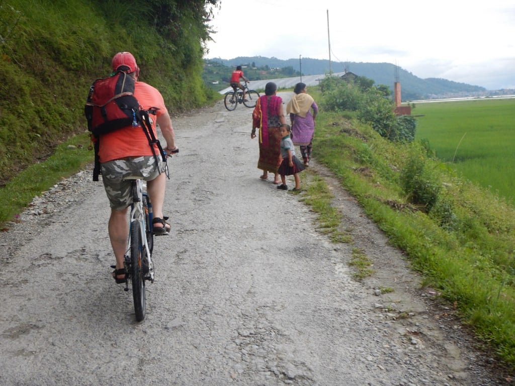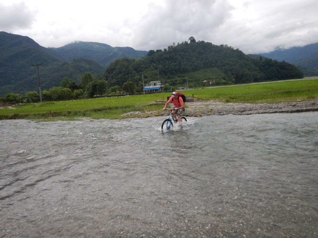 Aangezien we na de Mustang-trekking nog een aantal activiteiten in Pokhara gepland hebben staan, besluiten we het Mountainbiken naar voren te halen en dit deze middag te gaan doen. Hapje eten, want ook dat is er allemaal een beetje bij in geschoten. Daarna Mountainbikes ophalen en gas er op. We rijden/crossen door het buiten gebied van Pokhara. Kleine dorpjes, heuveltjes en rivieren doorkruisen. Vele rijstvelden en we zien hoe ook de schoolkinderen de rivieren moeten trotseren om van- en naar school toe te gaan. Erg leuke tocht en zeker een aanrader als je in Pokhara bent.