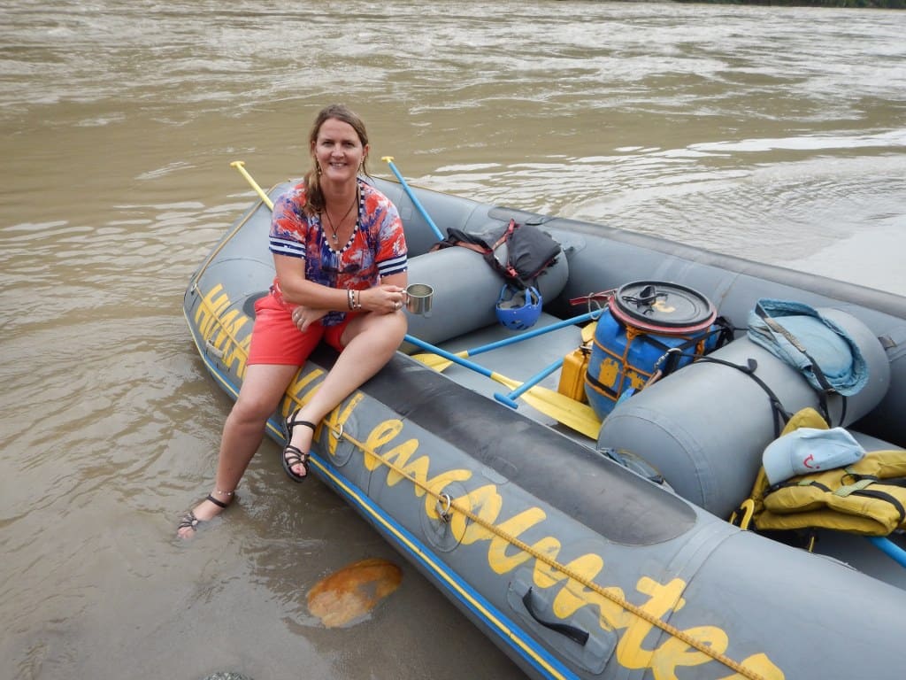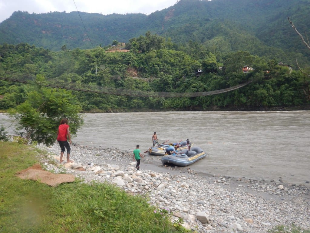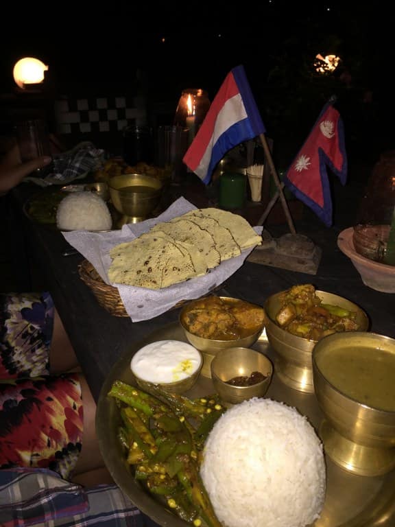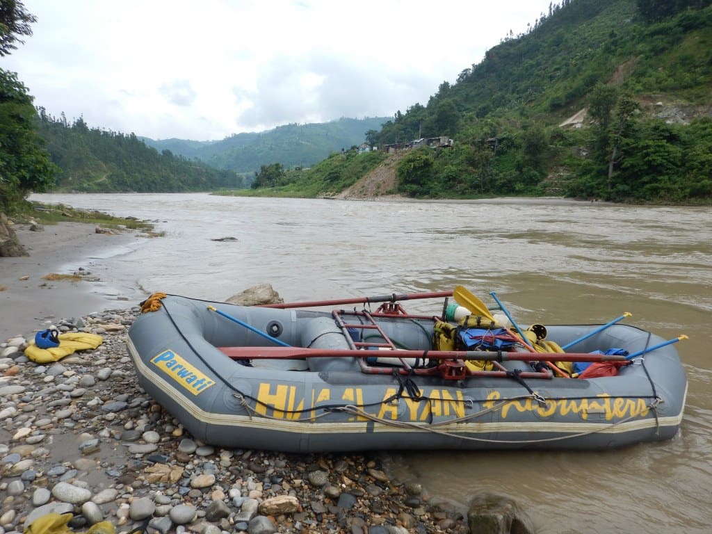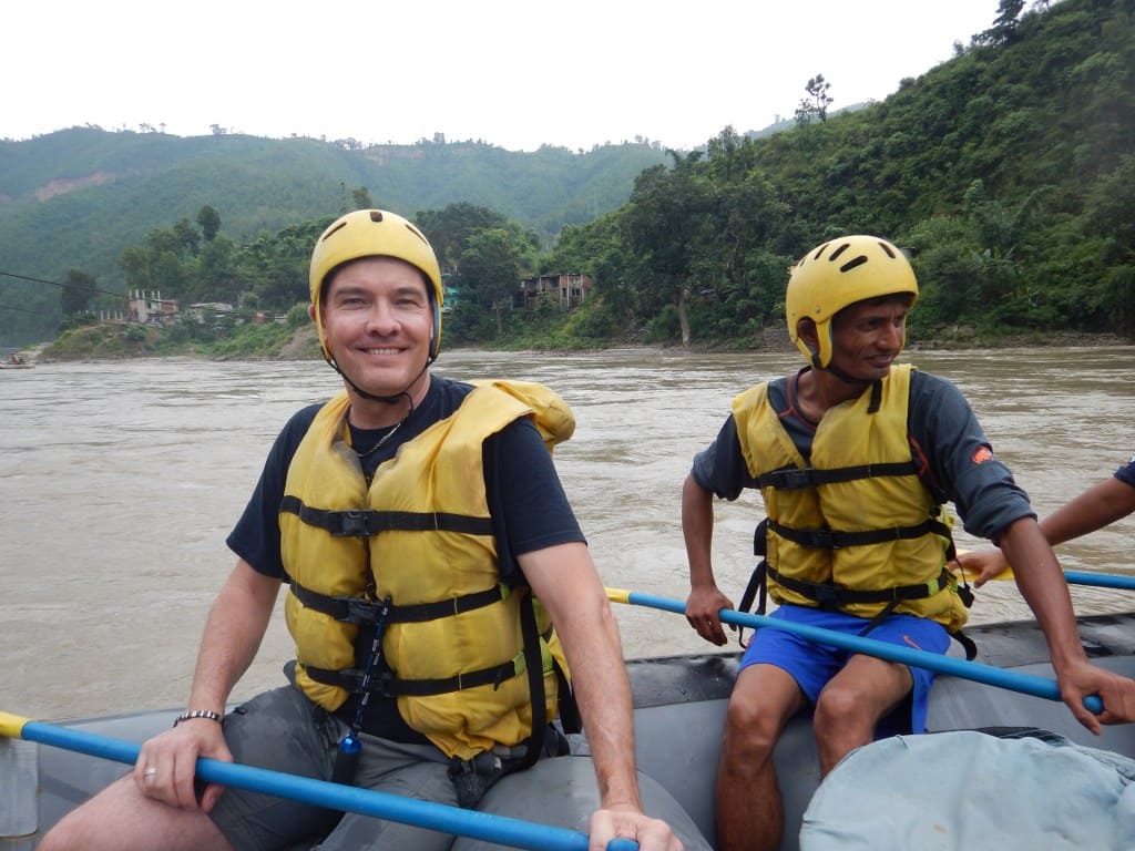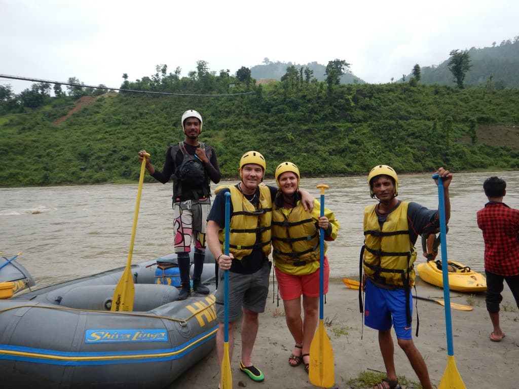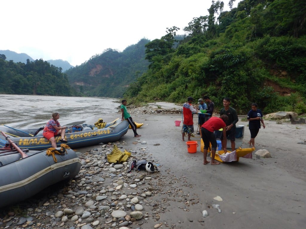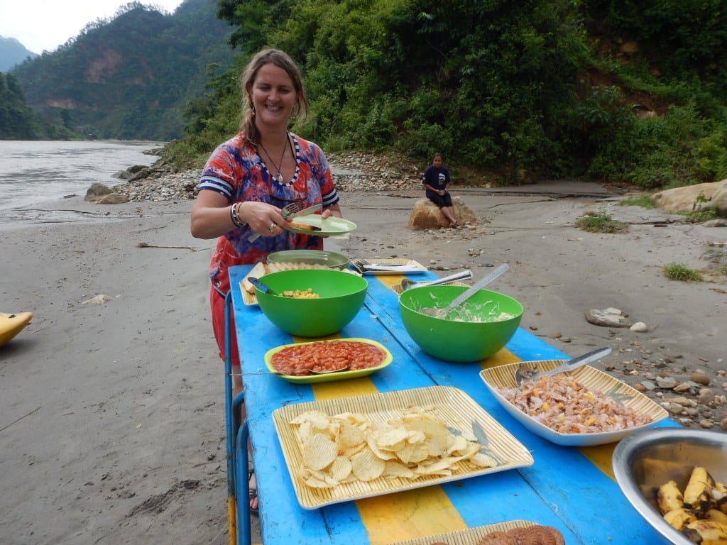 We zijn met de rafting ongeveer 4 uur onderweg, halverwege hebben we een geweldige picknick. Er wordt voor ons een heerlijke en verse lunch klaar gemaakt aan de oever van de rivier. Tafel, borden, bestek e.d. wordt meegenomen voor ons. Voor een dergelijke rafting moet je minimaal met zes zijn echter wij zijn maar met zijn twee, Maxim heeft een aantal extra Nepalezen geregeld voor ons. Een uitje dus voor een paar jongens. Met ons nog een kleine kano, mocht er iemand uit de boot vallen. Daarbij een complete extra raftboot voor hulp en de lunch. Kortom, een heel team in actie om twee Nederlanders over de Trishuli rivier te laten raften. Het is een serieuze rafting want we maken stevige stroomversnellingen mee, droog blijven is er dan ook zeker niet bij. Geen probleem want het weer is goed. We hebben een overheerlijke en verse lunch aan de oever!