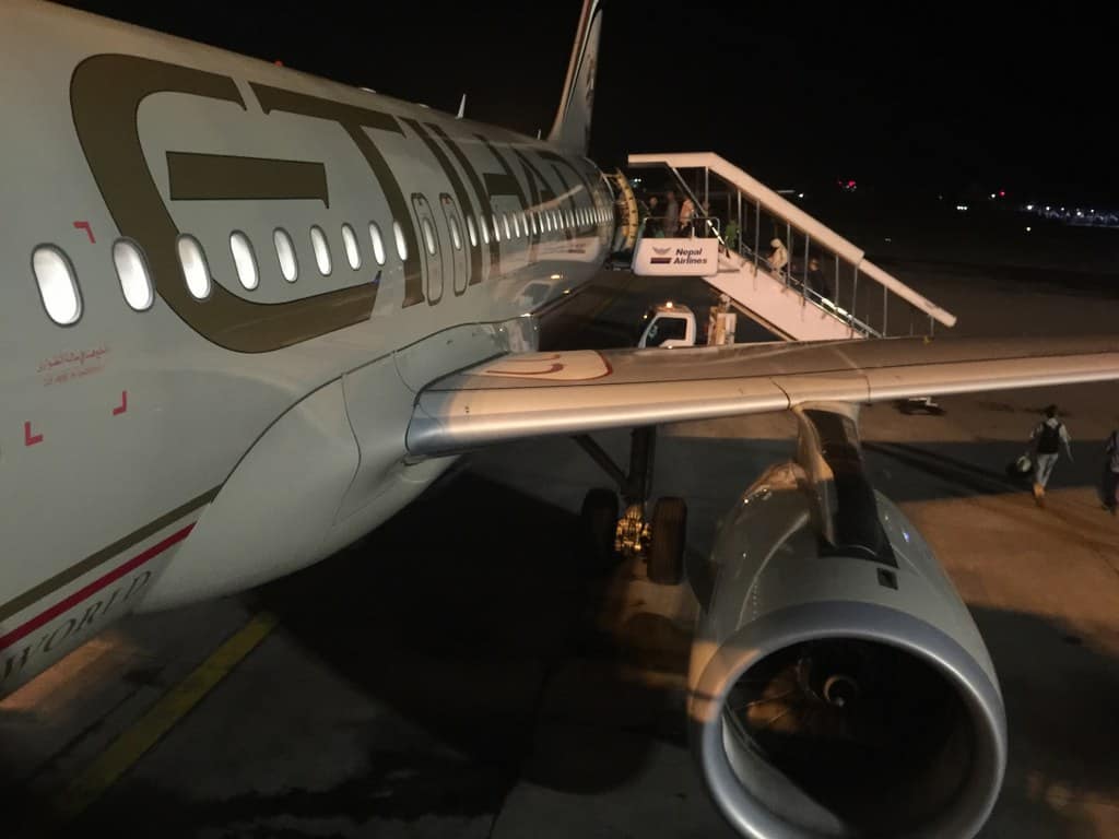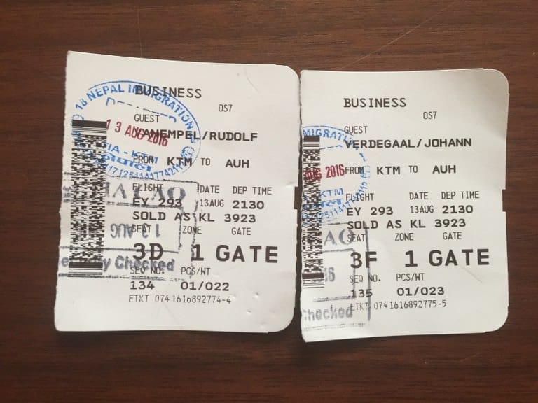 Aan alles komt een einde dus ook aan ons Nepal avontuur. We gaan nog even opfrissen en een theetje drinken bij Laxmi en Maxim thuis, daarna is het rond 19.00 uur tijd geworden om afscheid te gaan nemen van dit prachtige land. Op naar de Airport van Kathmandu. We vliegen met Etihad naar Abu Dhabi maar een online check-in is hier niet mogelijk, dus hopelijk nog twee stoeltjes naast elkaar vrij? Niet het geval dus moeten ze improviseren, uiteindelijk wordt er besloten om ons in de Business class onder te brengen. Rood portje, drie gangen menu enz enz. We worden verwend door Etihad. Wat een ruimte, genieten om zo te vliegen. Rond middernacht komen we aan in Abu Dhabi, lokale tijd, voor ons is het inmiddels al later. Omstreeks 02.00 uur stijgen we weer op, op naar Schiphol met de KLM. Vliegtuig zit ramvol, ff iets anders dan het eerste deel van onze terugreis. Truste vanuit de lucht.