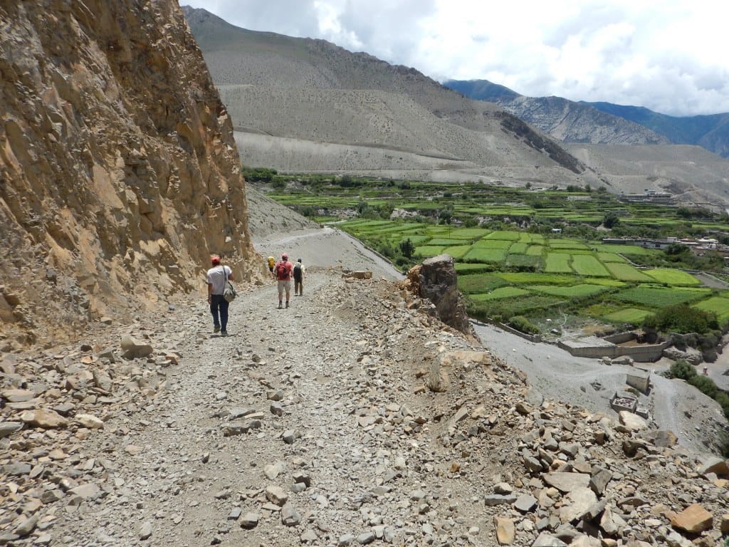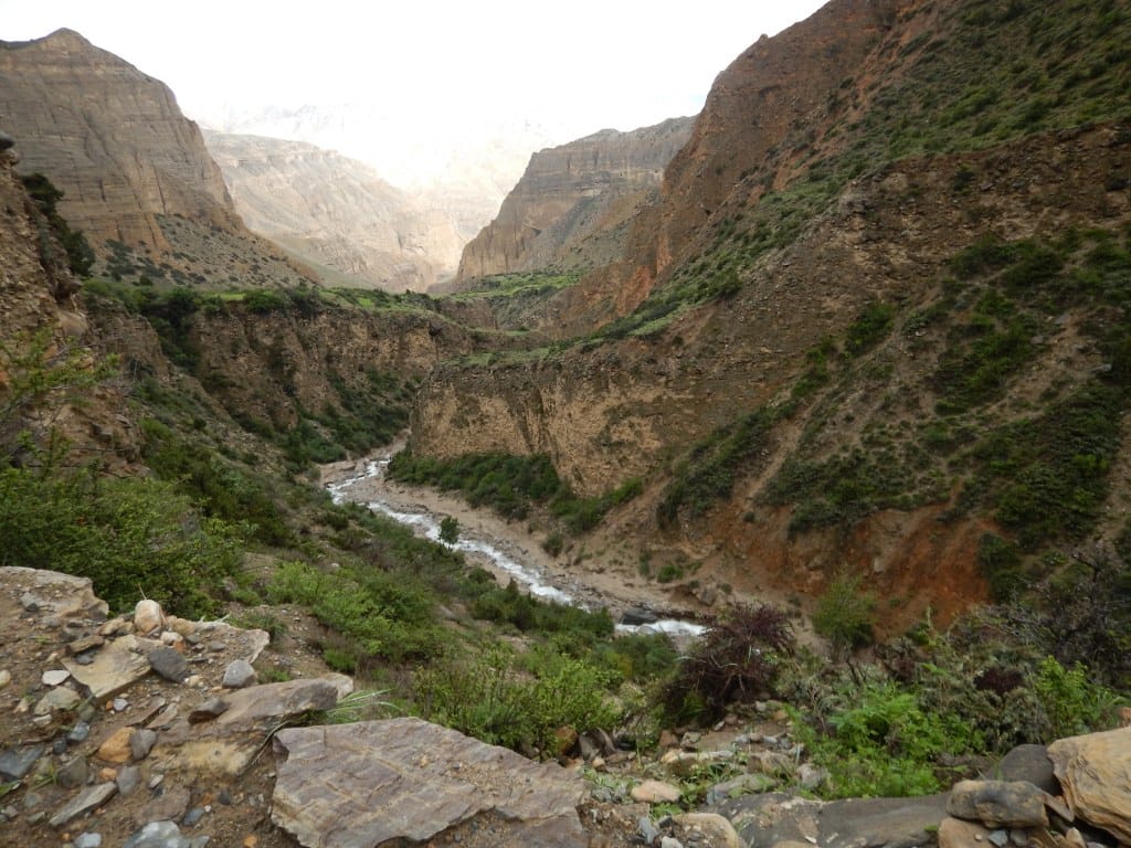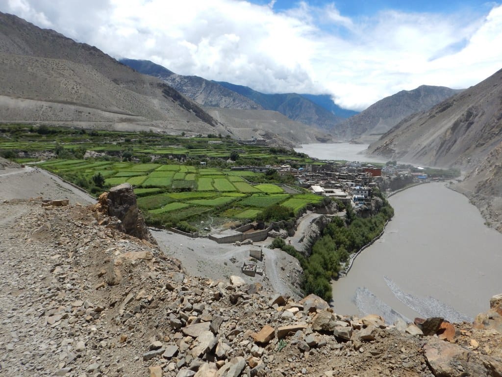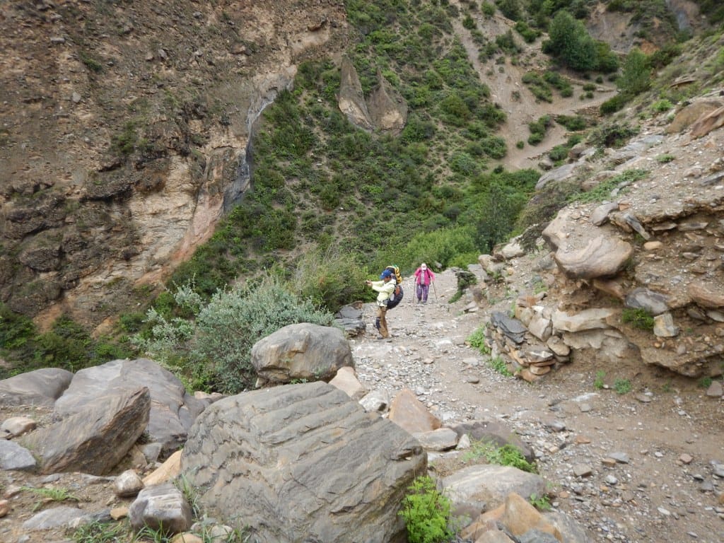 29 juli: Goedemorgen Tatopani. Vroeg eruit, ontbijten en wegwezen. We moeten te voet want verkeer vanuit Tatopani naar Jomson is niet mogelijk vanwege het weer. Gelukkig heeft Binod een drager voor onze spullen kunnen regelen, die loopt met ons mee tot Ghasa. In de hoop dat we vanaf daar met de bus/auto verder kunnen. We passeren weer prachtige piepkleine bergdropjes, watervallen enz enz. Wat dat betreft is overland wel gaver als via de lucht.